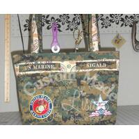 This is a med/large purse made from military camo and patriotic theme fabrics. Comes with custom name tapes, your choice of two embroidery designs, top zipper closure, and inside zipper pocket.