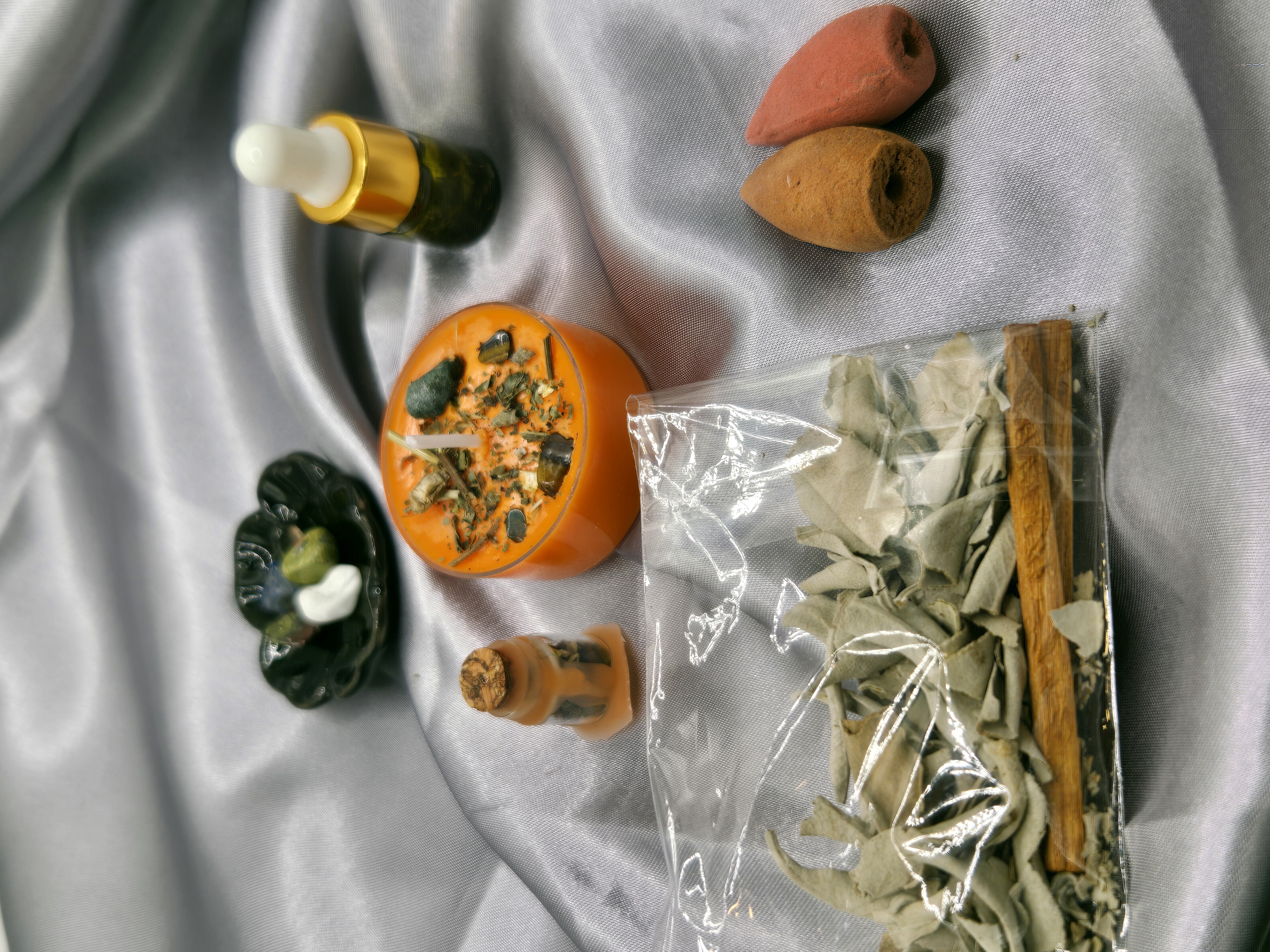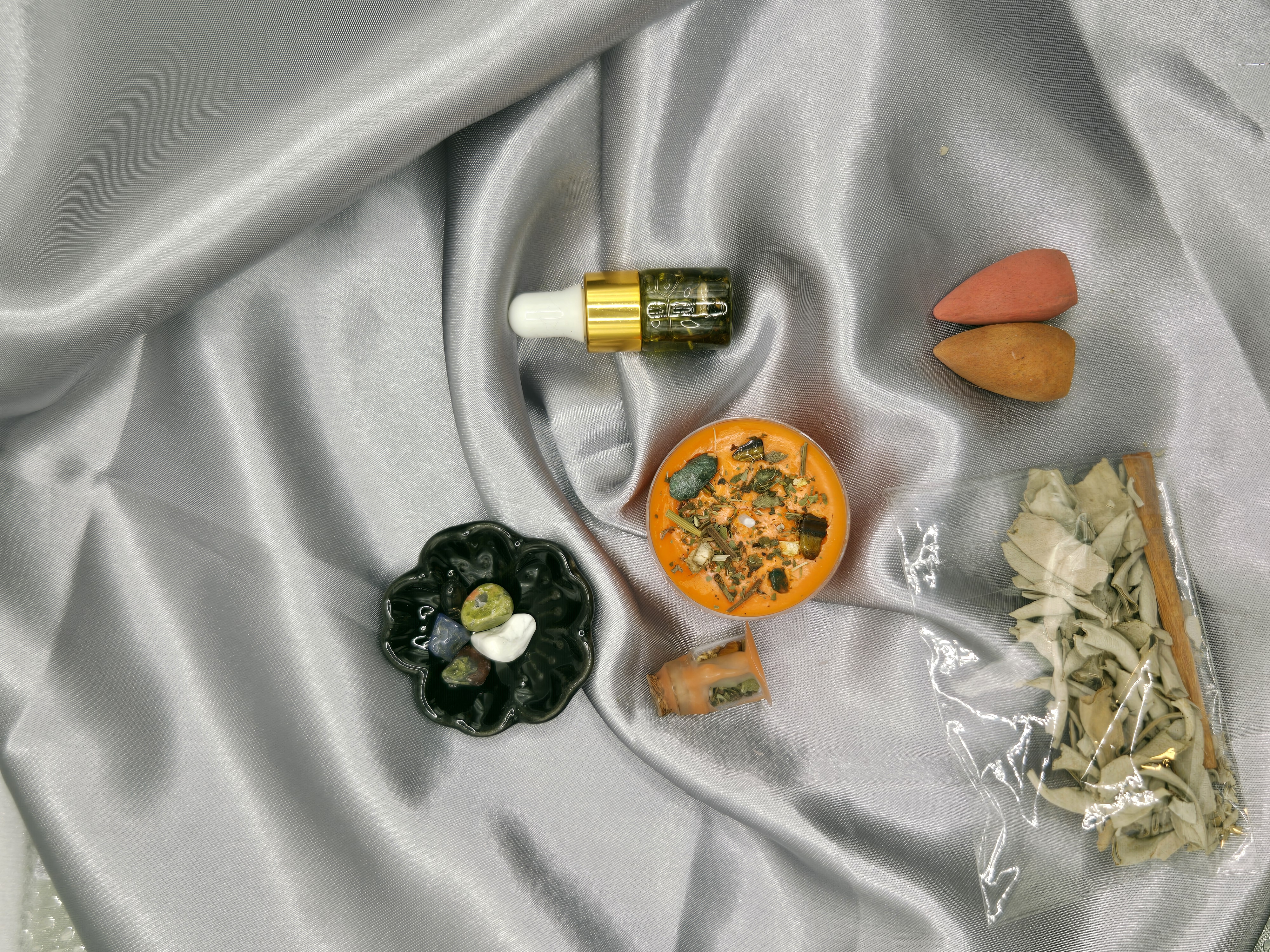 Includes: Candle • Moss Agate & Tiger’s Eye • Sandalwood sticks • Loose sage • Spell jar • Incense cones • Affirmation card • Anointing oil
