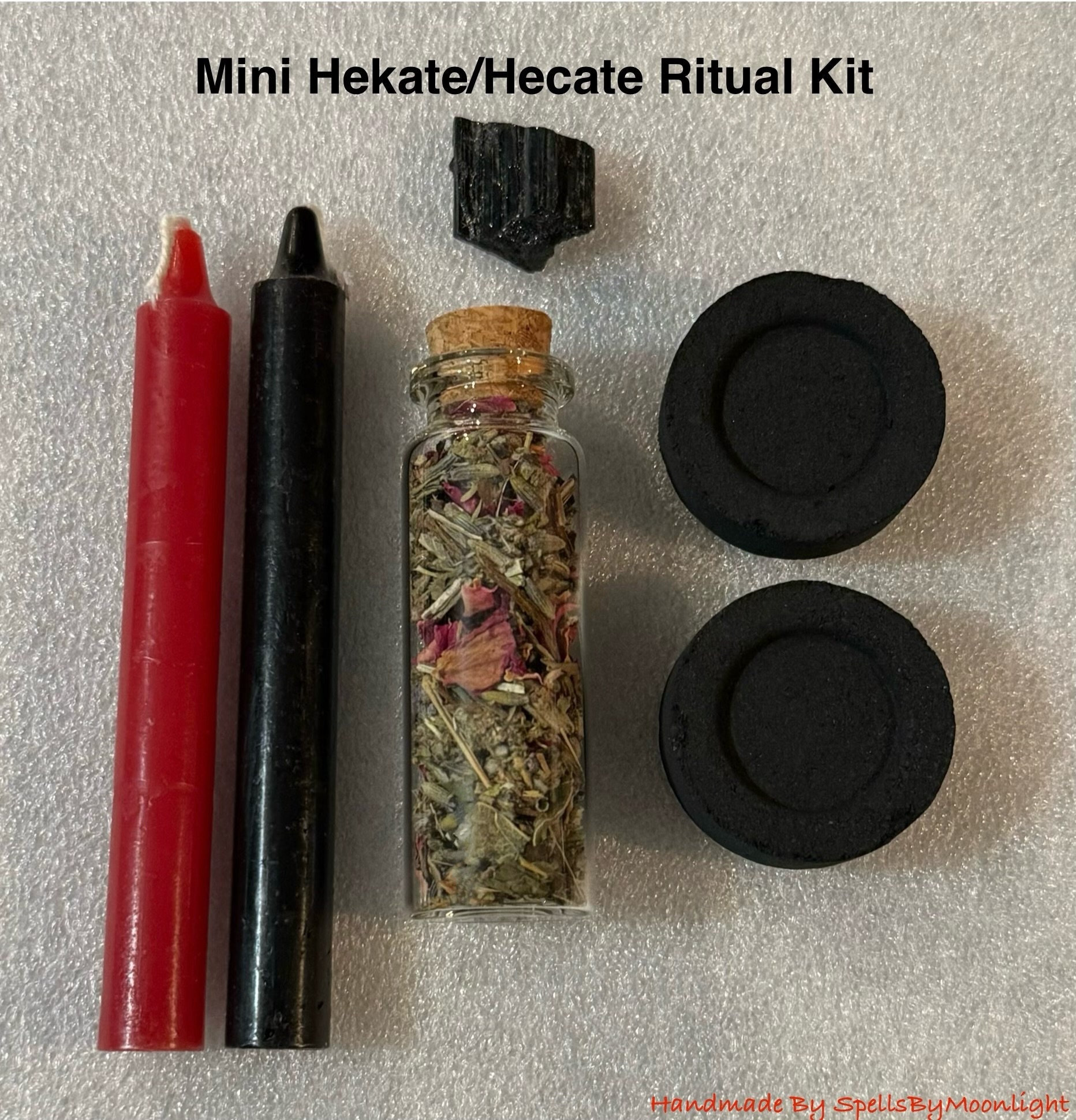 I created this Mini Ritual Kit to help you connect with and invoke Hekate/Hecate! It comes with One Mini Red Handmade Chime Candle, One Mini Black Handmade Chime Candle, One 15ml Bottle of Hekate/Hecate Loose Herbal Incense, Two Charcoal Discs, and One Mini Piece of Black Tourmaline. Light your charcoal Discs so they can start heating up. Next place the Black Tourmaline in front of the Two Candles and light the candles and put some of the Incense on your Charcoal Discs. Take this time to speak your intentions to Hekate/Hecate and connect with her