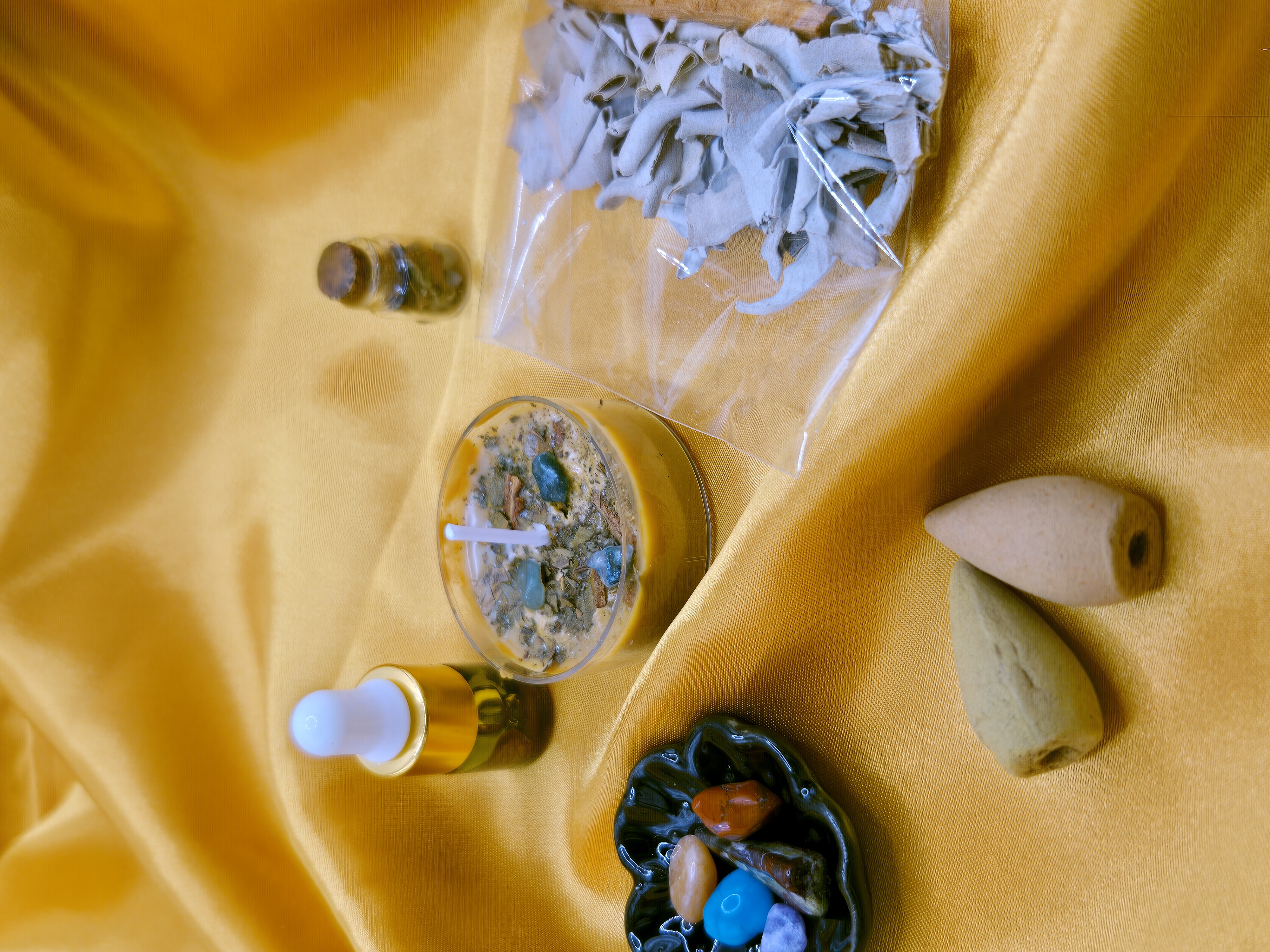 Includes: Candle • Green Aventurine & Moss Agate • Sandalwood sticks • Loose sage • Spell jar • Incense cones • Affirmation card • Anointing oil
