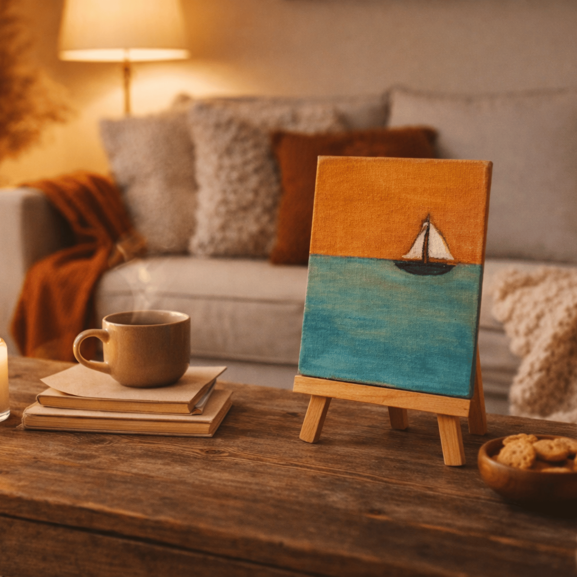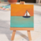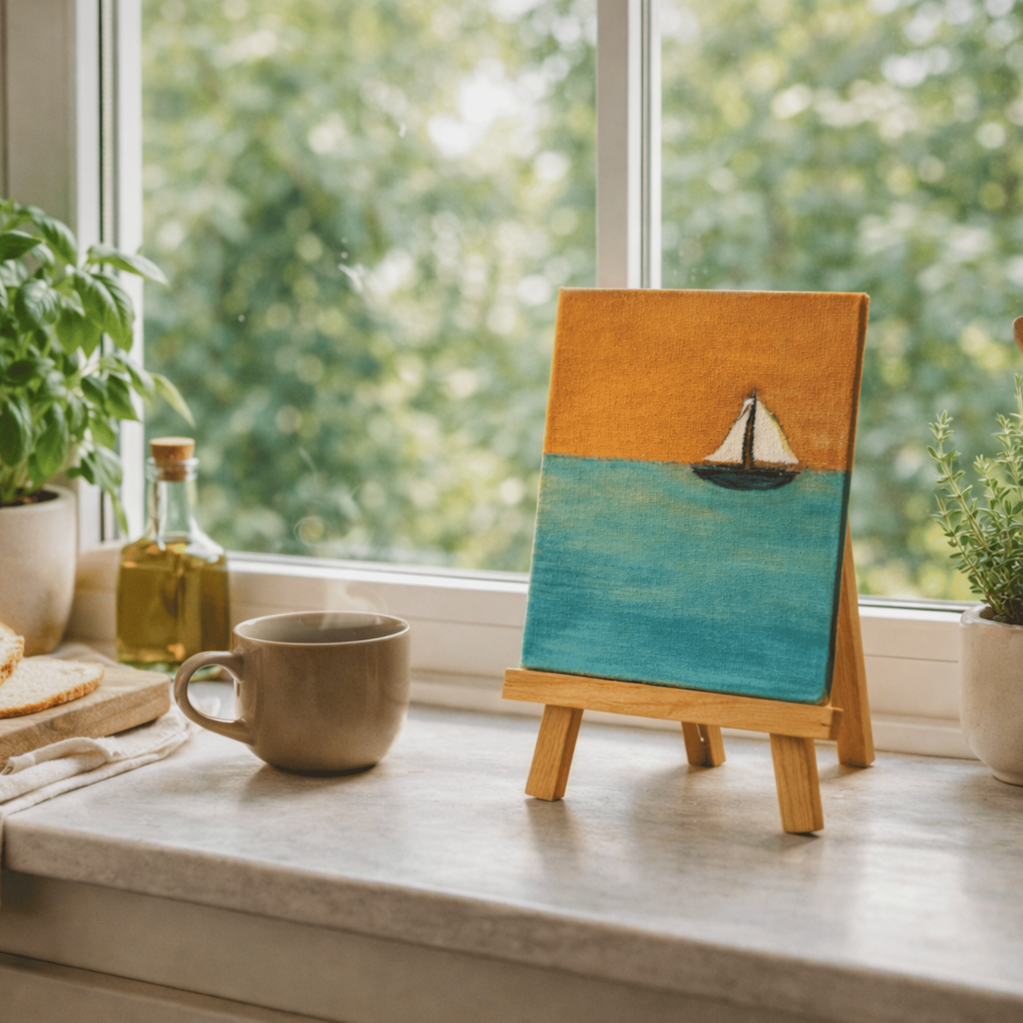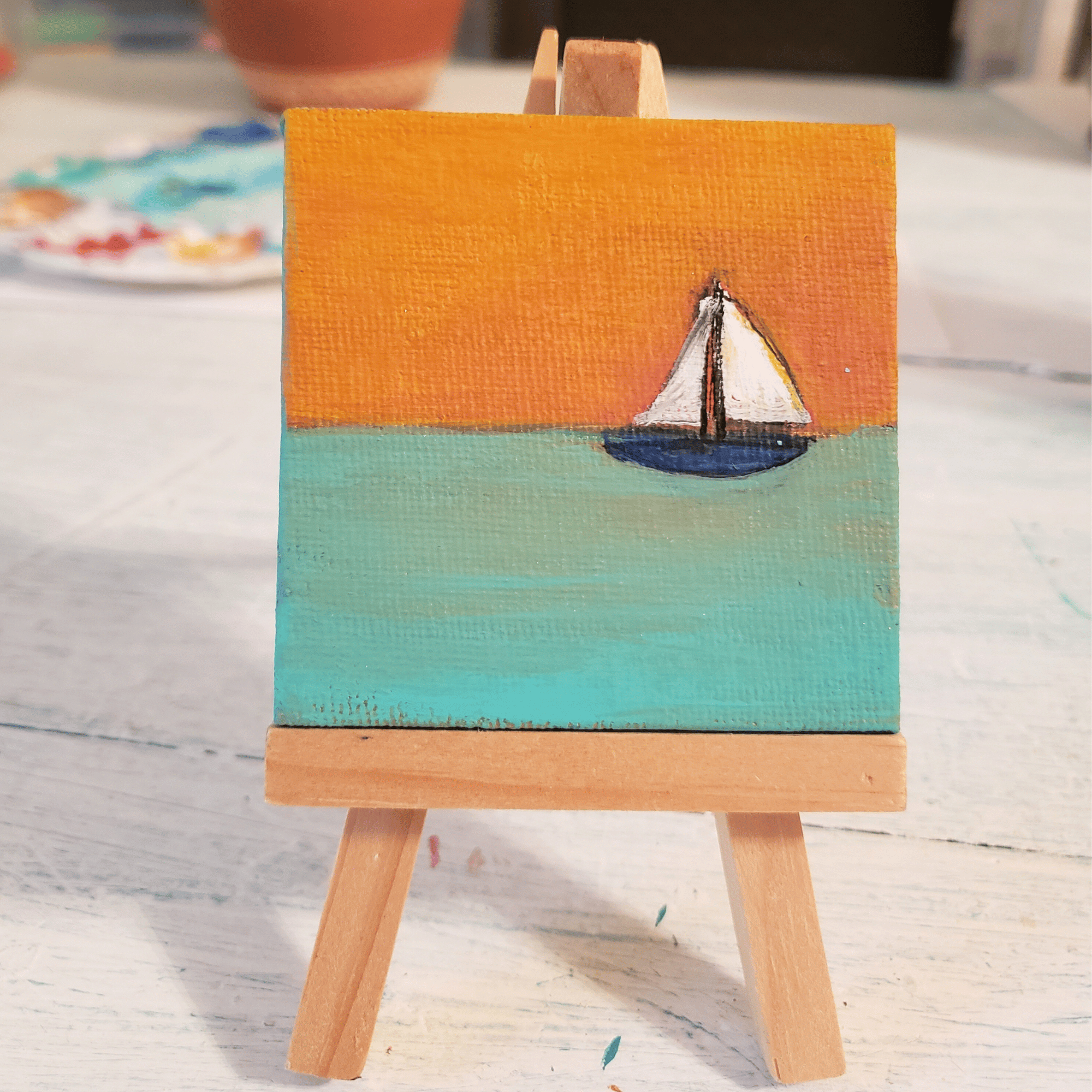 This tiny coastal treasure features a hand-painted sailboat on a 2.5 x 2.5 inch canvas. Each piece is created with acrylic paint and comes with its own mini wooden easel—perfect for displaying on a shelf, desk, or sunny windowsill.