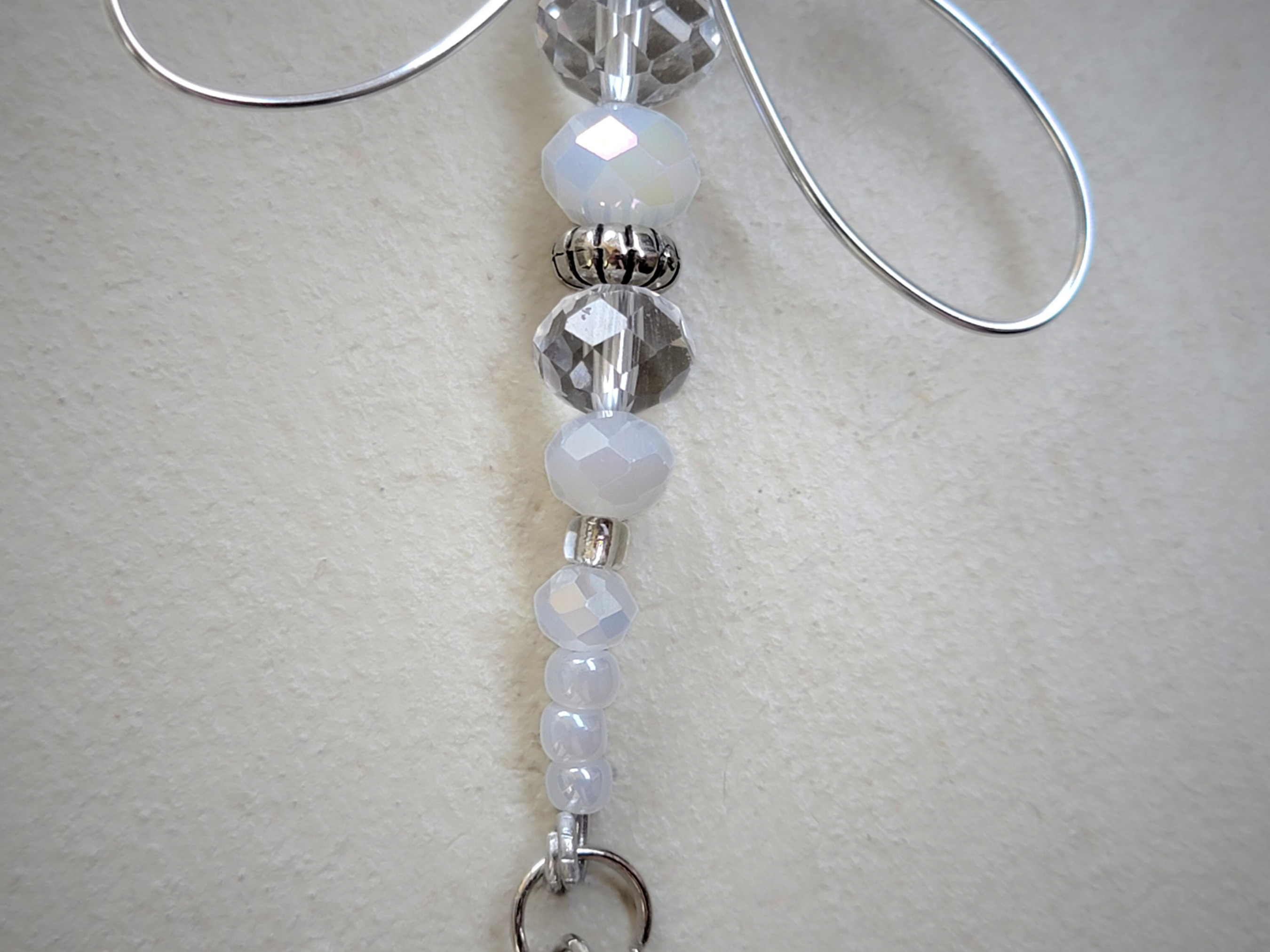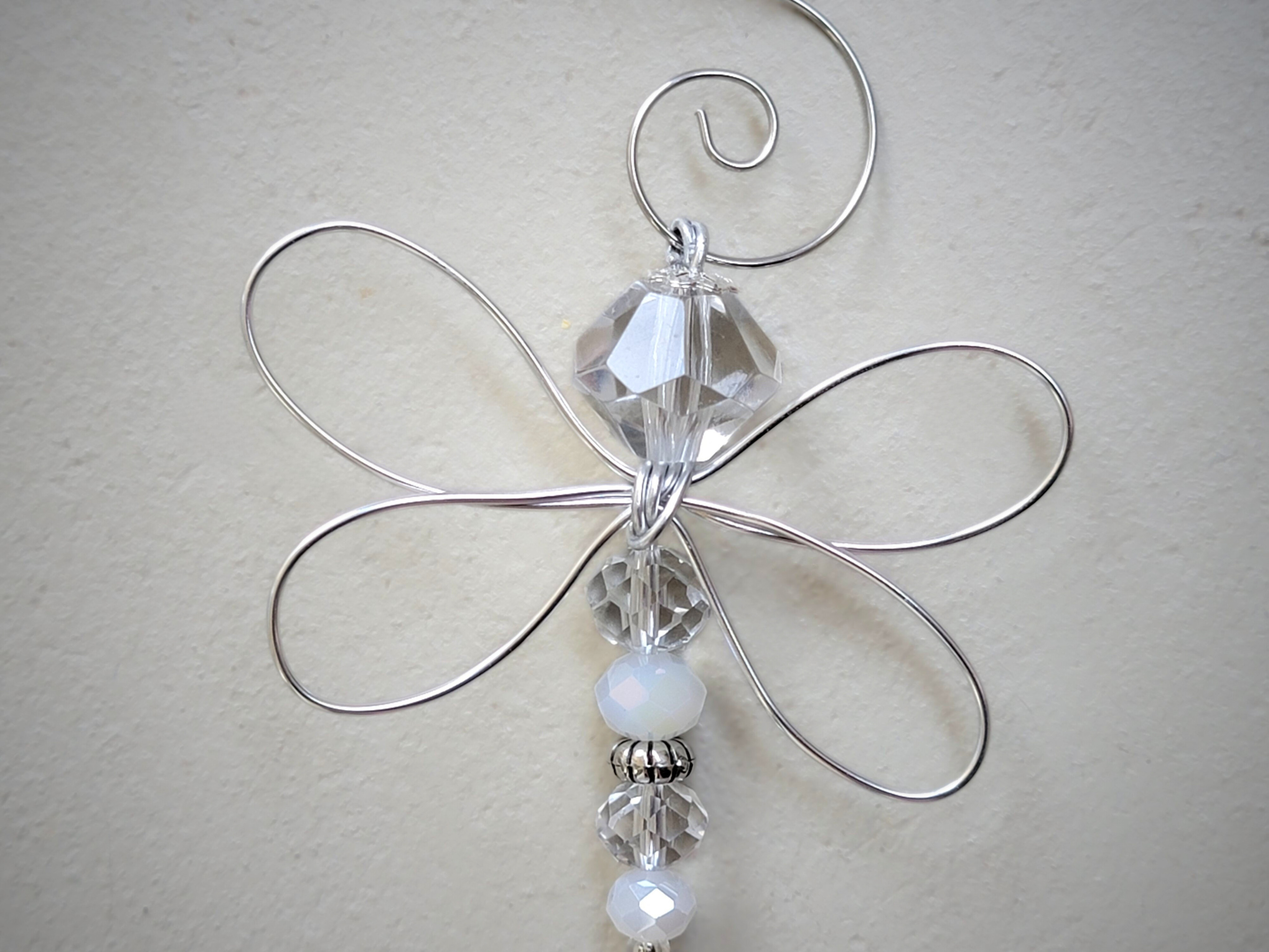 Each dragonfly is shaped by hand from a single piece of wire, measuring about 12–24 inches. Beads are added to form the body and head, the wings are shaped once beading is complete, and a small charm is attached at the base. A hanger is placed at the top loop for easy display. Like many of my pieces, the bead design often shifts partway through, making every finished dragonfly a surprise—even to me.