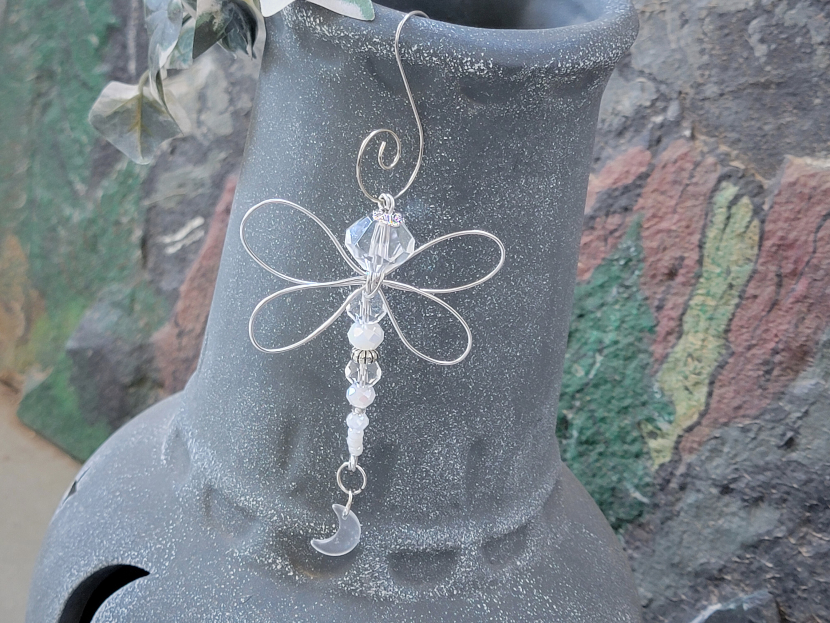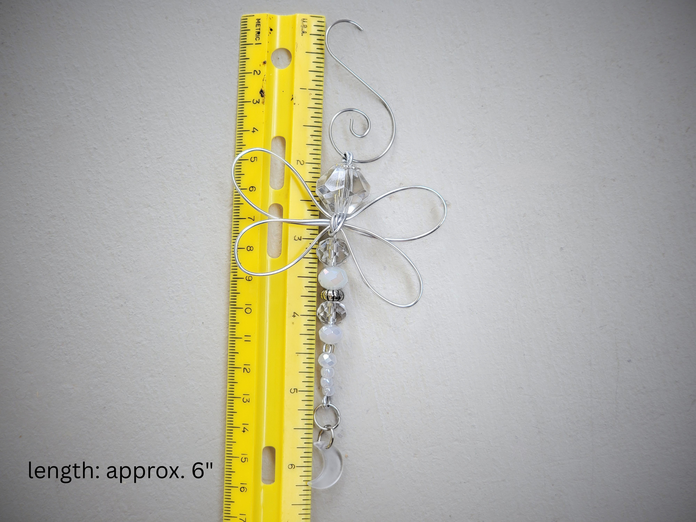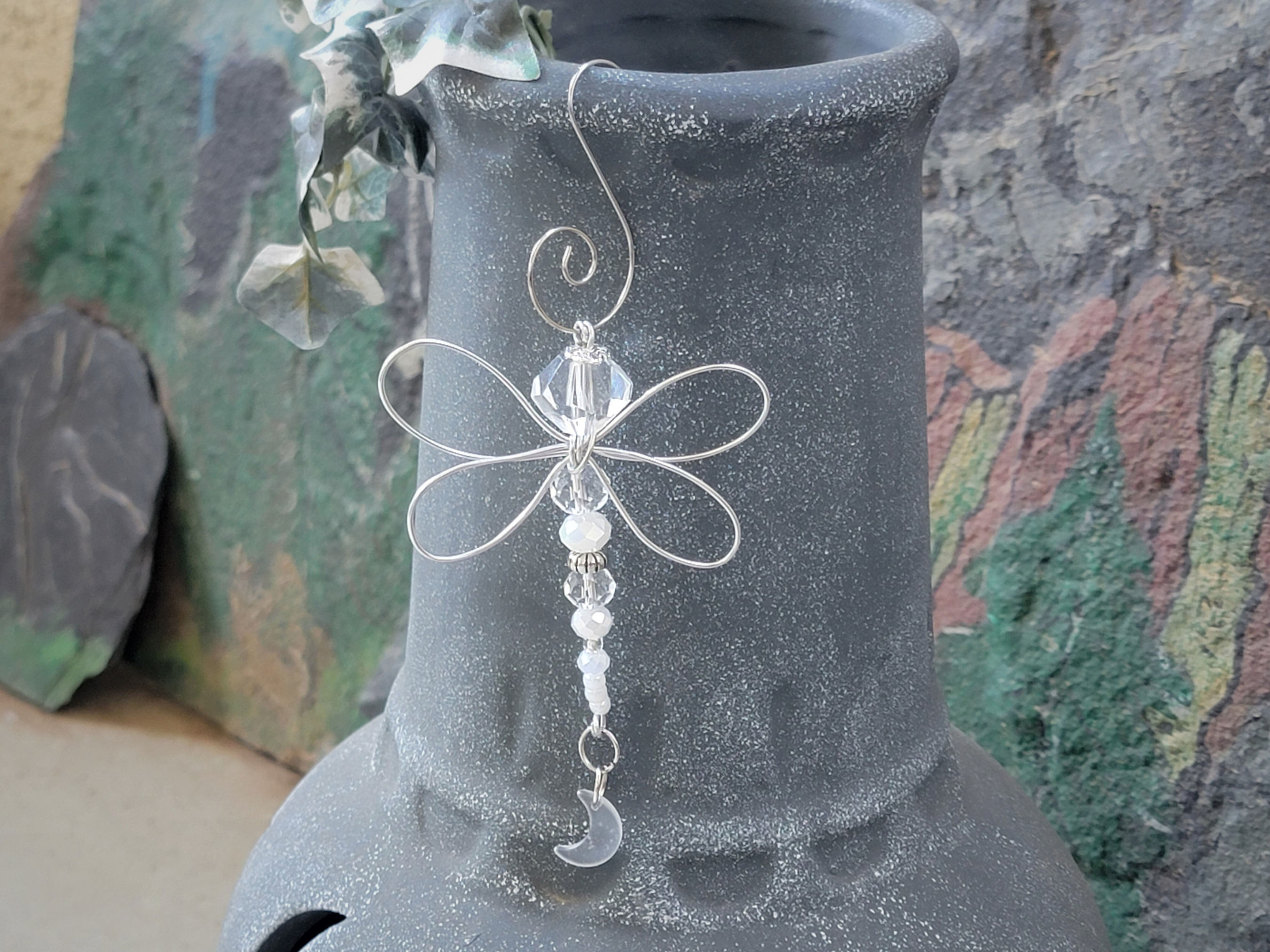 This minimalist dragonfly ornament is crafted with wire, beads, and a subtle celestial charm, inspired by the quiet beauty of nature. Designed to hang easily in your home or garden space, it adds a gentle, thoughtful accent without overwhelming your décor.