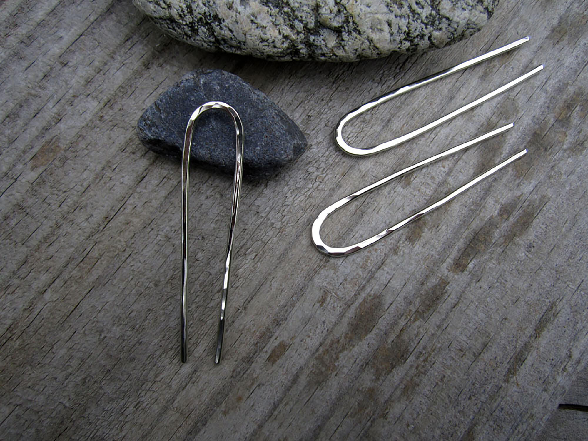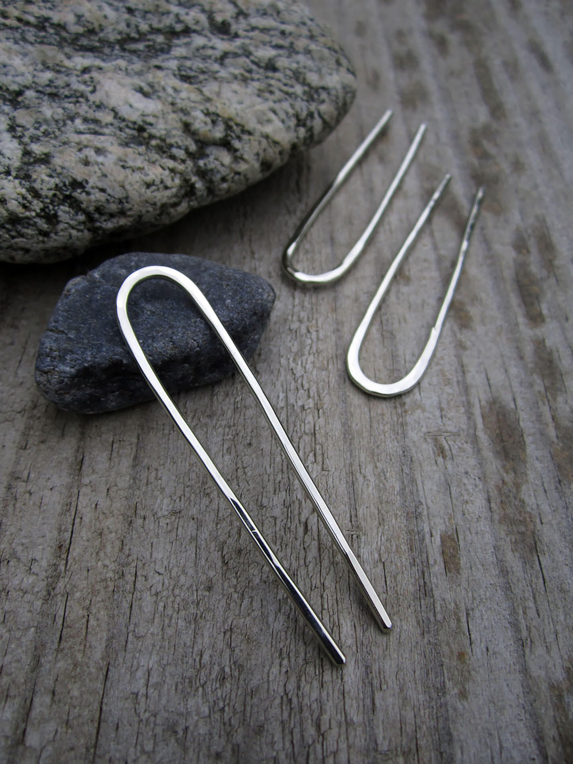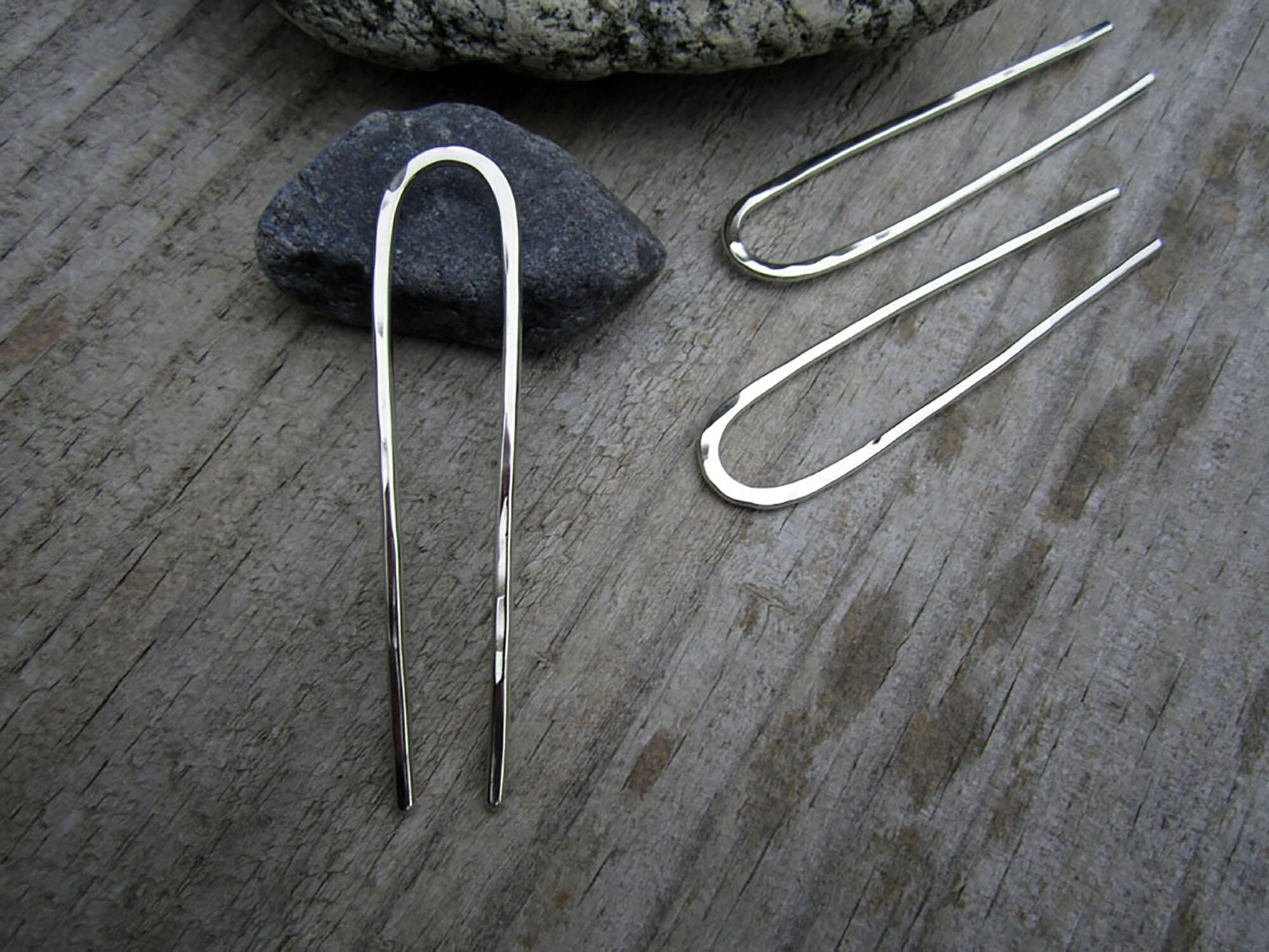 They are cut, bent, then hammered into their shape...In the minimalist style. The hammering I do is called Chasing. As I am hammering, it tempers the metal (making it stronger to hold the shape), and it also shapes the form. I do bend them first, but ultimately the hammering creates the curve.