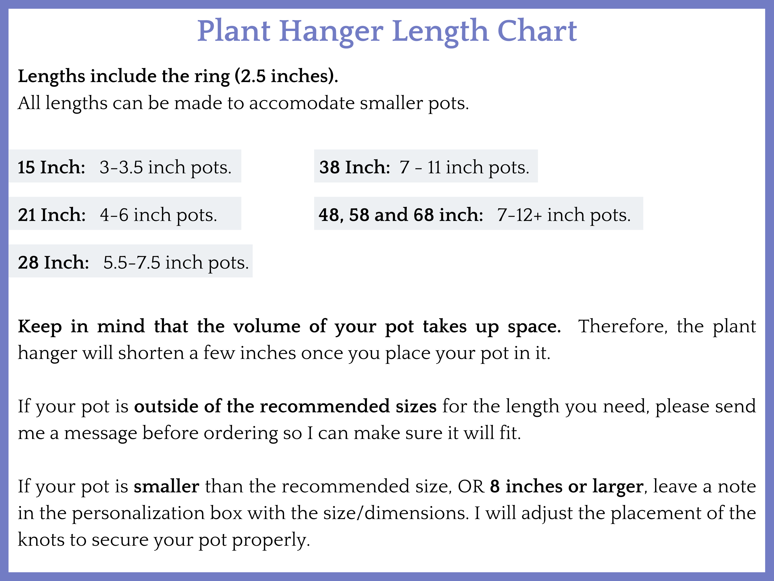 All lengths can be made to accommodate smaller pots, just leave me a note in the comment box at checkout with your pot size so I can adjust the placement of the knots.