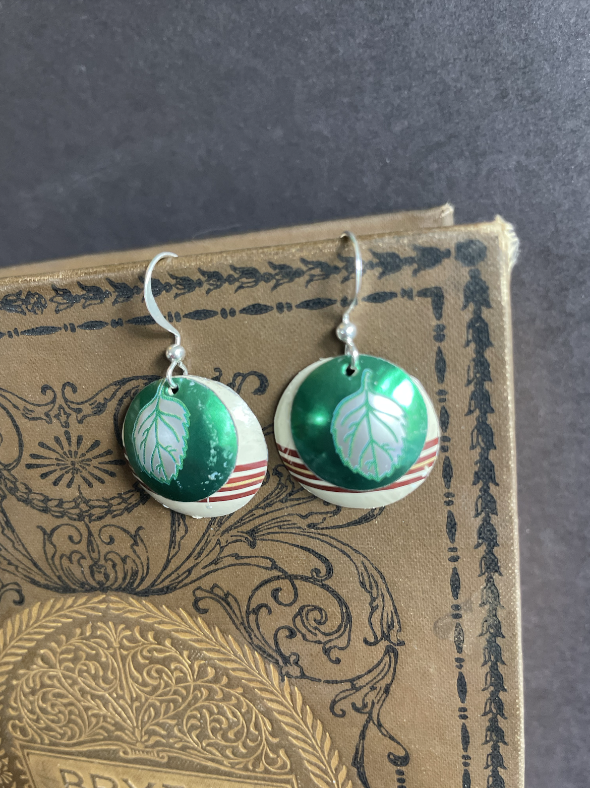 Tins are very light, making them ideal for earrings as they don't weigh down your ears as the day goes on. Did you know the proper term for working with tin is "tinkering"? That made me really happy. I literally tinker in my art studio. I use old cookie tins, tea tins, and the like, break them down, and hand cut them into shapes and hand-hammer them into the 3-D shape I want them to be, finish and polish them, before putting them together like any other jewelry.