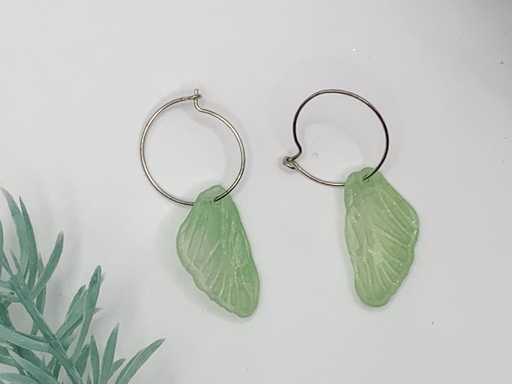 Whimsical and fresh! These translucent mint-green fairy wing charms dangle from sleek hoops for a magical, nature-inspired look.