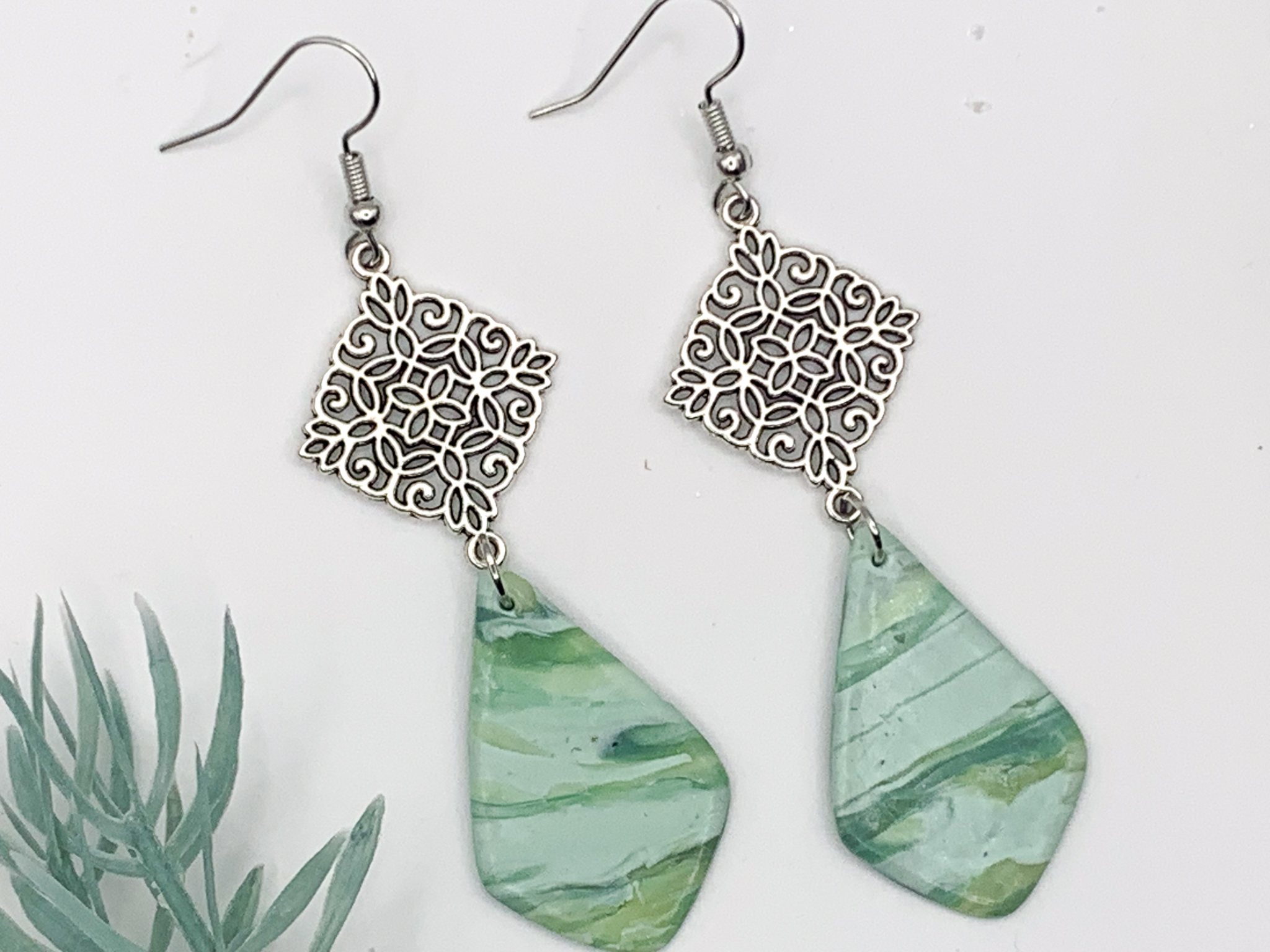Delicate and bold! These green marbled clay earrings feature ornate silver filigree connectors for a sophisticated finish.