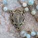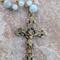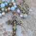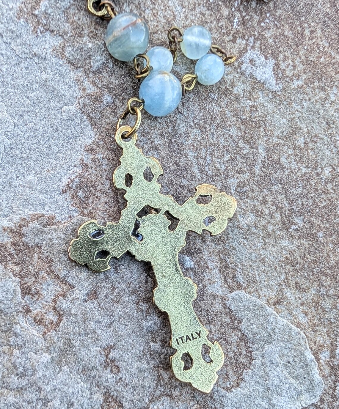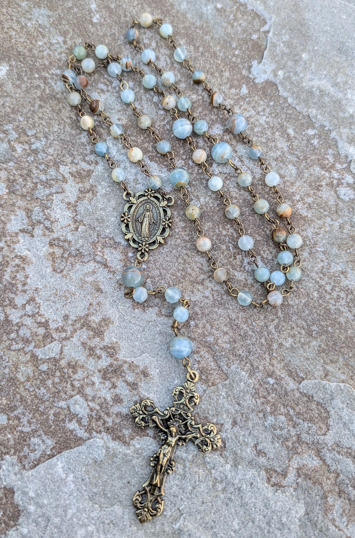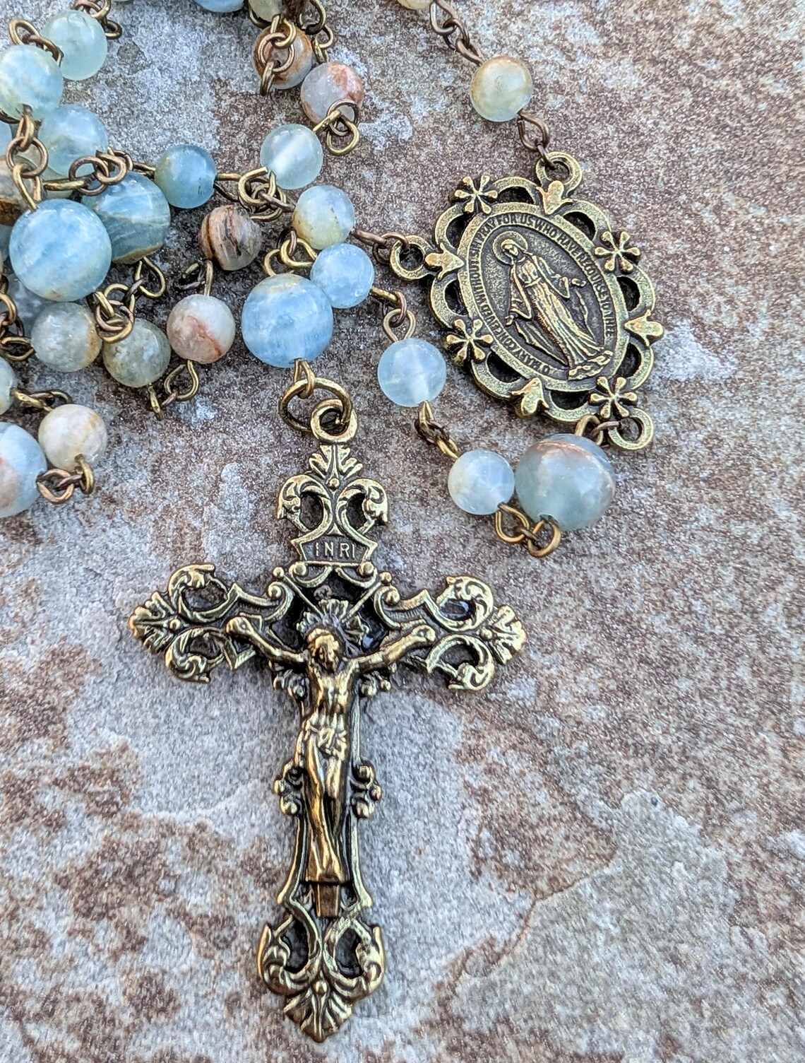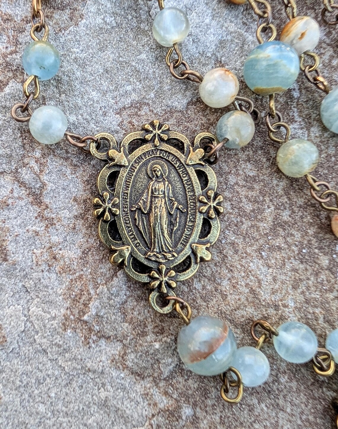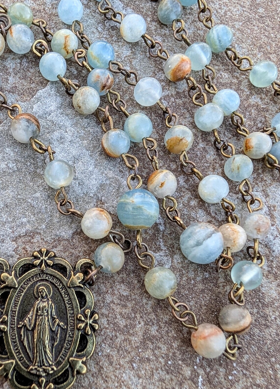 This traditional Catholic Rosary was lovingly crafted with natural aquatine blue calcite gemstone beads, and a bronze crucifix and Miraculous Medal made in Italy.