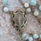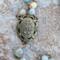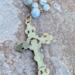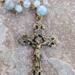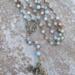 This traditional rosary uses 6mm calcite beads for the first 3 Hail Marys and for the 5 decades. 8mm calcite beads are used for the first Lord's Prayer and each of the Mysteries. Each gemstone bead was made into a link by me using made-in-the-USA Vintaj natural brass eyepins.