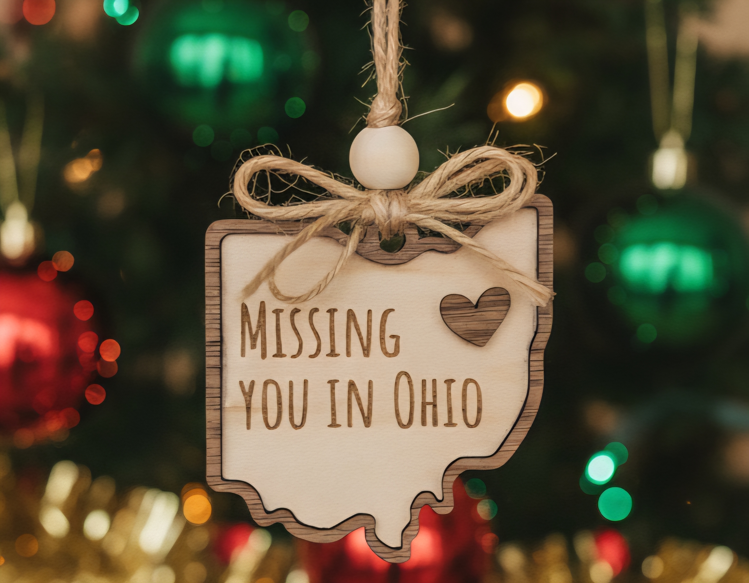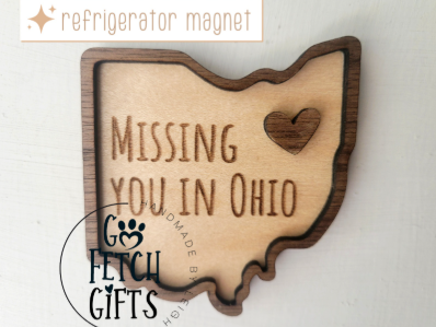 This lovely handmade wooden gift will remind someone who has moved away that you are missing them back in Ohio, either at Christmas with the ornament or daily as a refrigerator magnet. Made of maple and walnut, custom designed and assembled by Leigh and sealed for protection.