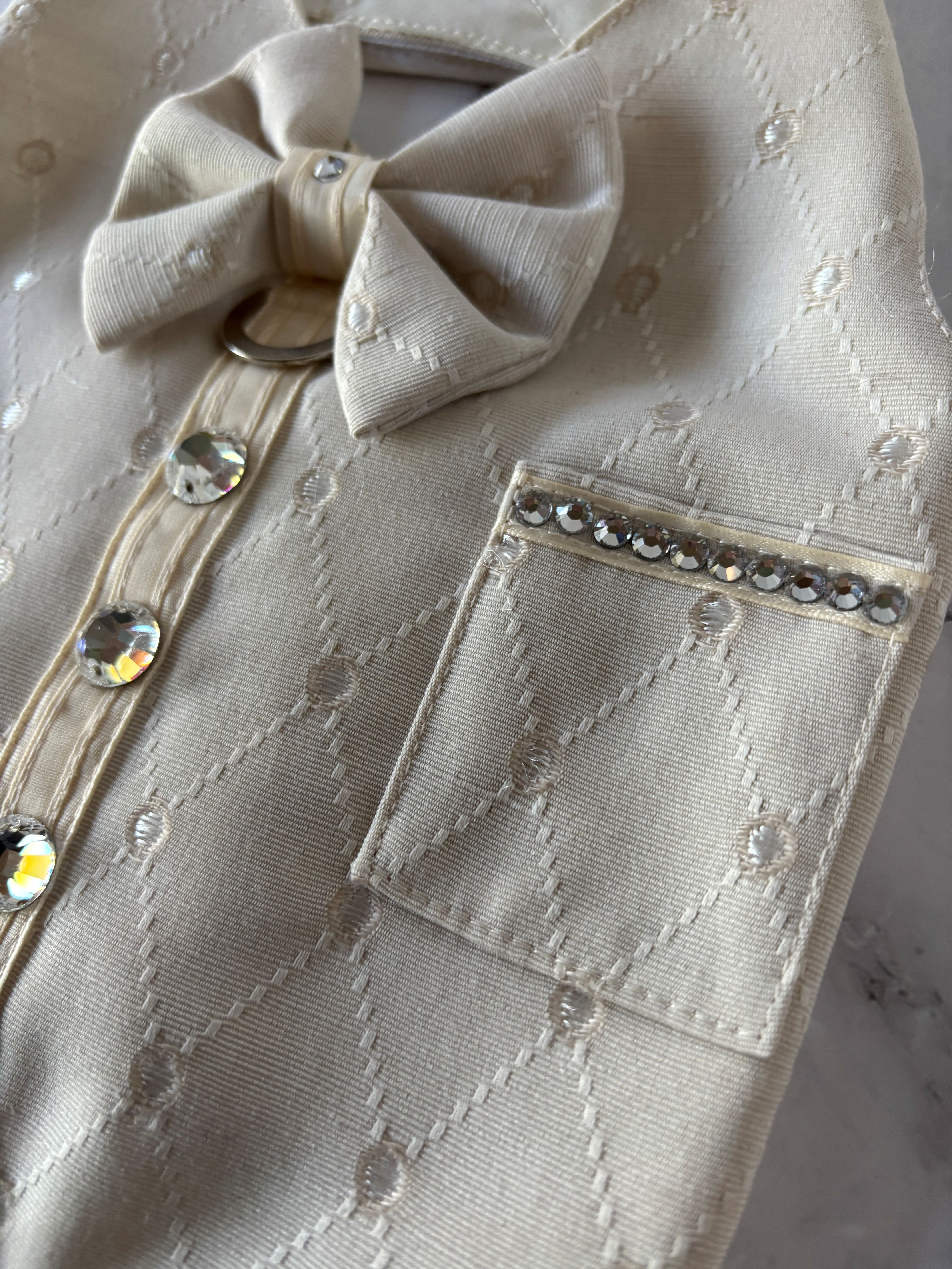 Truly, this is one of the most gorgeous vests I ever made. The fabric, the gorgeous Austrian crystals including over-sized crystals as buttons, and the usable pocket! It is stunning! The harness has a solid cast D-ring to use for a leash, and is made this using pure Austrian Crystals (I can no longer use the name brand of the crystals because I am no longer a brand partner with them), and they are stunning and capture the light so beautifully.