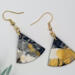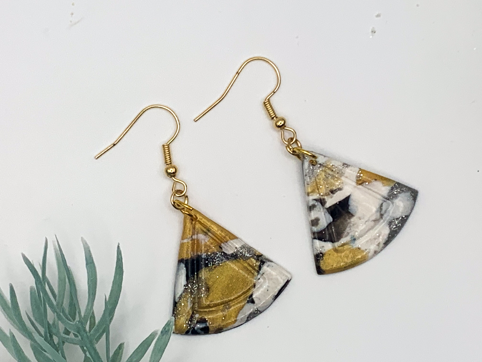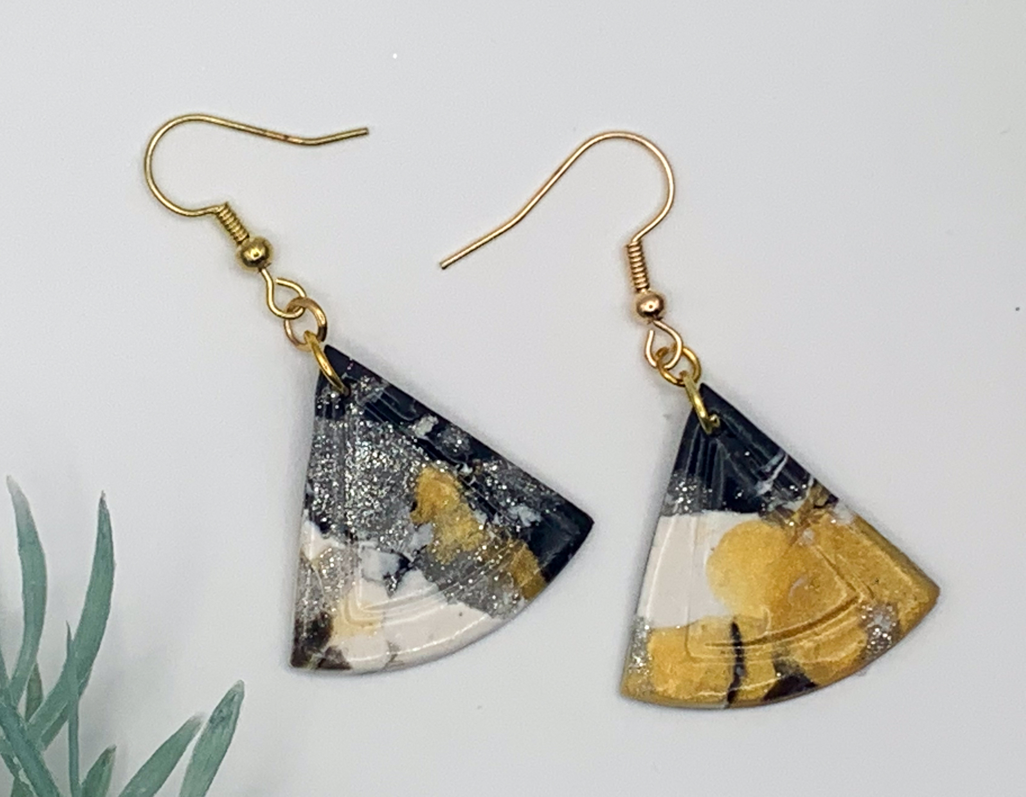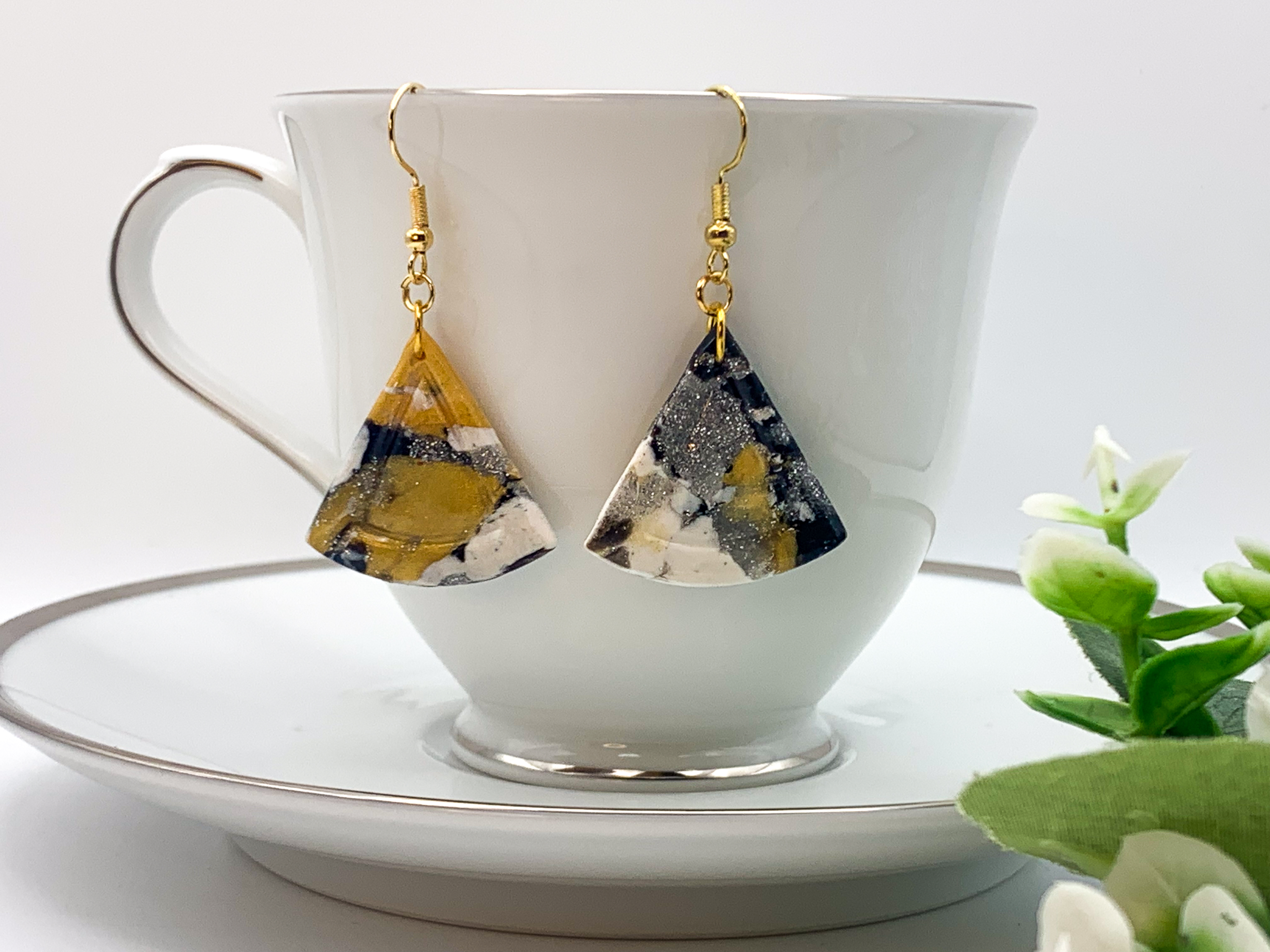 Bold triangular earrings with a striking mix of mustard, black, and white marbling. A true statement piece! ?