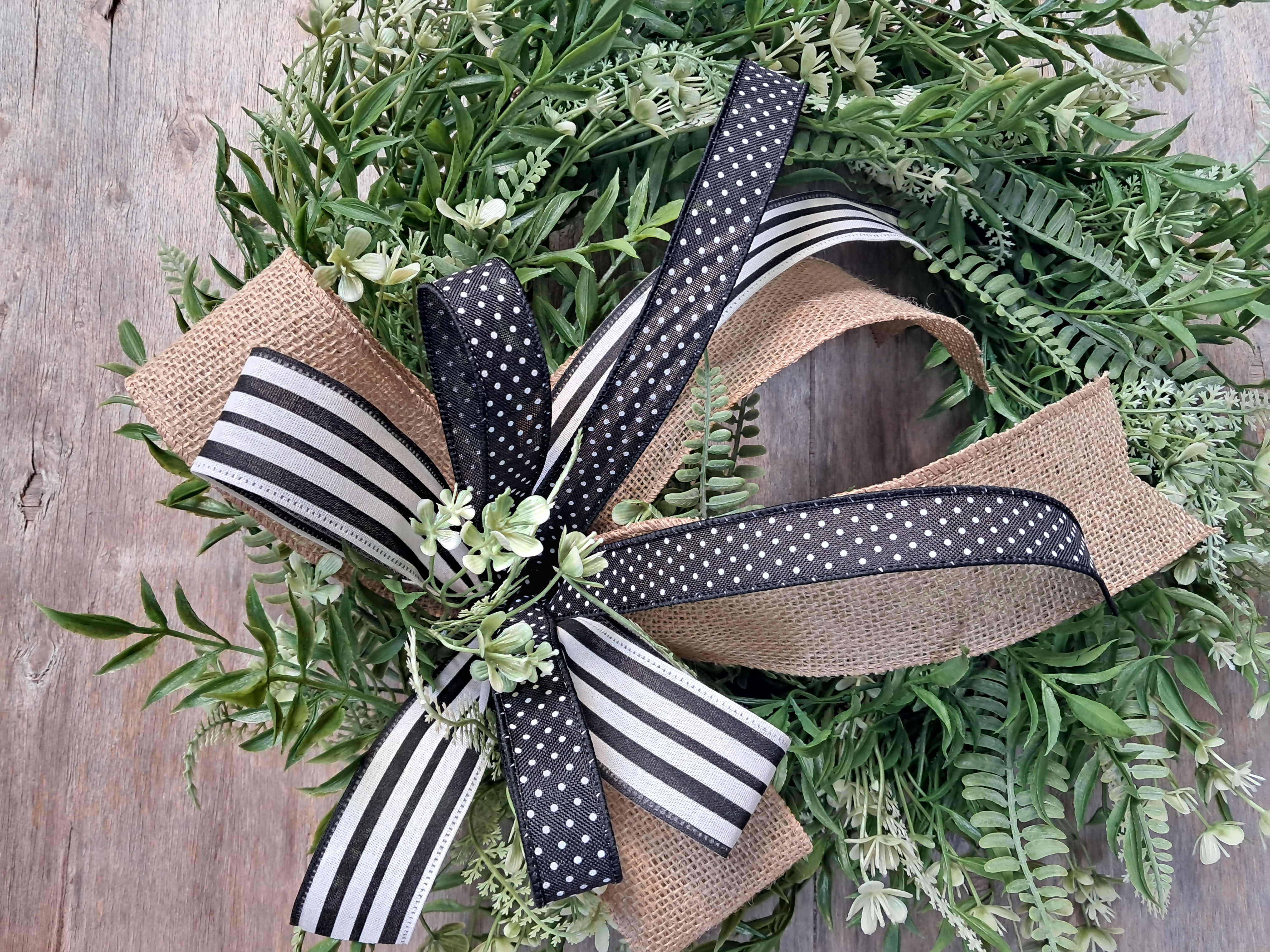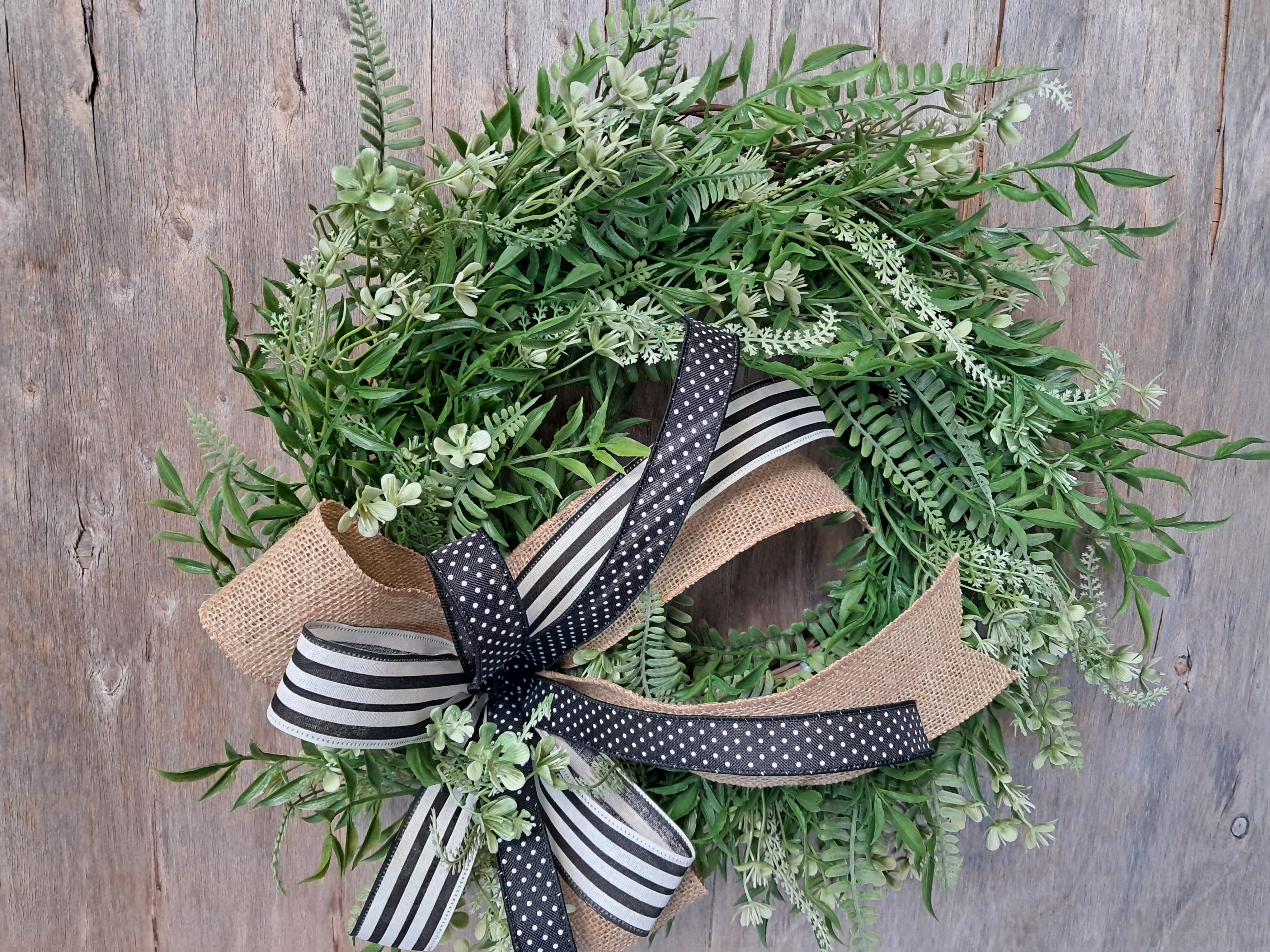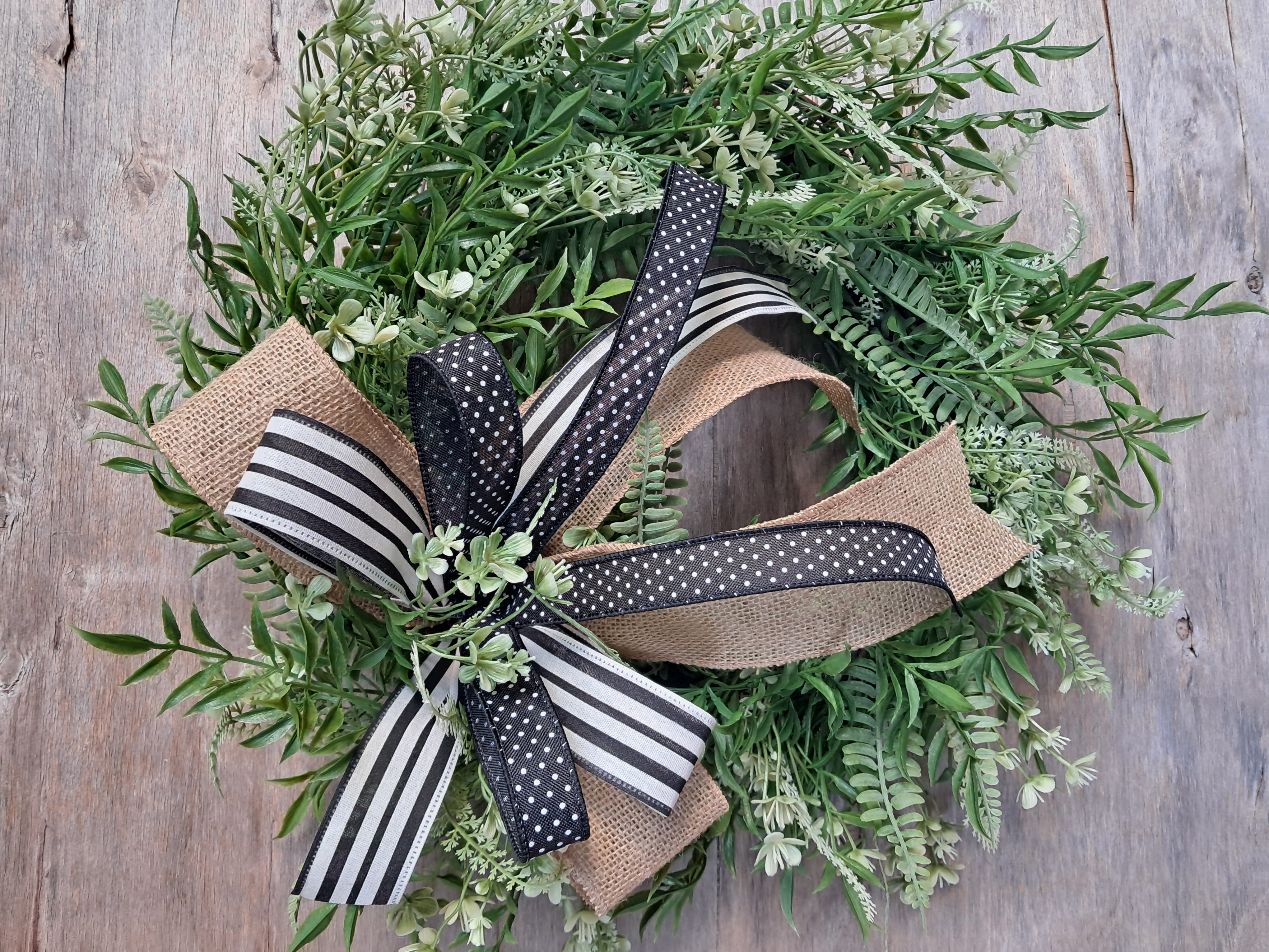Welcome guests with modern farmhouse charm using this handcrafted year-round greenery wreath. Built on a natural round grapevine base, it features a lush blend of fern, ficus, and layered greenery that adds beautiful texture and fullness. A classic bow—crafted from burlap, black-and-white stripe, and black Swiss-dot ribbons—finishes the design with a warm, inviting touch.