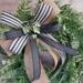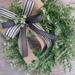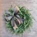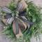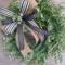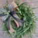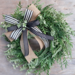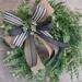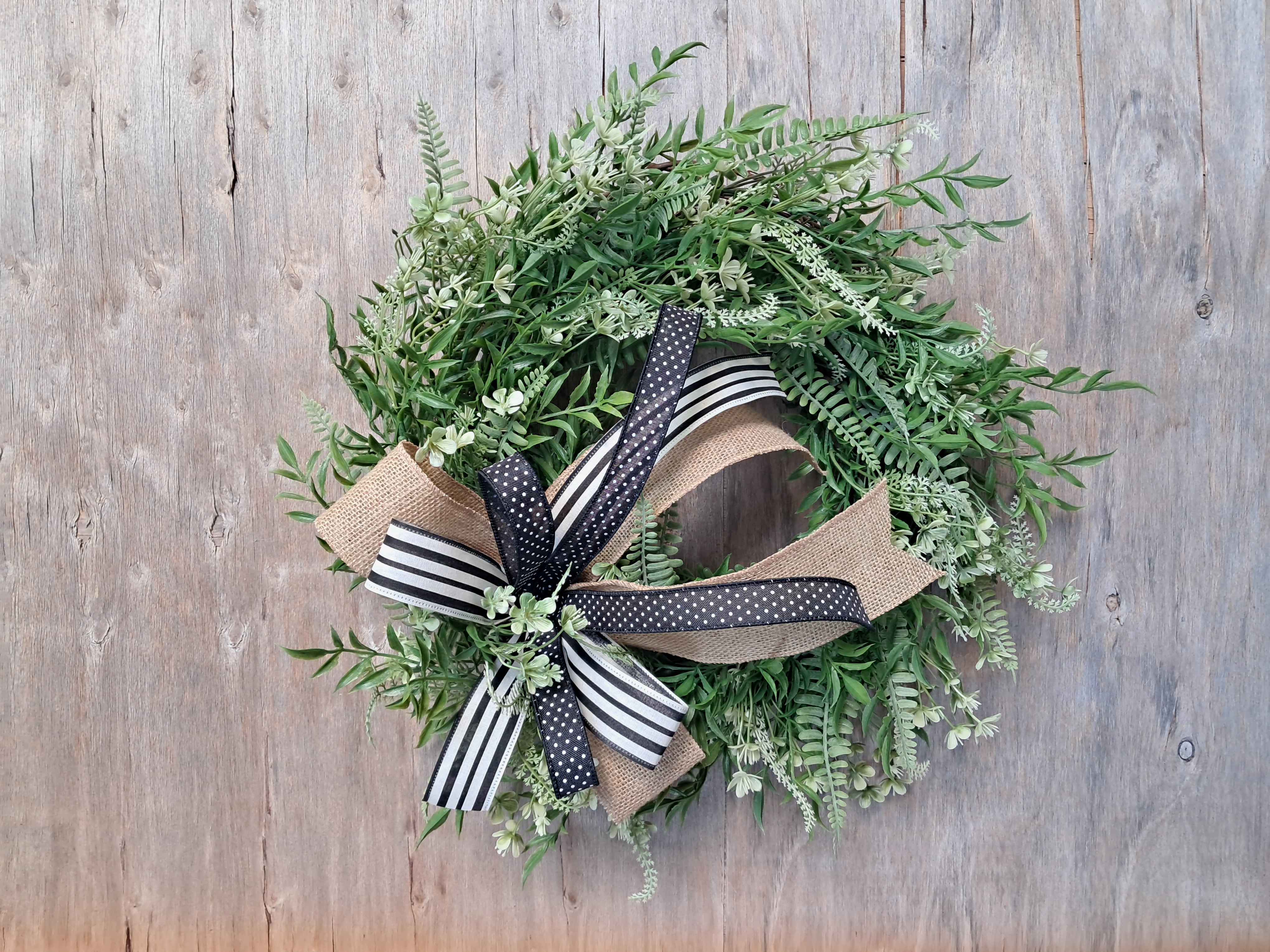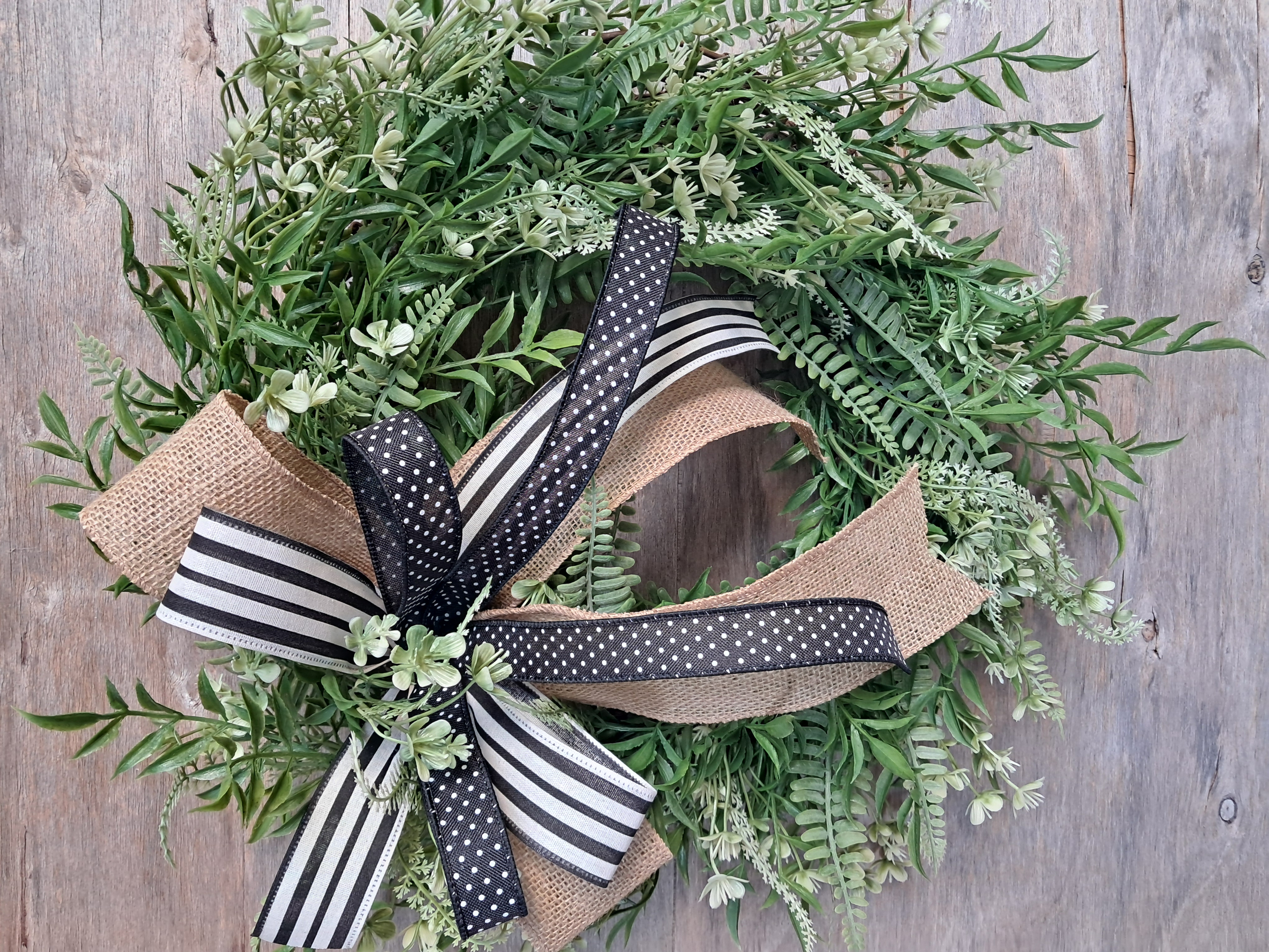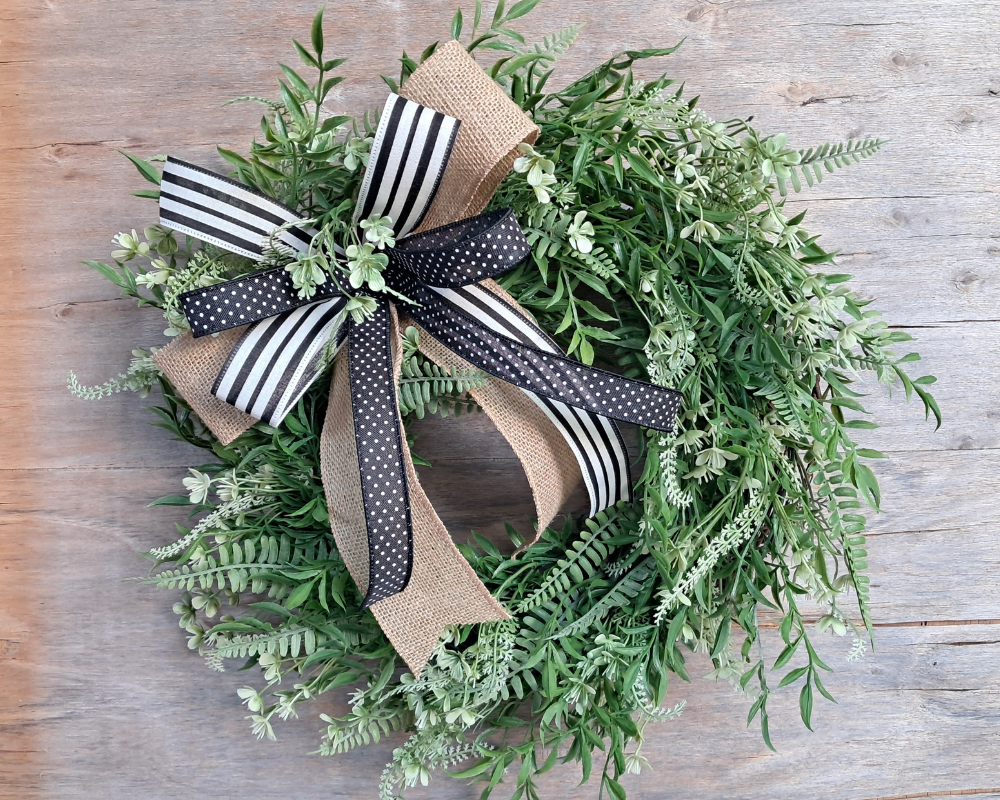 Welcome guests with modern farmhouse charm using this handcrafted year-round greenery wreath. Built on a natural round grapevine base, it features a lush blend of fern, ficus, and layered greenery that adds beautiful texture and fullness. A classic bow—crafted from burlap, black-and-white stripe, and black Swiss-dot ribbons—finishes the design with a warm, inviting touch.