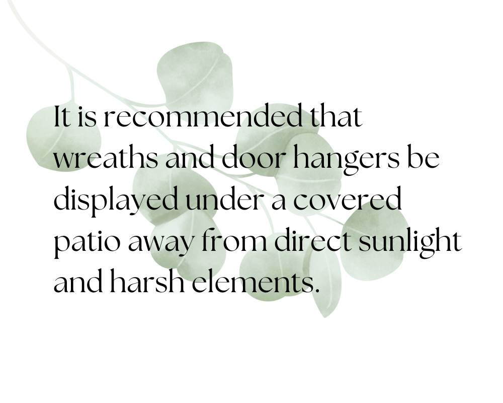 It is recommended that door wreaths and hangers be placed under a covered porch away from harsh elements. Direct sunlight may fade colors, thus applying a non-yellowing UV protective spray is recommended to prolong the beauty of your wreath. When not in use, carefully store your wreath in a wreath bag or container in a temperature controlled area if possible. Extreme temperatures may affect the longevity of your wreath.