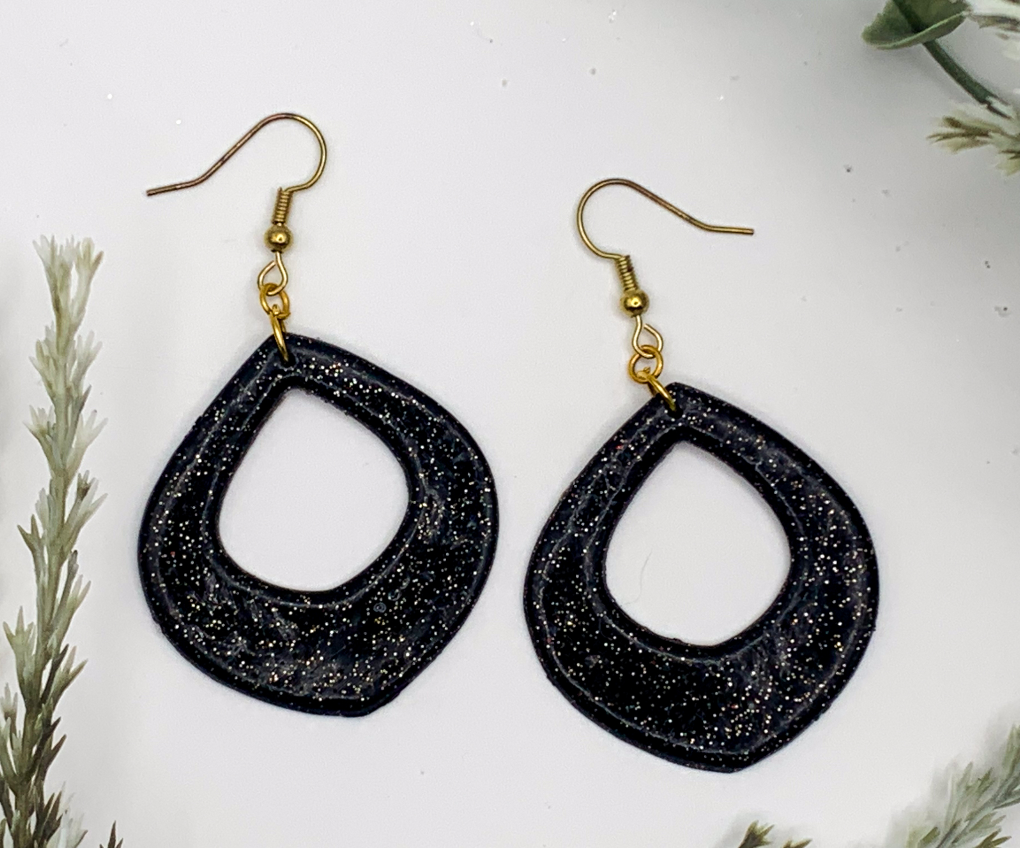 Edgy and elegant collide in these open geometric hoops! Crafted from black clay with a glittery finish, these earrings are perfect for those who love modern, minimalist vibes with a cosmic twist.