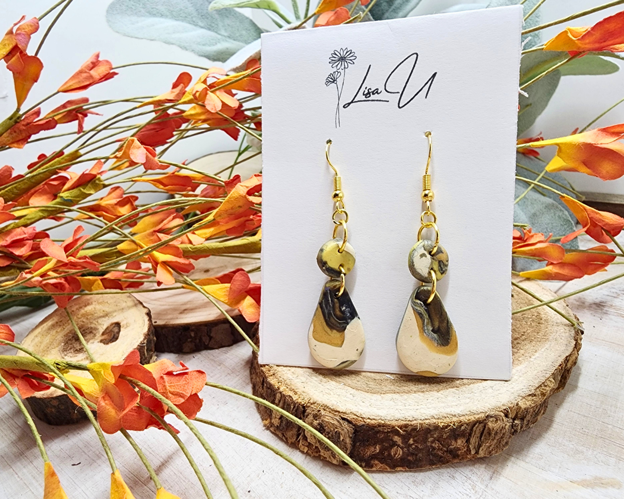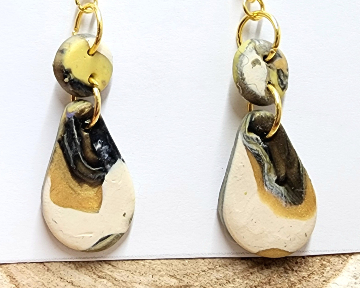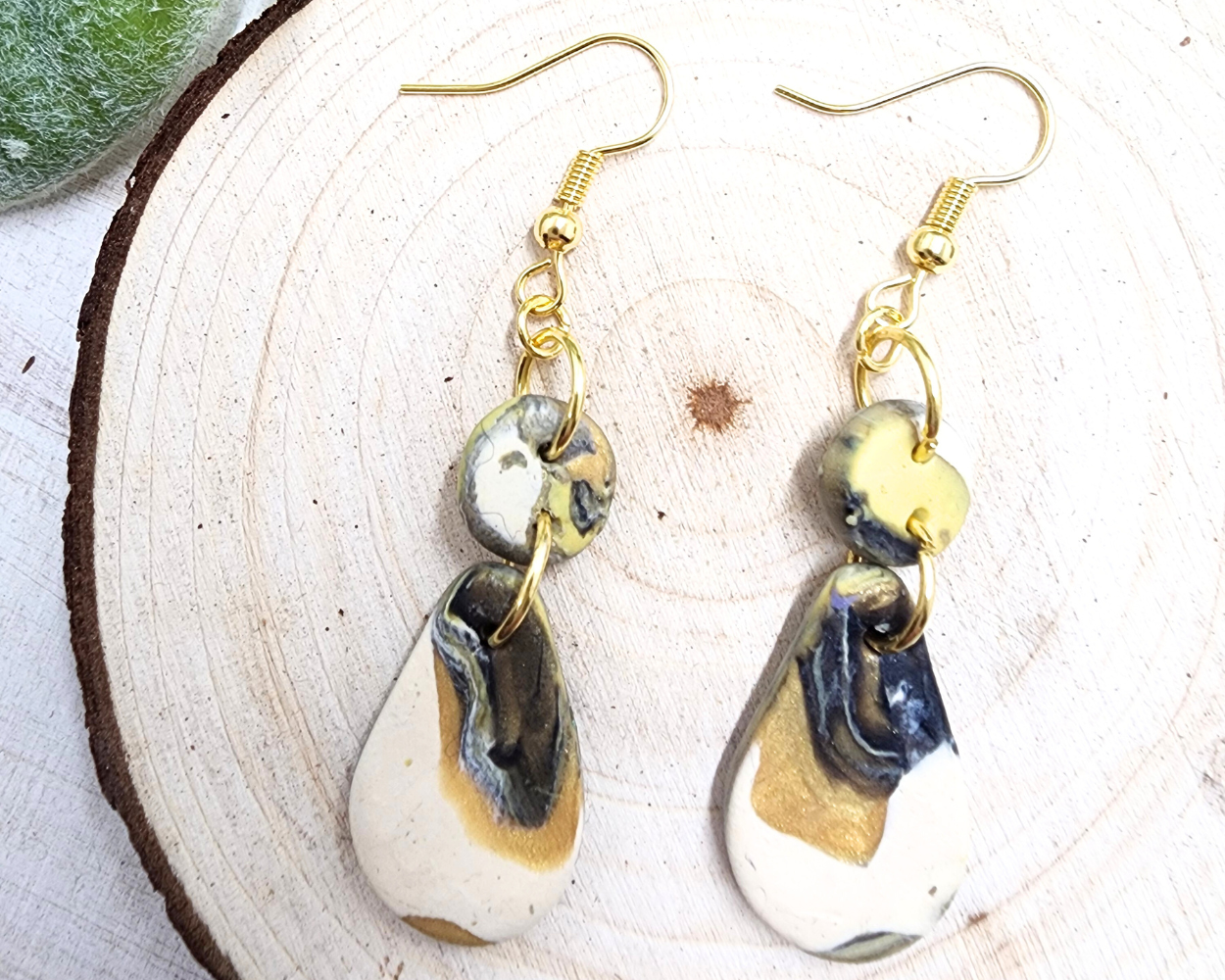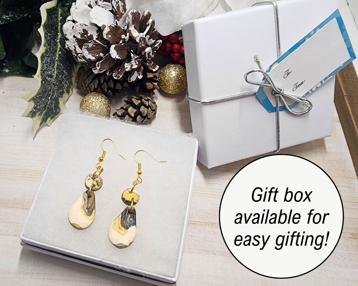 The design showcases beautiful swirls of deep black (ebony), creamy ivory, and subtle hints of earthy gold and beige. The elegant teardrop shape is suspended from a small coordinating clay stud, creating chic movement. As with all polymer clay jewelry, they are incredibly lightweight for comfortable all-day wear.