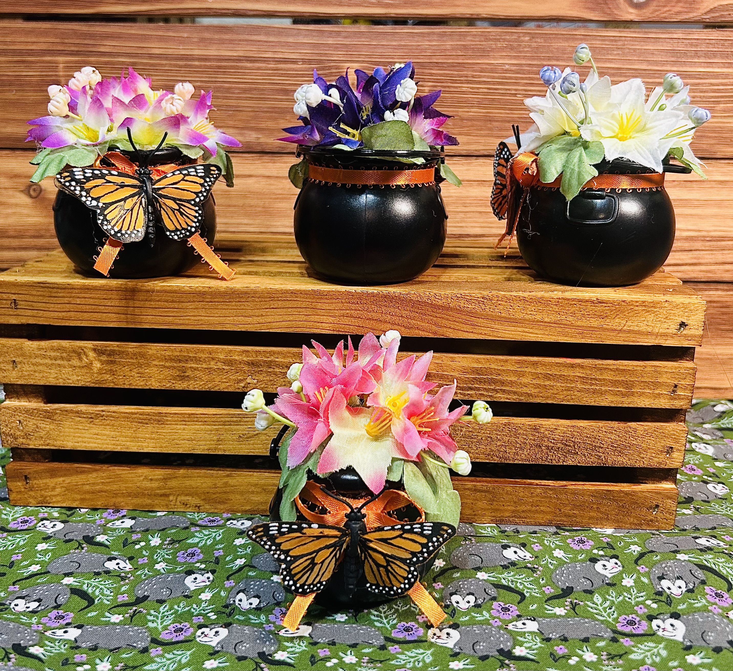 Fake flowers and leaves inside a little plastic cauldron, wrapped in a orange bow and a feather butterfly attached