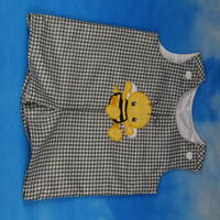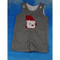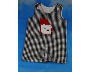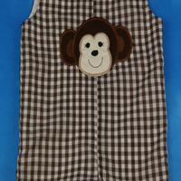 Its a SO Cute Jungle out there and play time will be extra fun in this khaki gingham seersucker overall with jumbo monkey face applique. It is fully lined in white. All Fabrics are 100% cotton. It has buttons at the shoulders and has crotch snaps to make potty time easy. Hand made with love in Atlanta, Ga. USA