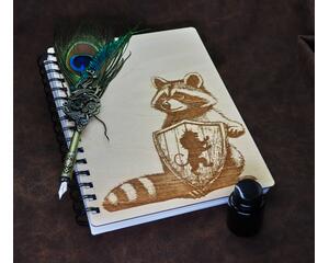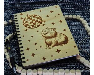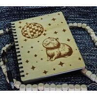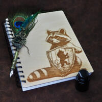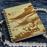 This one-of-a-kind notebook features a stunning etched wood cover that showcases a fearsome T-Rex behind the wheel of a monstrous truck, a sight that's sure to turn heads and ignite your creativity.