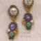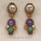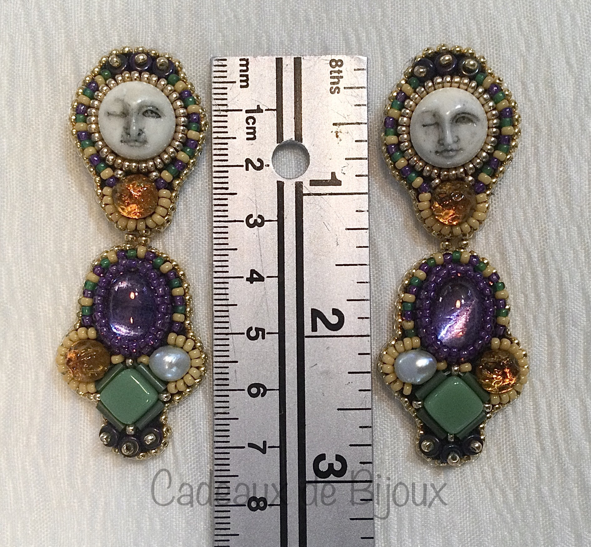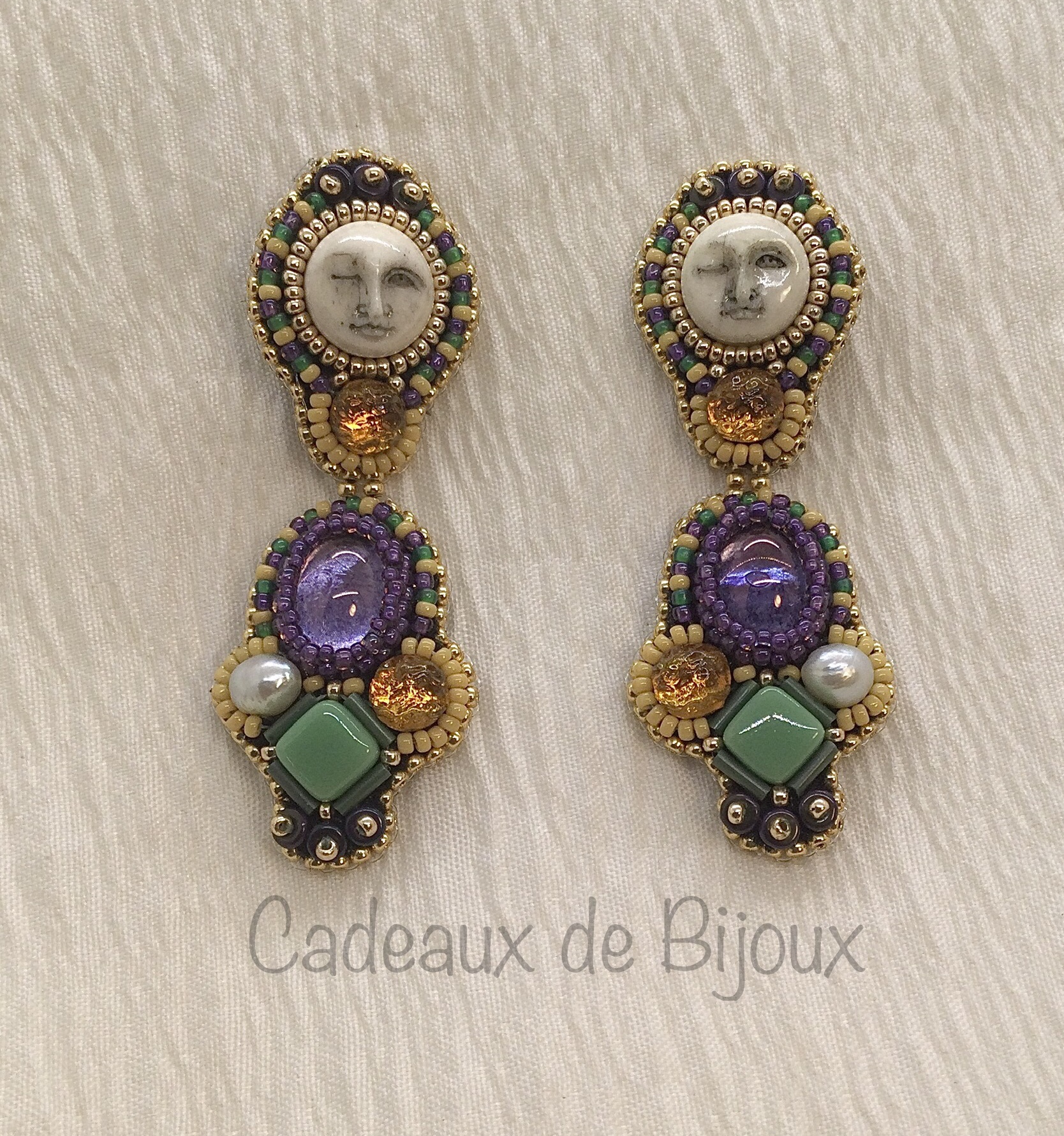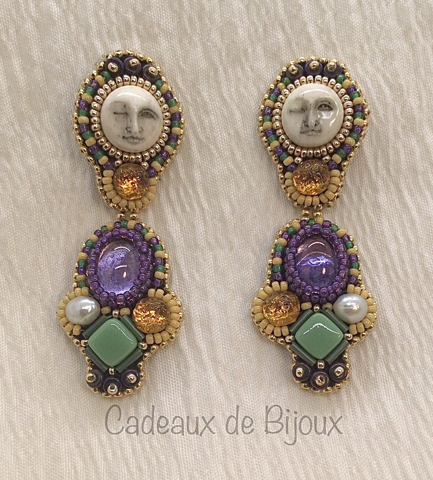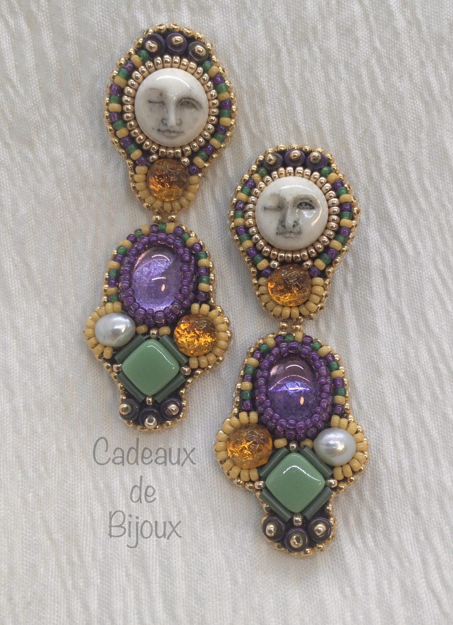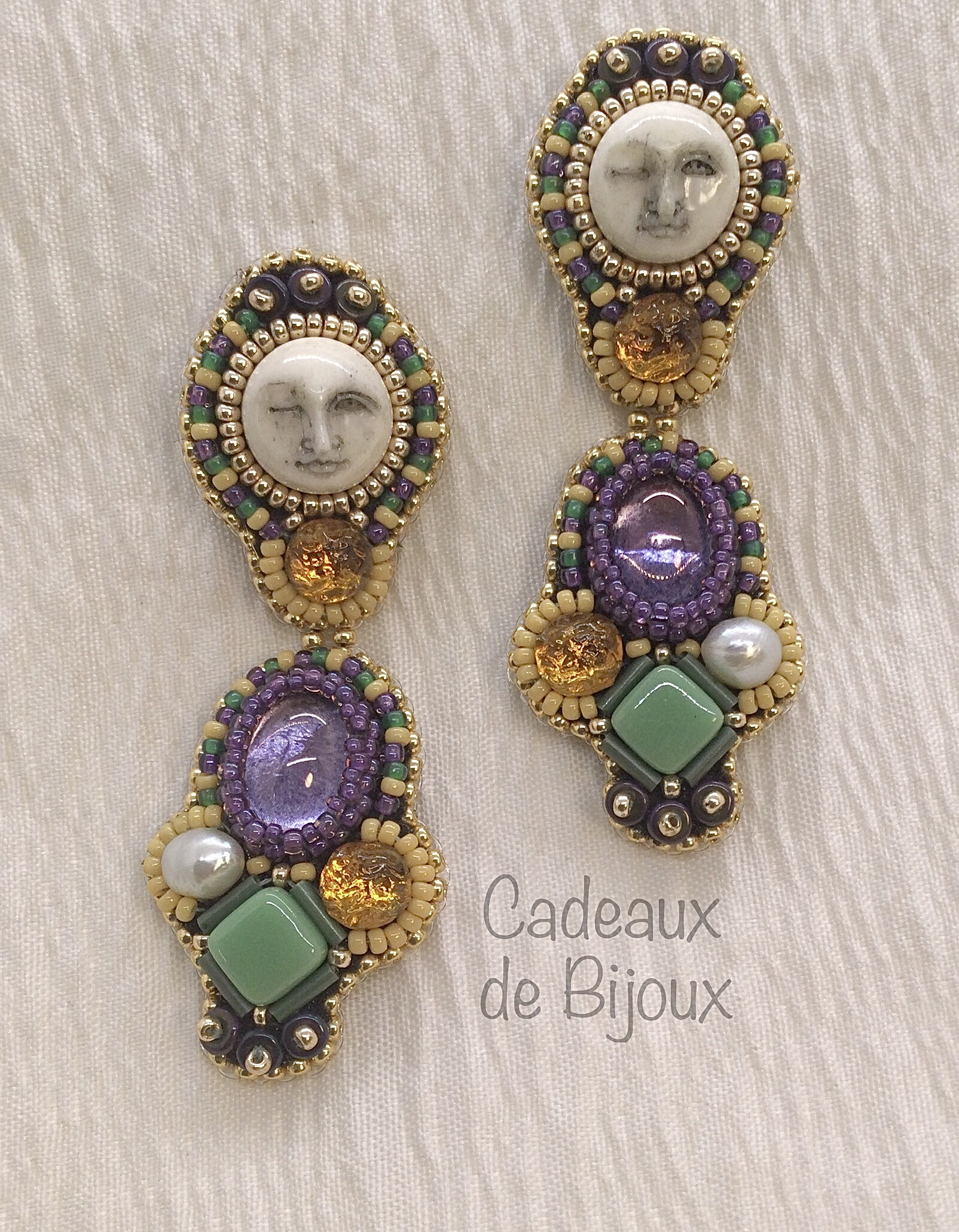 Laissez les bon temps rouler! Sassy, fun and truly unique, Moon over Mardi Gras are sure to garner attention. Traditional Mardi Gras colors of green, yellow and purple rendered in Czech and Japanese glass beads with carved bovine bone and keshi pearls accented in goldtone.