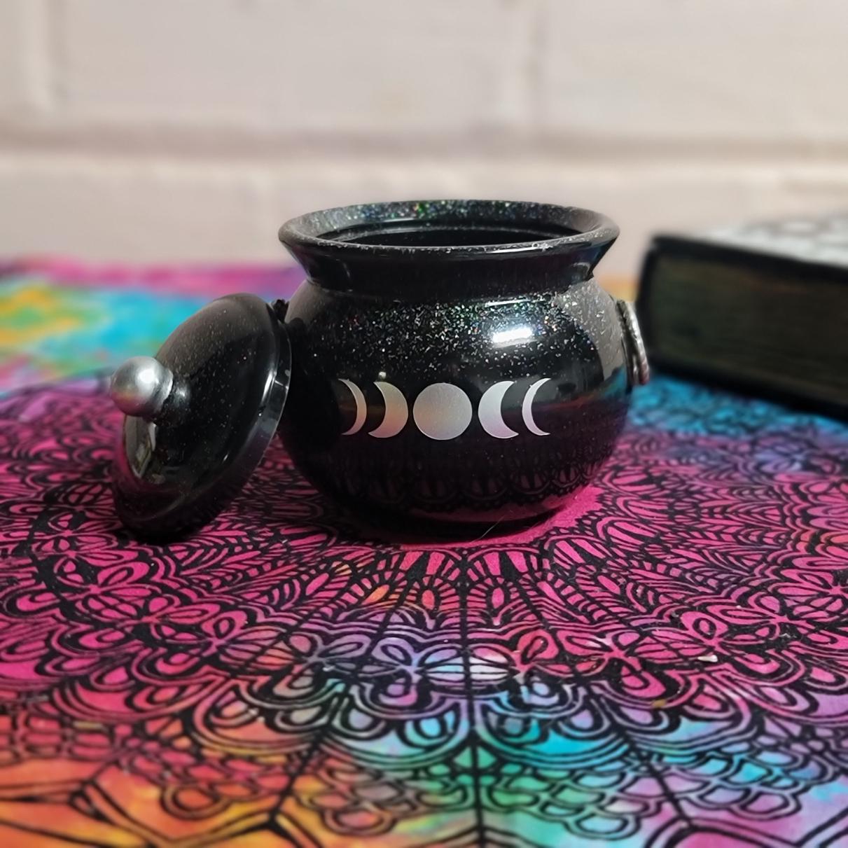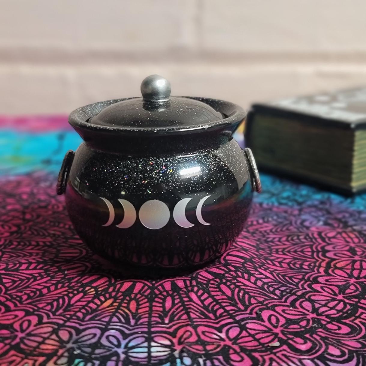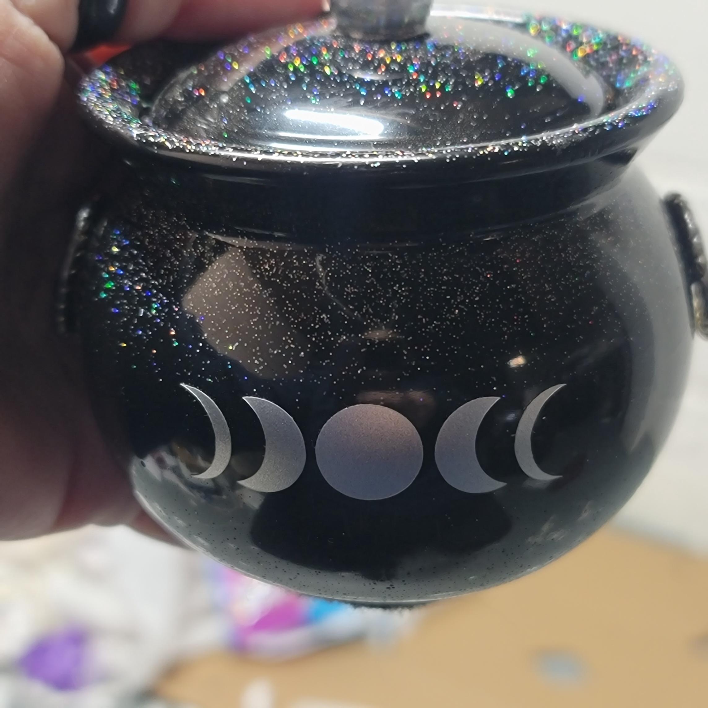 This adorable pot holds about 4.5 ounces, is about 3 inches high and 3.5 inches wide and comes with a lid. The triple moon design on the front is made with silver foil adhesive vinyl that i cut out on my Cricut machine. its about .5" high by 2 inches in length. The knob of the lid is made to match the moon design on the front. I have added Holographic glitter for a touch of sparkly magick.