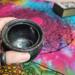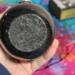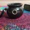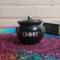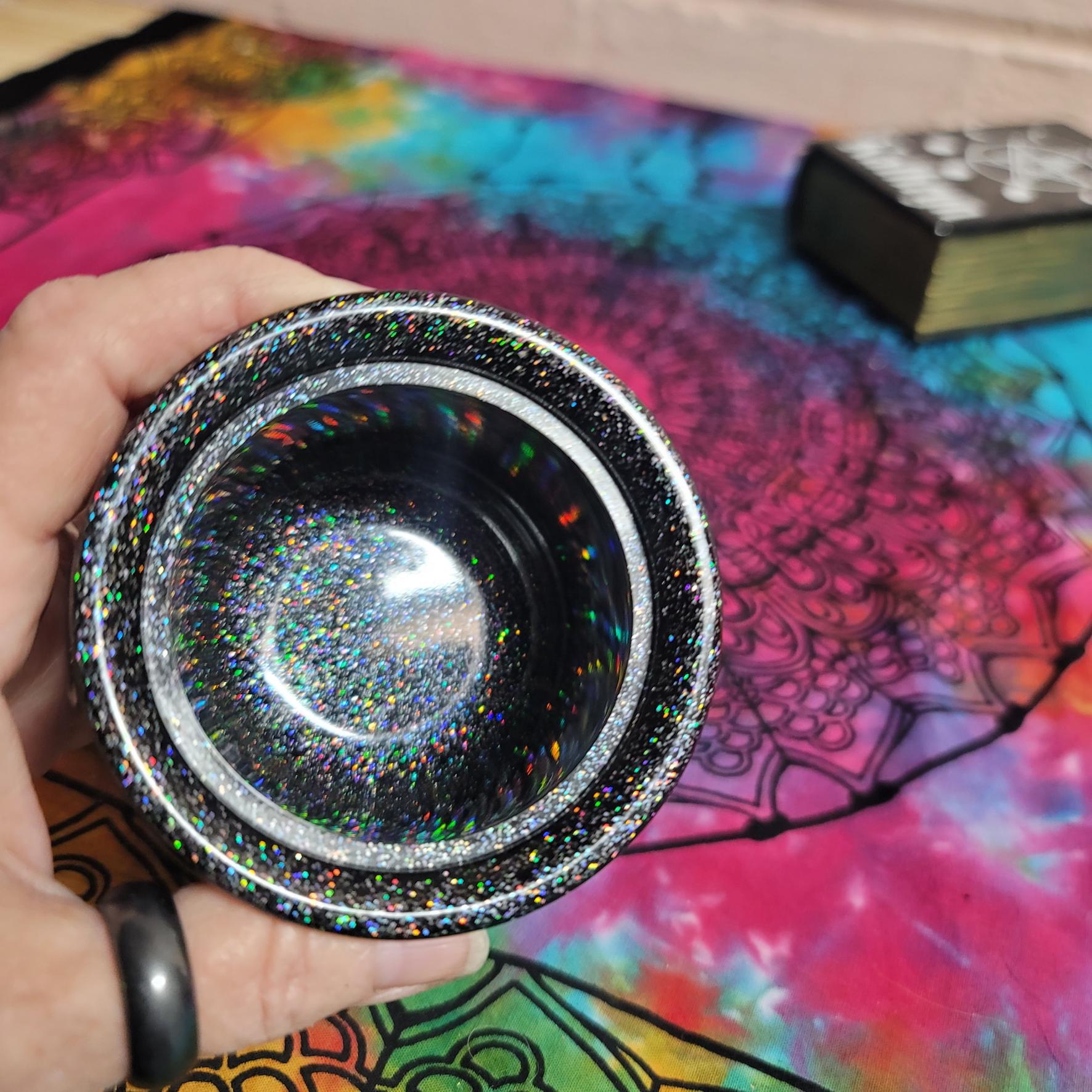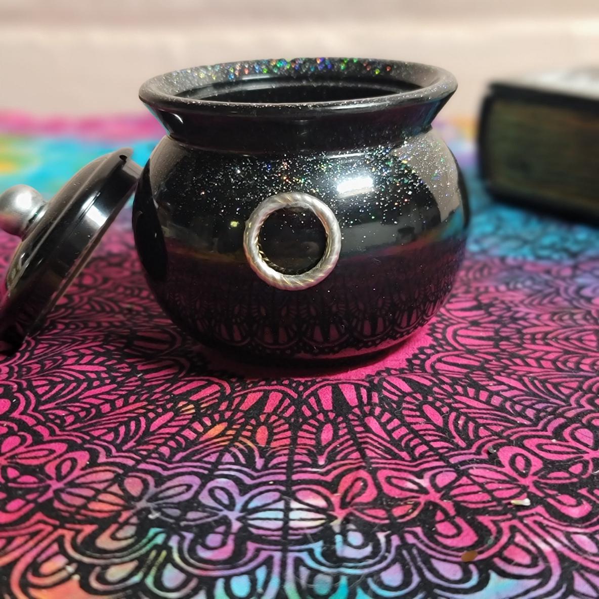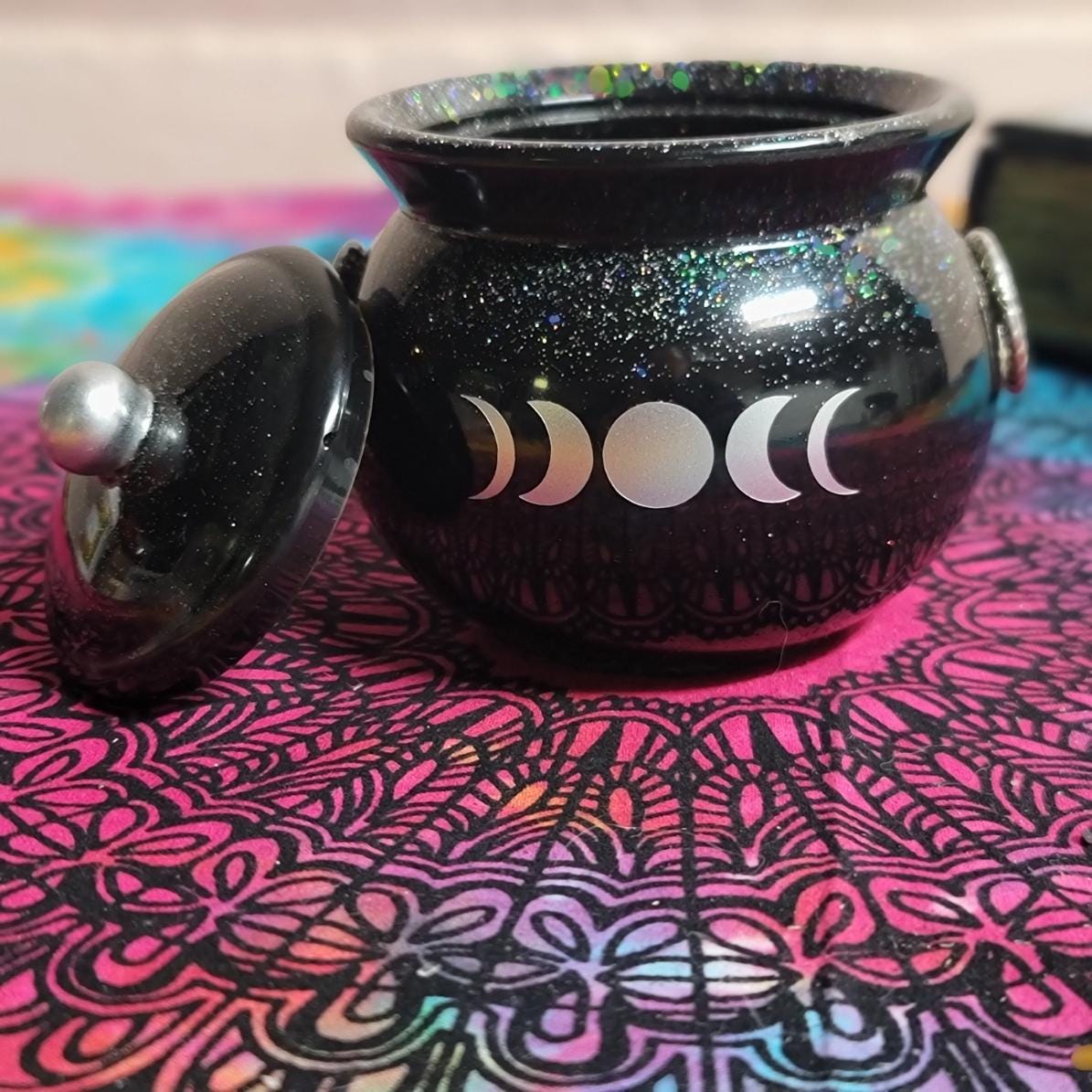This adorable pot holds about 4.5 ounces, is about 3 inches high and 3.5 inches wide and comes with a lid. The triple moon design on the front is made with silver foil adhesive vinyl that i cut out on my Cricut machine. its about .5" high by 2 inches in length. The knob of the lid is made to match the moon design on the front. I have added Holographic glitter for a touch of sparkly magick.