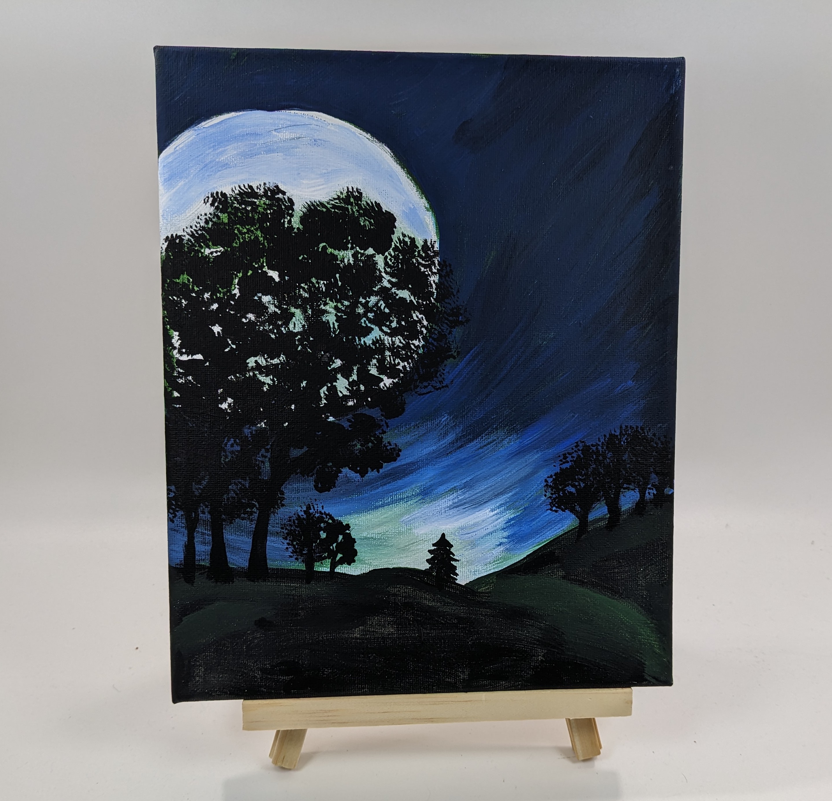 Moon Silhouette Acrylic Painting. You get a hand painter picture on a 8 X 10 canvas that is stretched around a wood frame. Also this painting is completely done with acrylic paints. You are getting an original painting.
