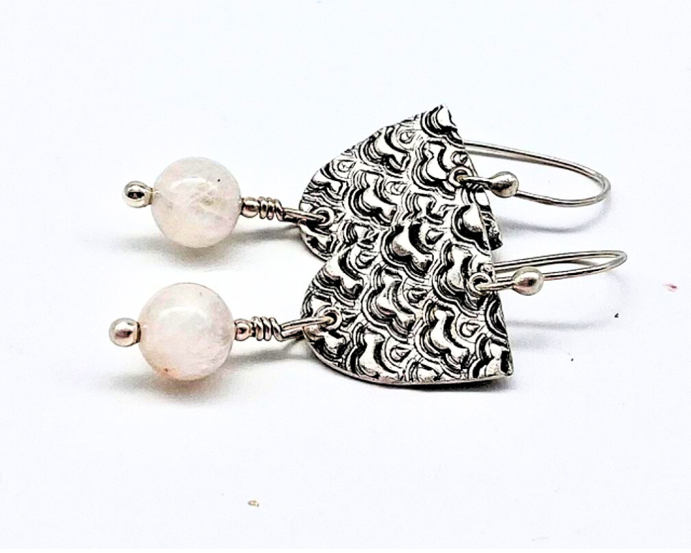 I created these Moonstone earrings with sterling silver metal clay and moonstone beads. The white moonstones have a nice little flash. These earrings have a classic style and would be a beautiful addition to any jewelry collection. Pairing the white moonstone with Sterling Silver makes it a great "Go To" earring matching almost any outfit.
