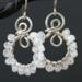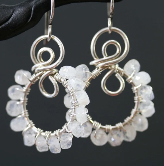 Create handmade wire link shaped like an hourglass, than wire wrap moonstone beads on to frame and hand on sterling silver ear wire