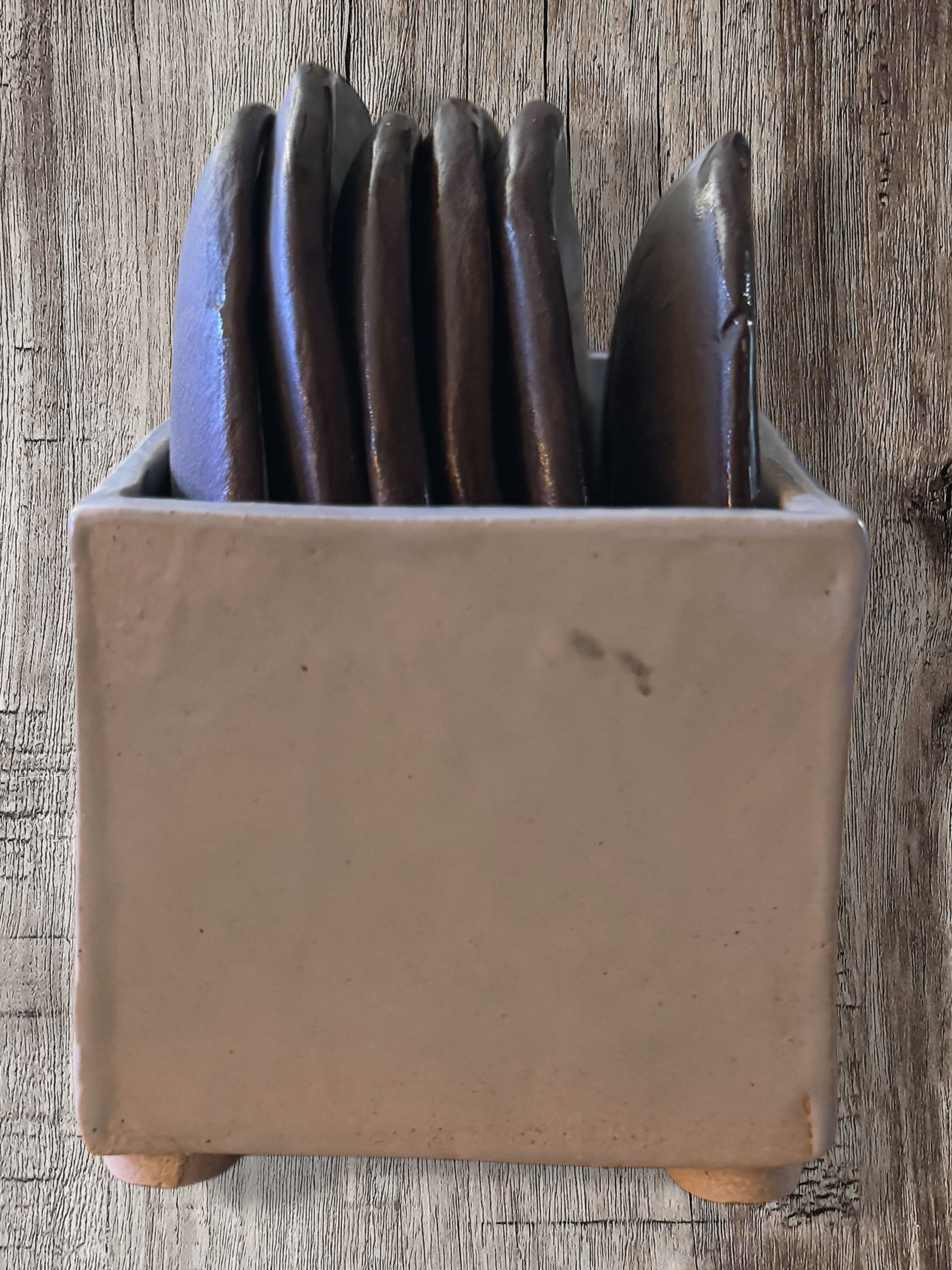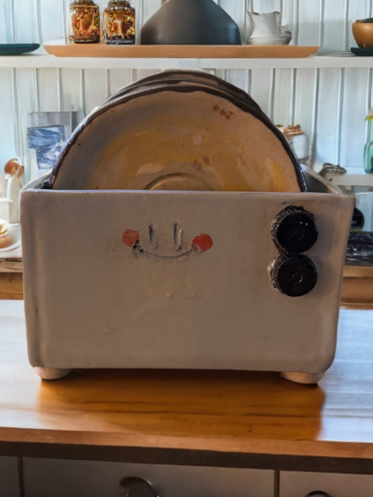 The toaster holder is also slab-built, carefully assembled by hand, and decorated with a whimsical smiling face and black “buttons” for detail. After glazing, the entire set is fired again at over 2,300°F, creating a strong, food- and drink-safe finish that’s ready for daily use.