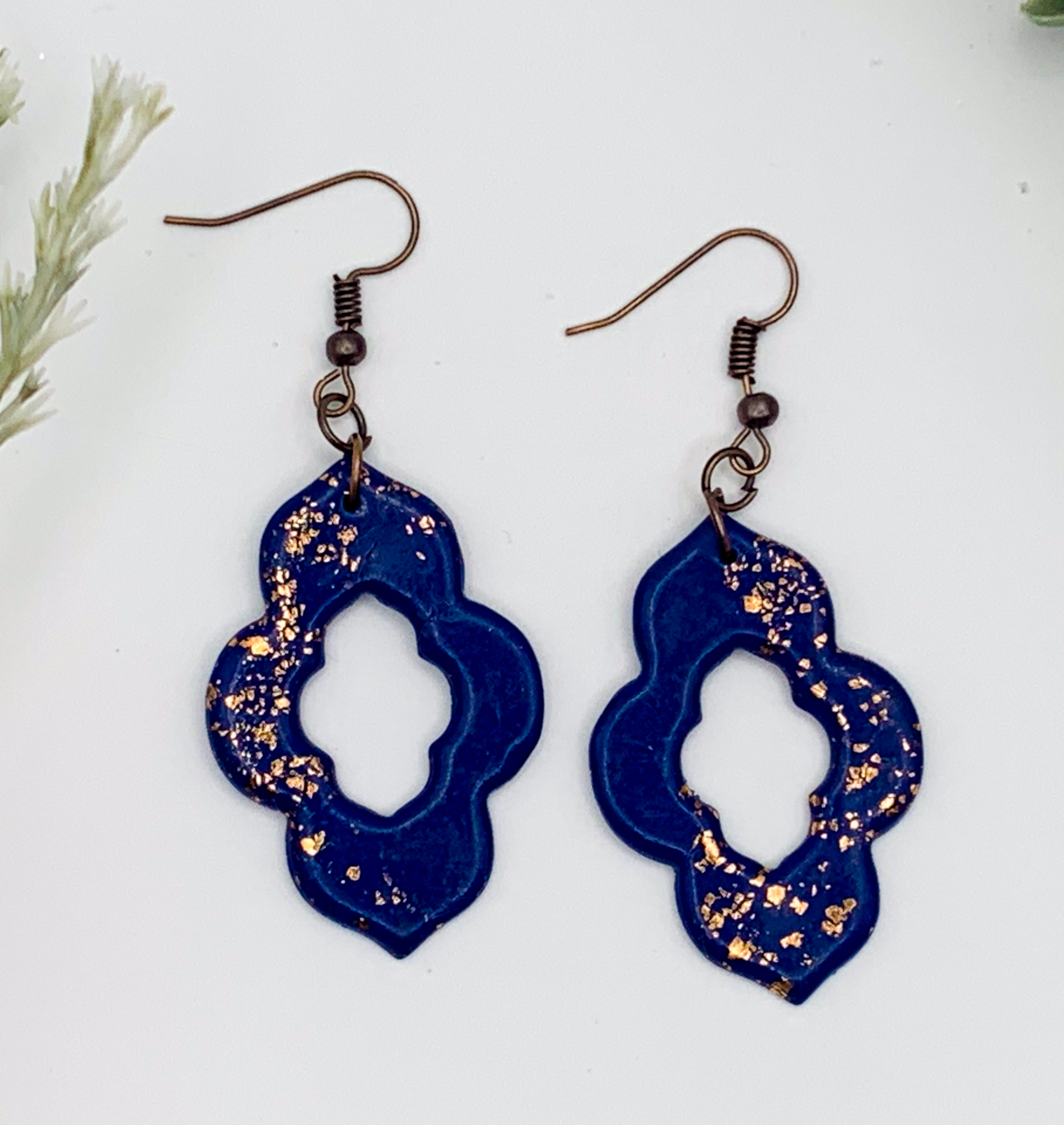 Exotic elegance! These cobalt blue clay earrings feature a Moroccan-inspired cutout design sprinkled with golden foil for a luxe finish.