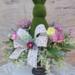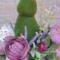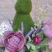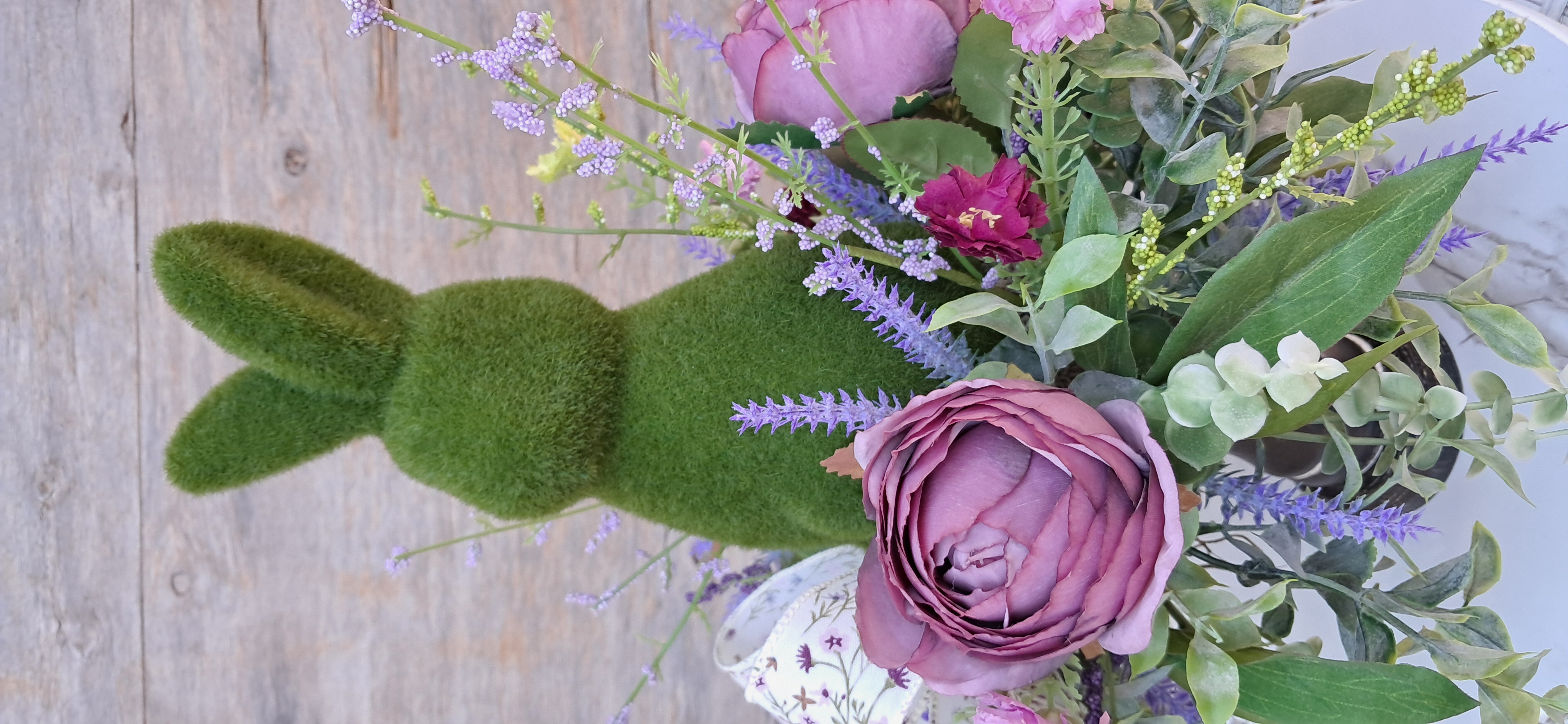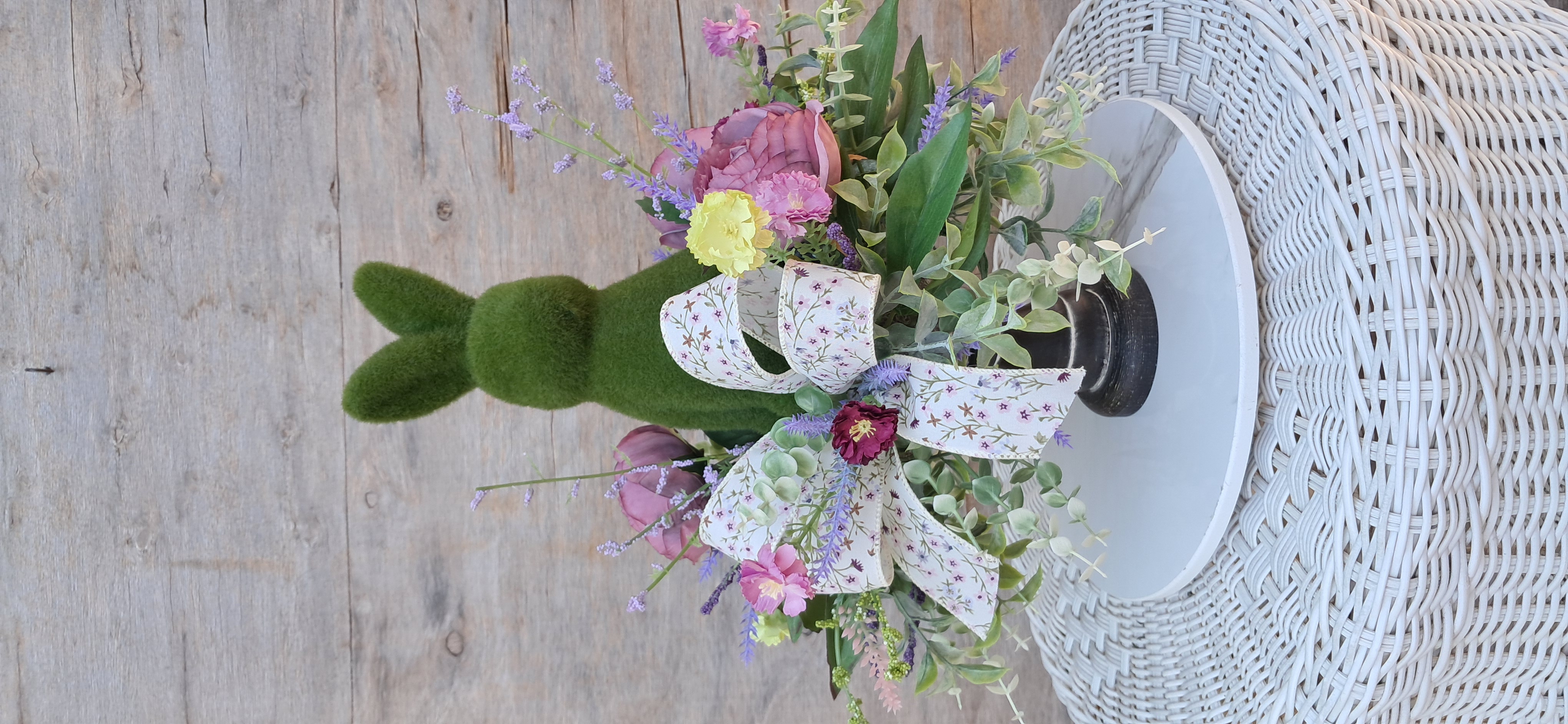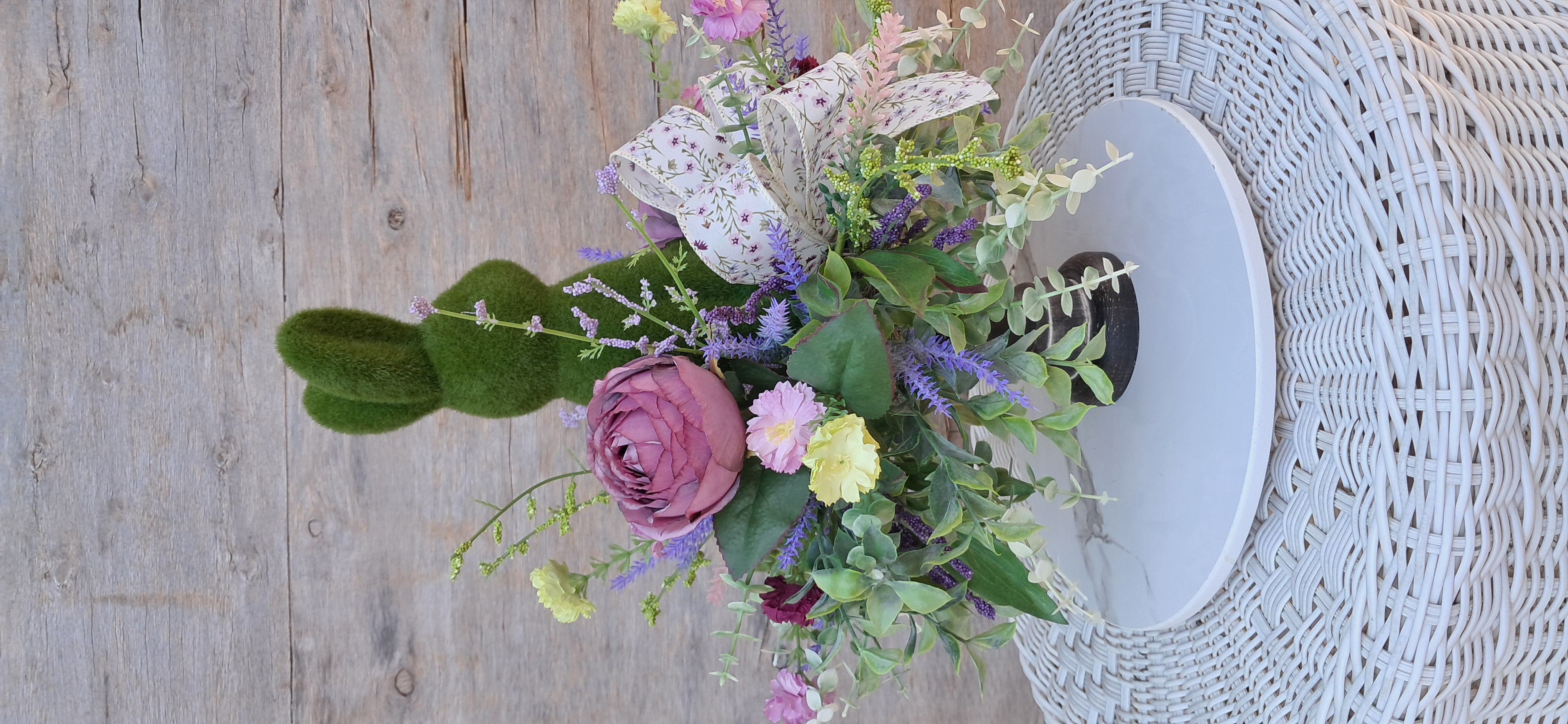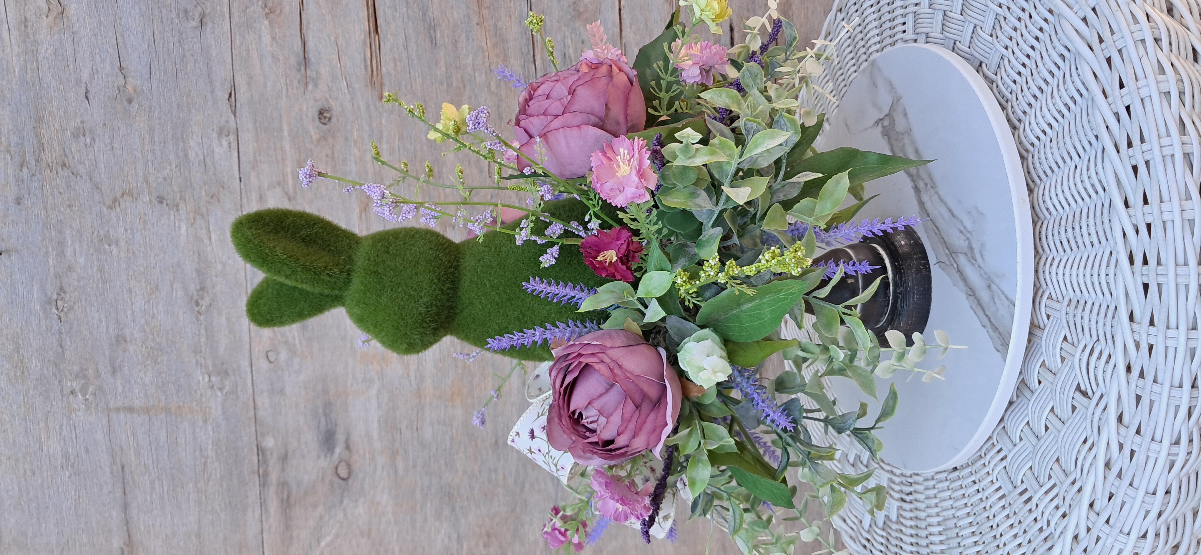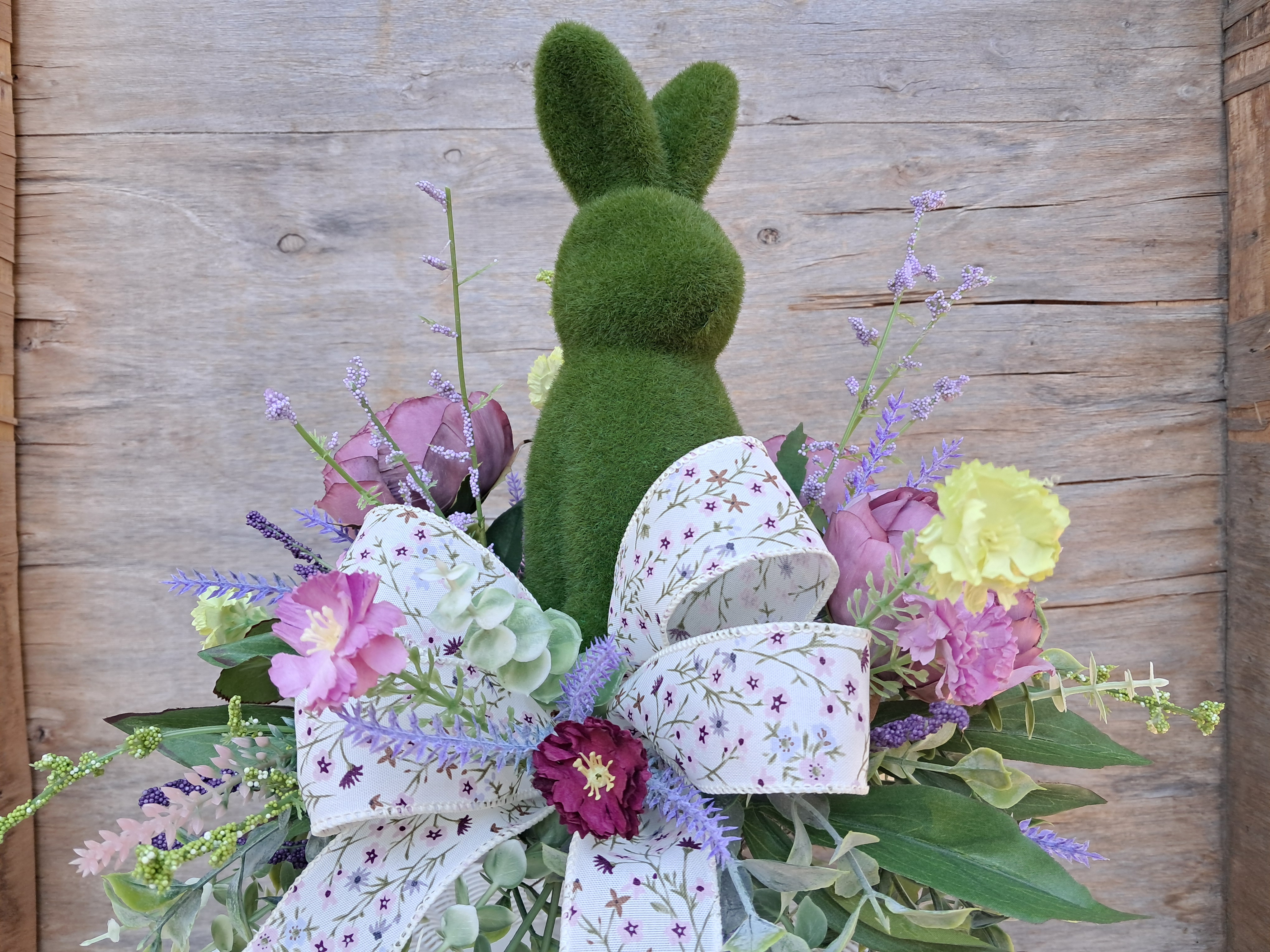 Welcome the beauty of spring with this one-of-a-kind moss bunny candlestick arrangement, thoughtfully handcrafted to bring seasonal charm into your home. Designed on a rustic candlestick base, this faux floral centerpiece features an adorable moss bunny nestled among a lush mix of cabbage roses, lavender, and heather in soft shades of purple, lilac, and blush pink. Layers of variegated eucalyptus and tea leaves add fullness, texture, and a natural cottage garden feel. Finished with a beautifully styled bow, this arrangement offers a timeless blend of rustic elegance and springtime whimsy.