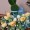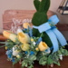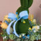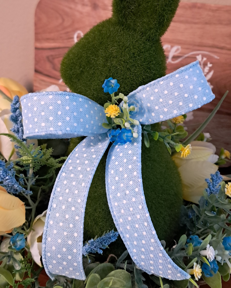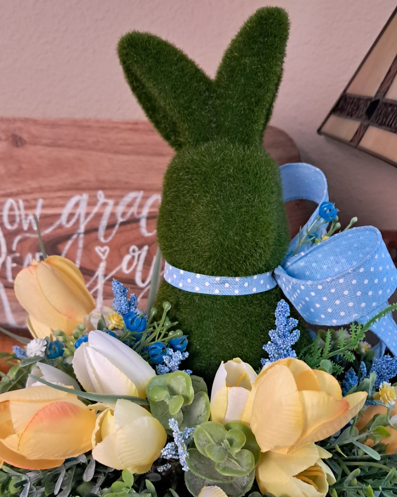 Add some charm to your spring decor with this one-of-a-kind moss bunny tulip arrangement! Designed on a rustic riser, this faux floral centerpiece features an adorable moss bunny nestled among a lush mix of yellow tulips, sweet wildflowers, and soft blue heather. Layers of boxwood and fern add fullness, texture, and a natural cottage garden feel. The bunny is finished with a beautiful blue Swiss dot bow, adding to the rustic elegance and springtime whimsy of this centerpiece.