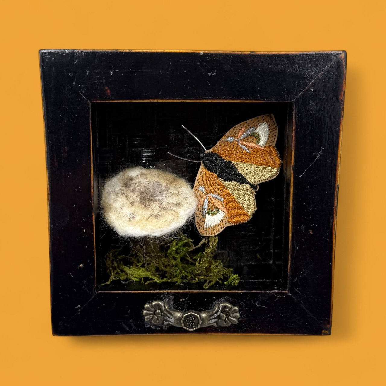 This embroidered moth and felted mushroom compliment each other in this found shadow box with moss added. 3" x 3" interior dimensions.