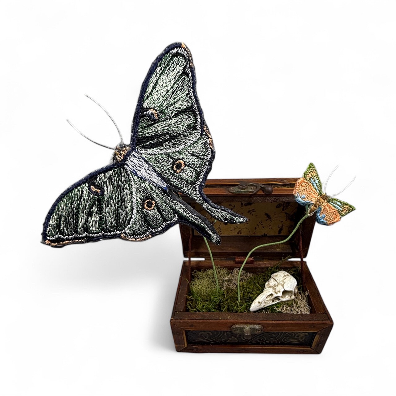 The Luna moth and his little friend have escaped the box, leaving behind a skull and moss. Both moths are machine embroidered on both sides. The moths will come out of the box for shipping purposes.