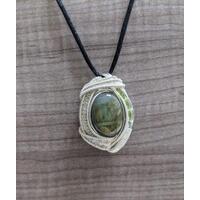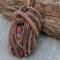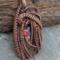 Multicolored composite stone in copper woven wire. This pendant is just a tad bit longer than 2" long and 1" wide and comes with a black satin cord. This is a one of kind handmade piece! The stone is just peaking out, offering a splash of color to the wire work.