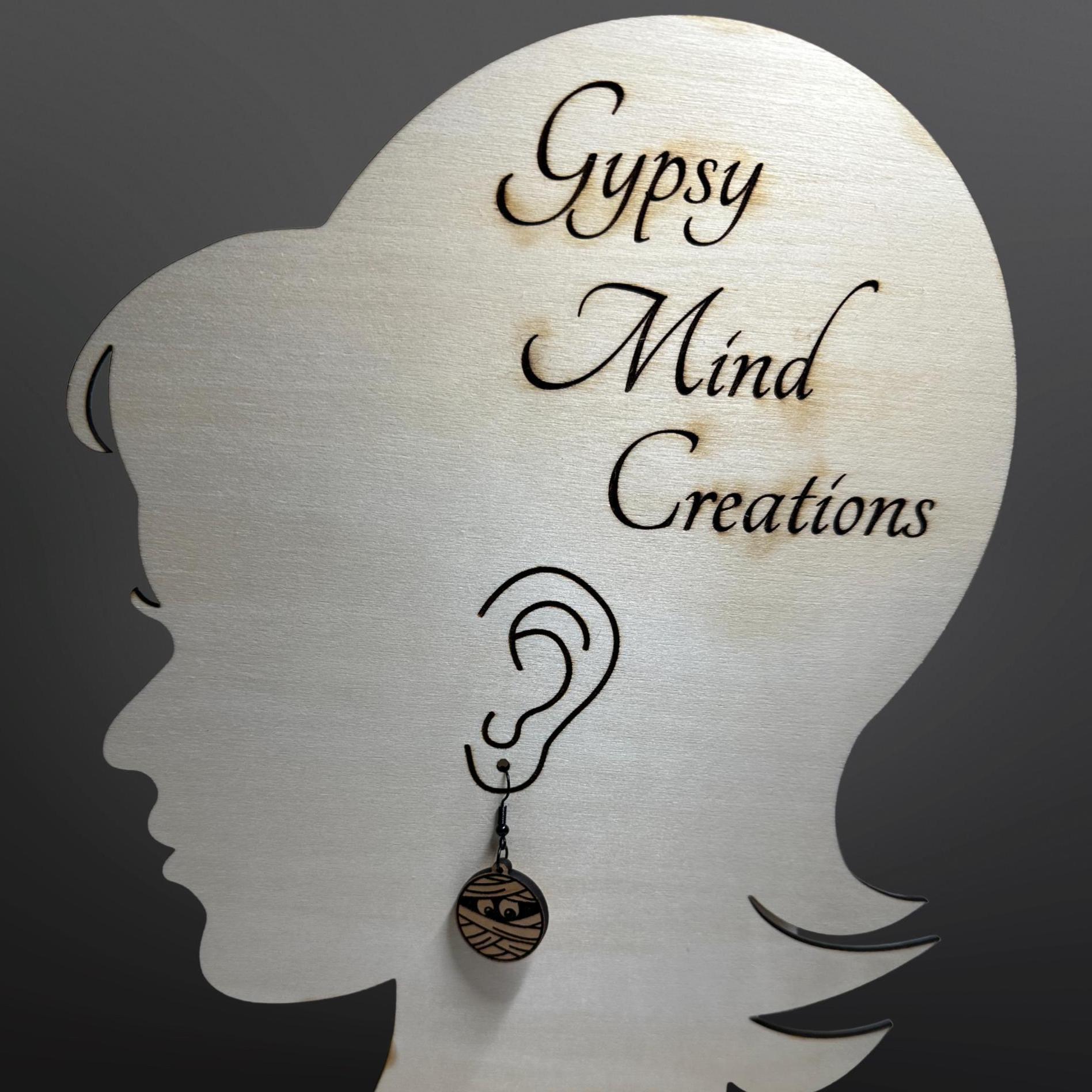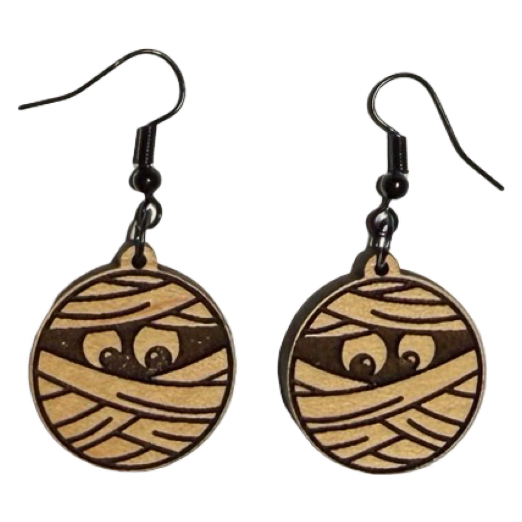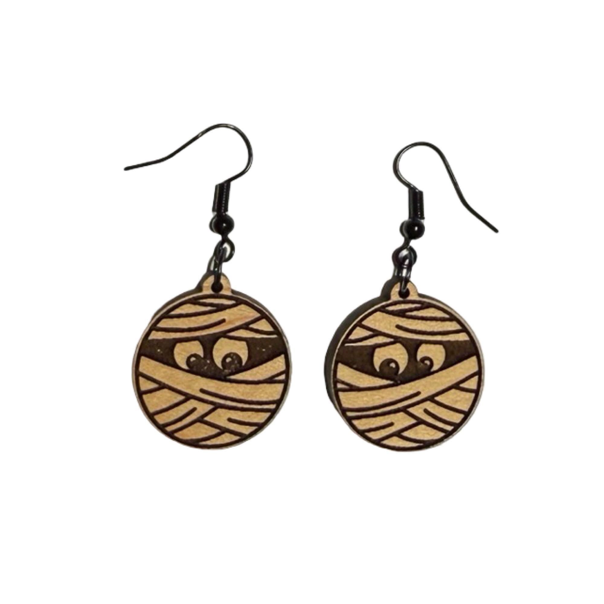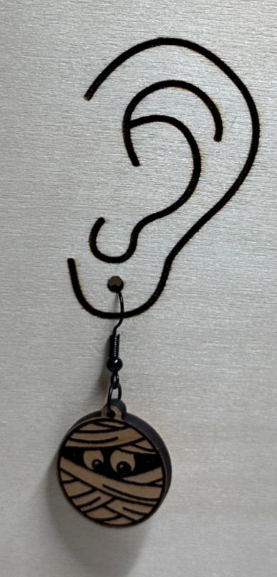 These are a pair of laser cut lightweight mummy wood dangle earrings. They are made from 1/8 in thick medium maple plywood. There is no design on the back. They are on ear wires. All metal components are silver, gold, or brass plated, or black alloy, nickel & lead free, and hypoallergenic. They are approx. 1” in long. Backs not included but available upon request.