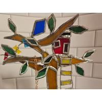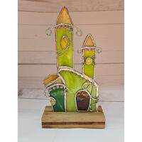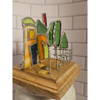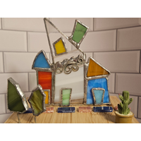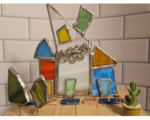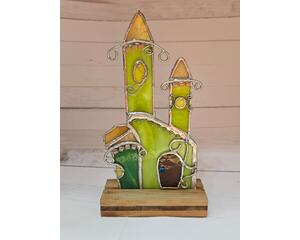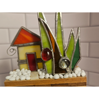 Stained glass mushroom house settled down amongst other mushrooms. The house is move-in ready for any little fairy people that are house shopping. The wooden base came from a black walnut tree from my yard. The dimensions are 7" tall by wide.