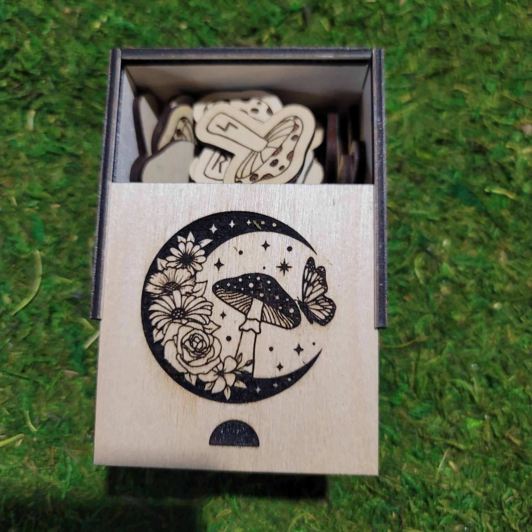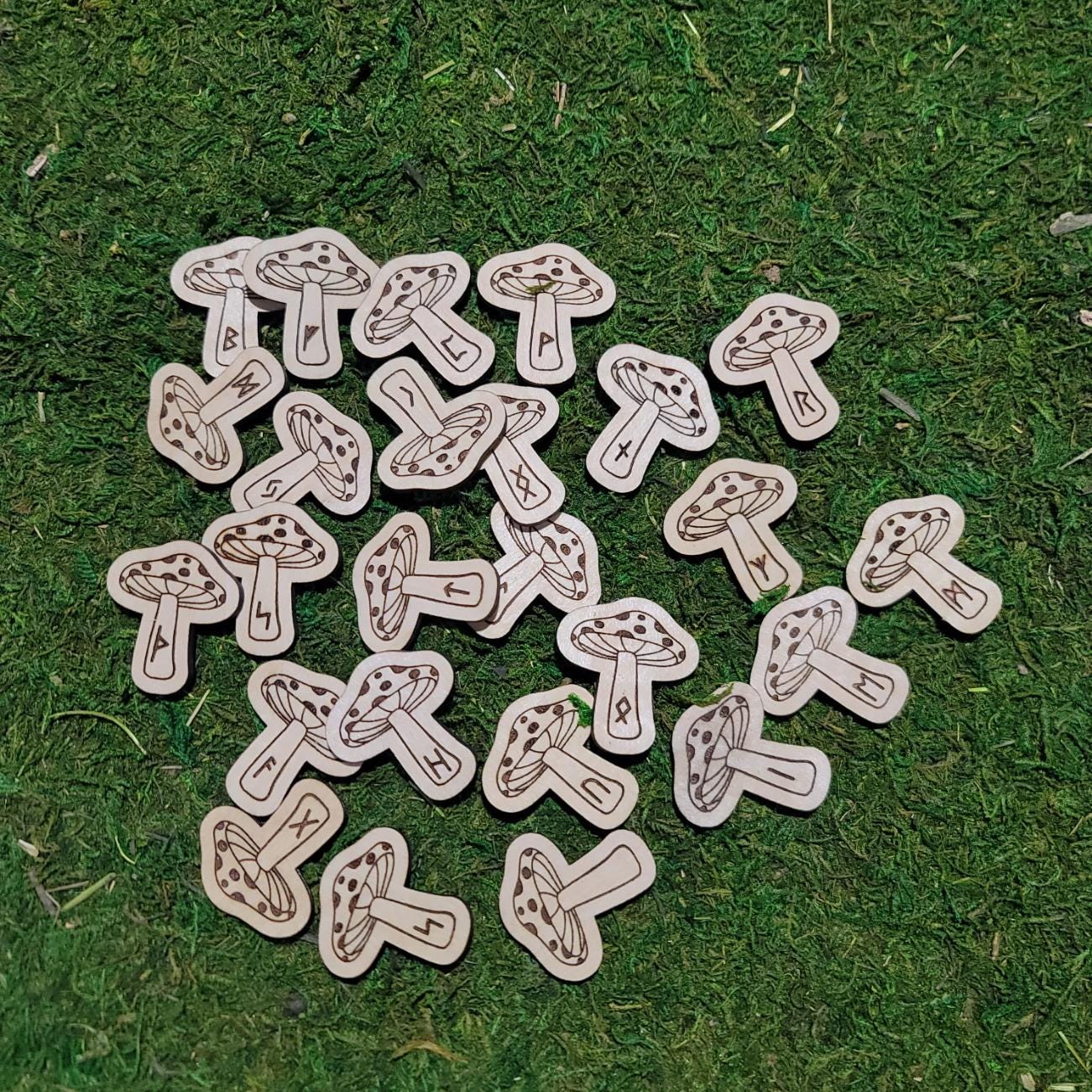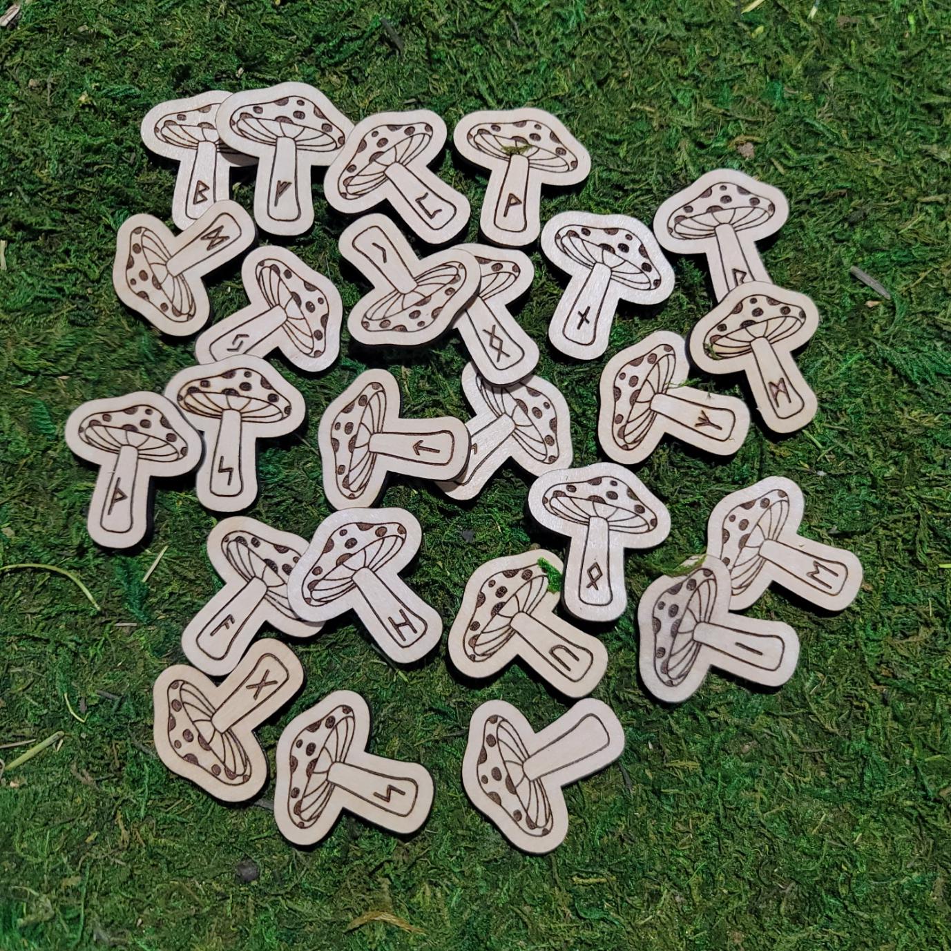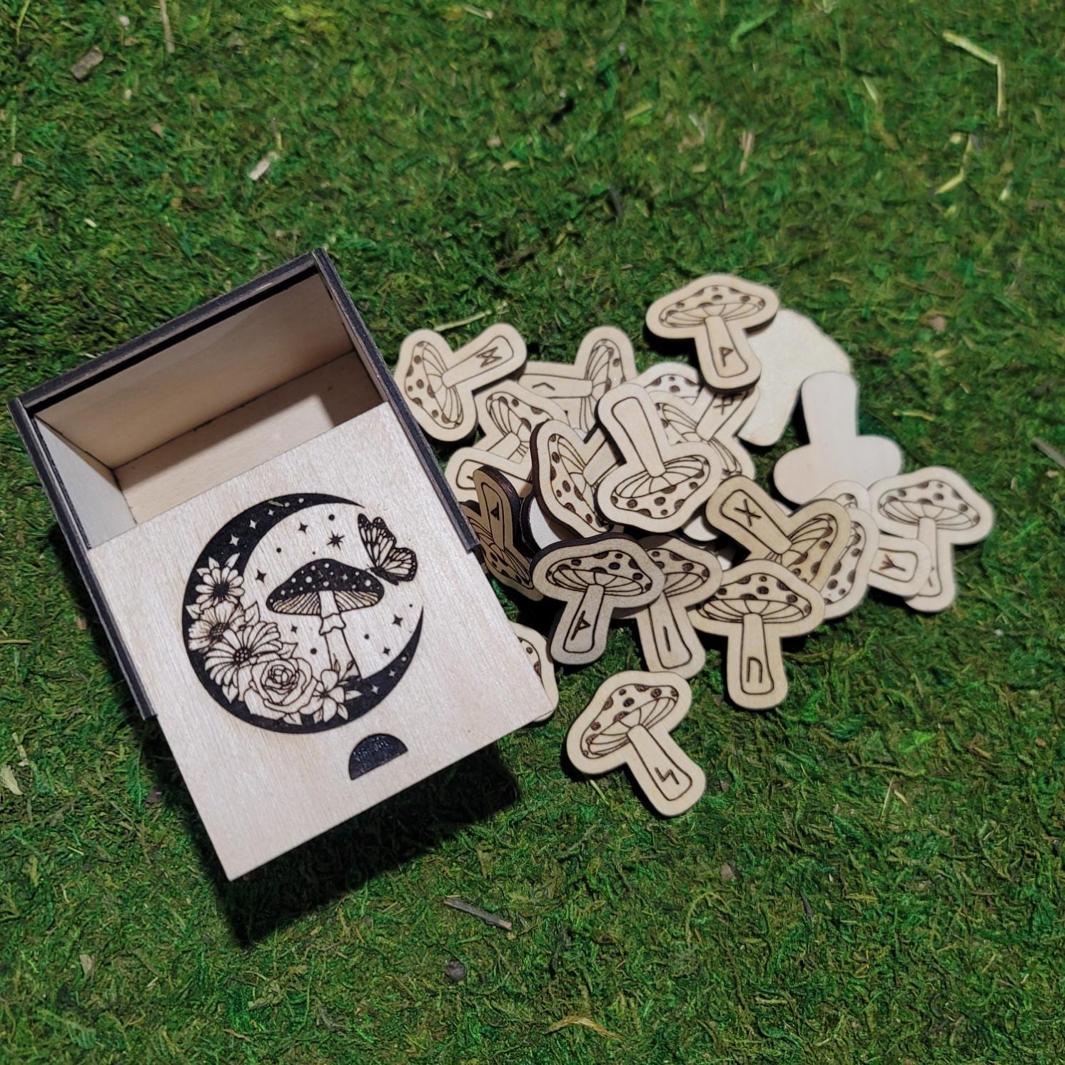 Unlock the ancient wisdom of the runes with this beautifully handcrafted set of Elder Futhark runes, uniquely shaped like whimsical mushrooms and made from sustainably sourced 3mm Birchwood. Each rune is precision laser cut and engraved with care, ensuring clean lines, durability, and a natural charm that rune lovers, witches, and collectors alike will adore.
