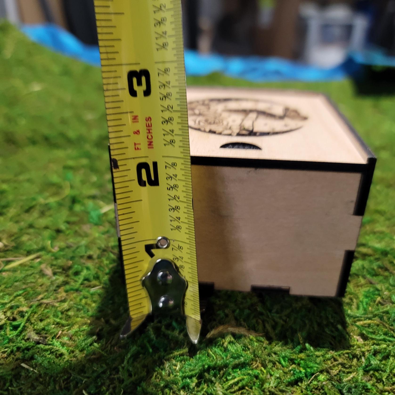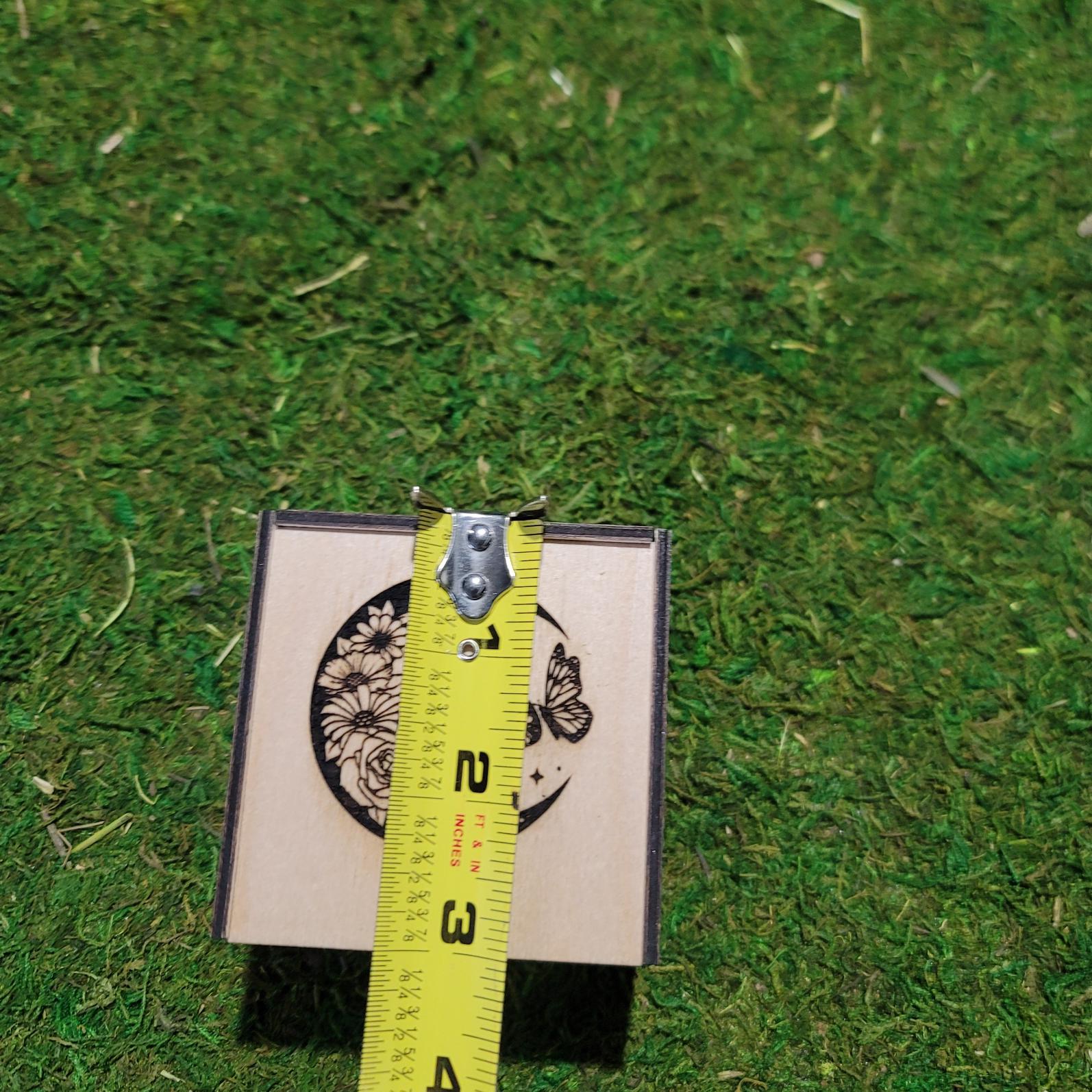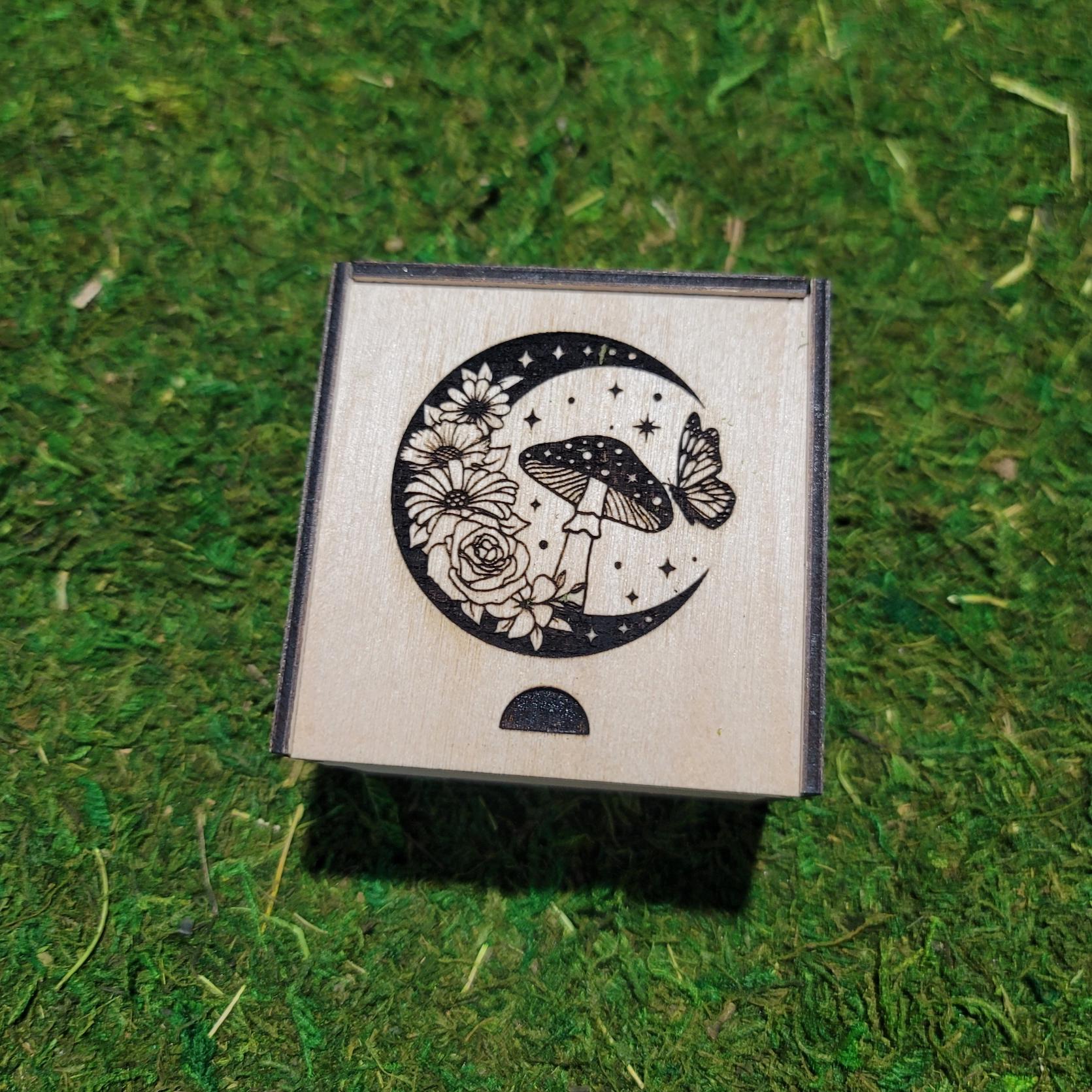 Comes with a matching 3"x3"x2" wooden box, also laser cut, for stylish and safe storage