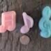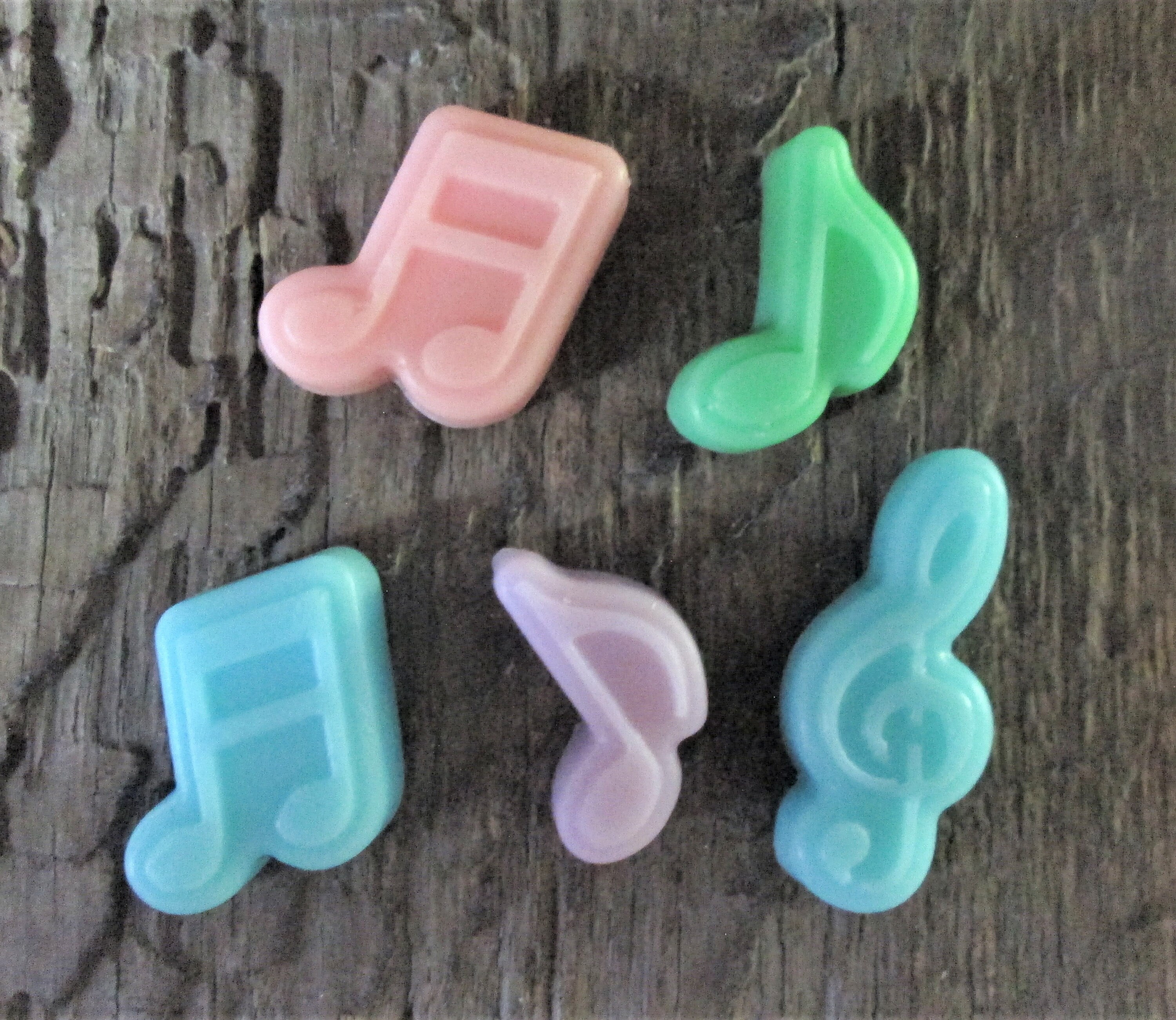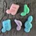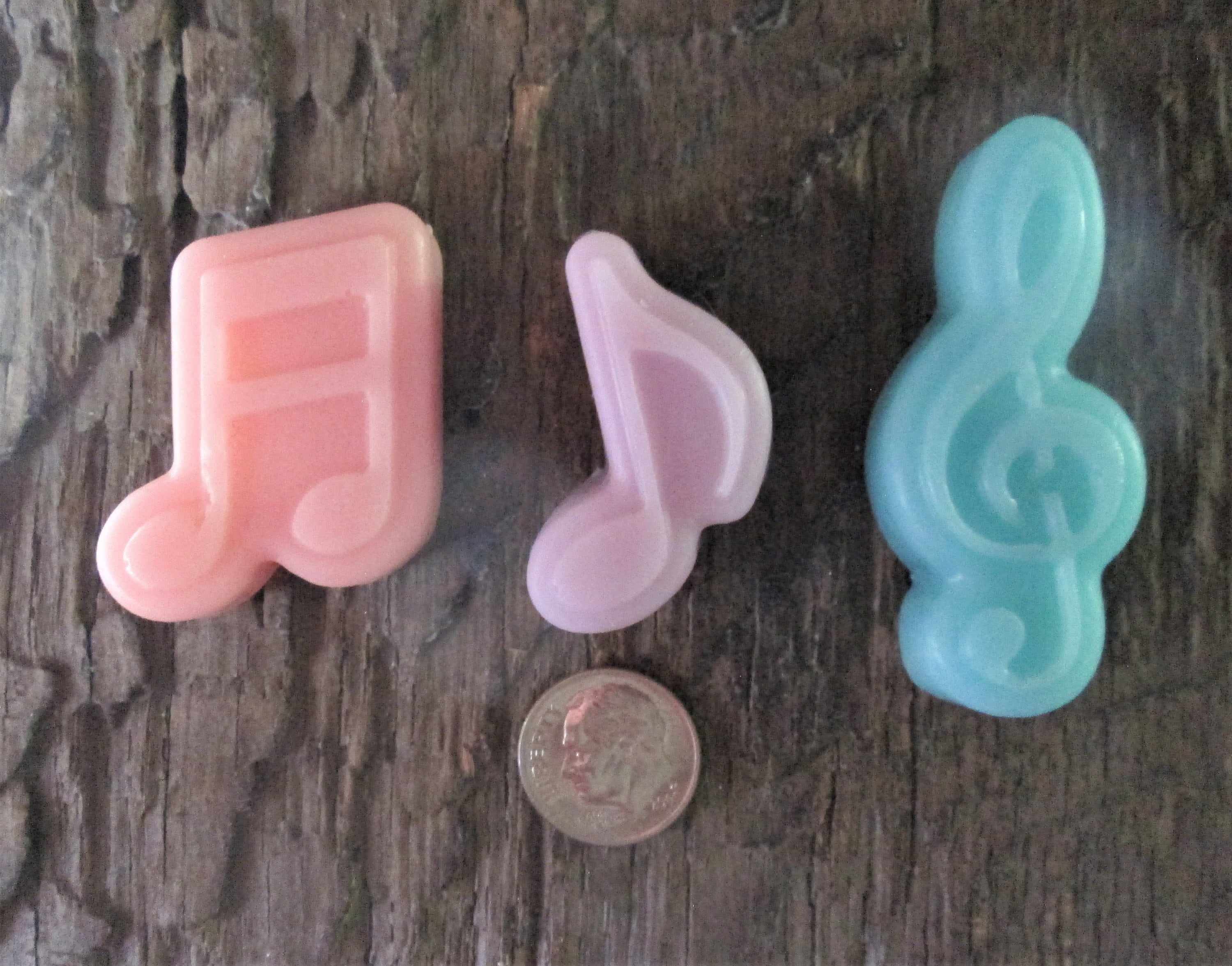 Each set features handcrafted music note soaps made with moisturizing shea butter. The small notes measure approximately 1¼ inches tall, and the treble clef measures 2 inches tall, with a total combined weight of 1.6 oz for 5 notes—just the right size for party favors and guest gifts.