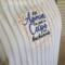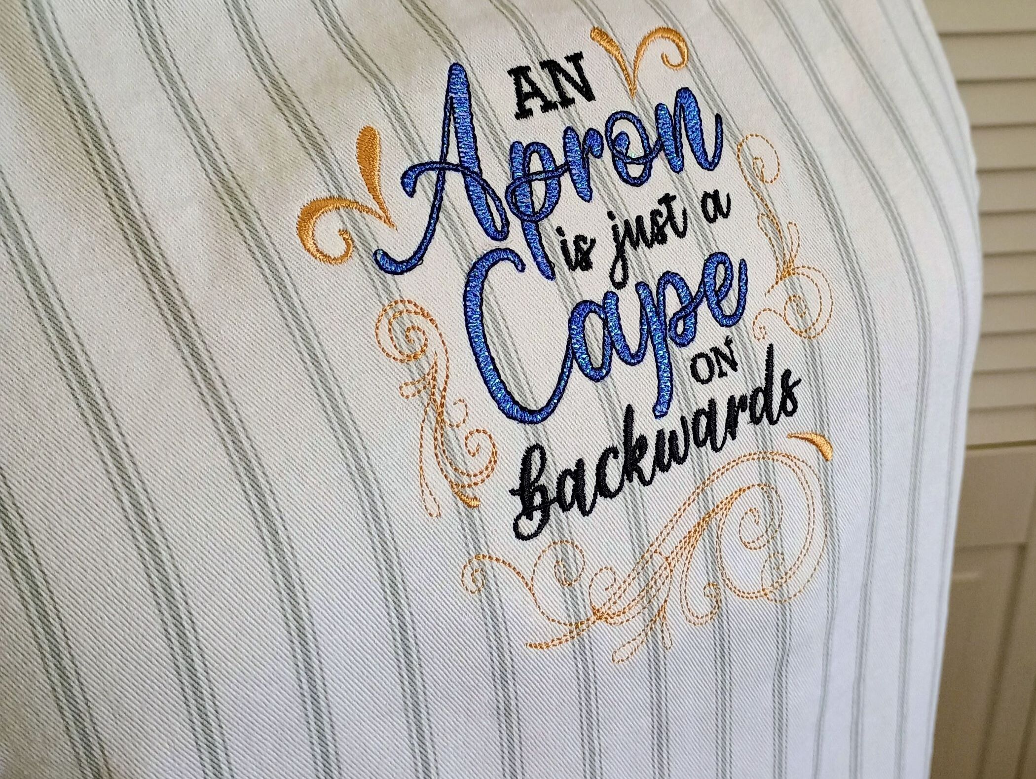This is a full apron with adjustable neck band and waist ties. It has been embellished with embroidery that includes mylar behind the stitches of the blue words. The sparkle is amazing. (check out the close up photos) This is safe for machine washing and drying. It will remain wash after wash, It has been enhanced with a pocket (approximately 15" wide, 8" deep) along the hip line. The pocket is sewn down the middle, allowing for storage of different items. The pocket fabric is a great accent to this apron.