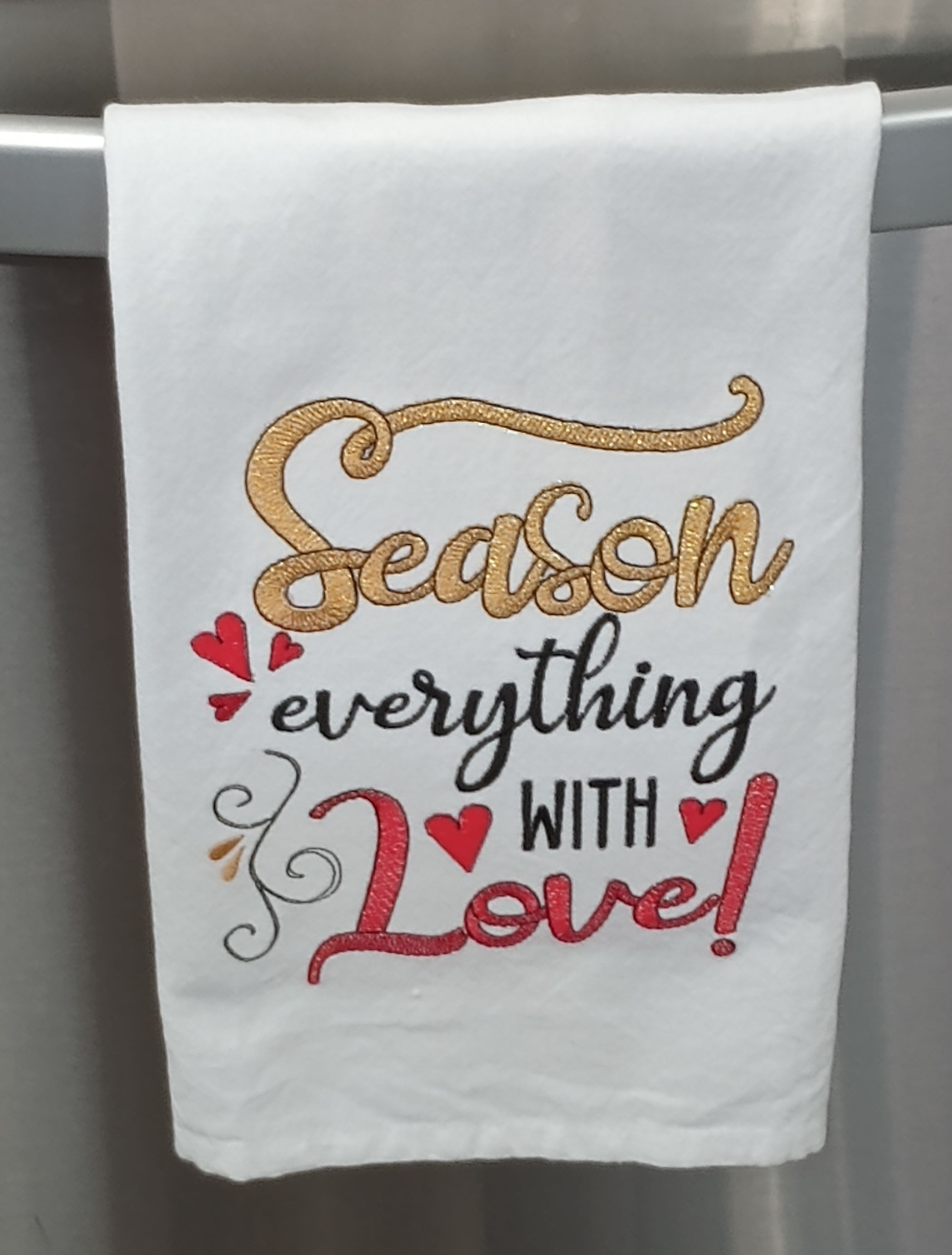 The poly/cotton kitchen towel has been embellished with machine embroidery. The design has been embellished using embroidery mylar so that it will sparkle.