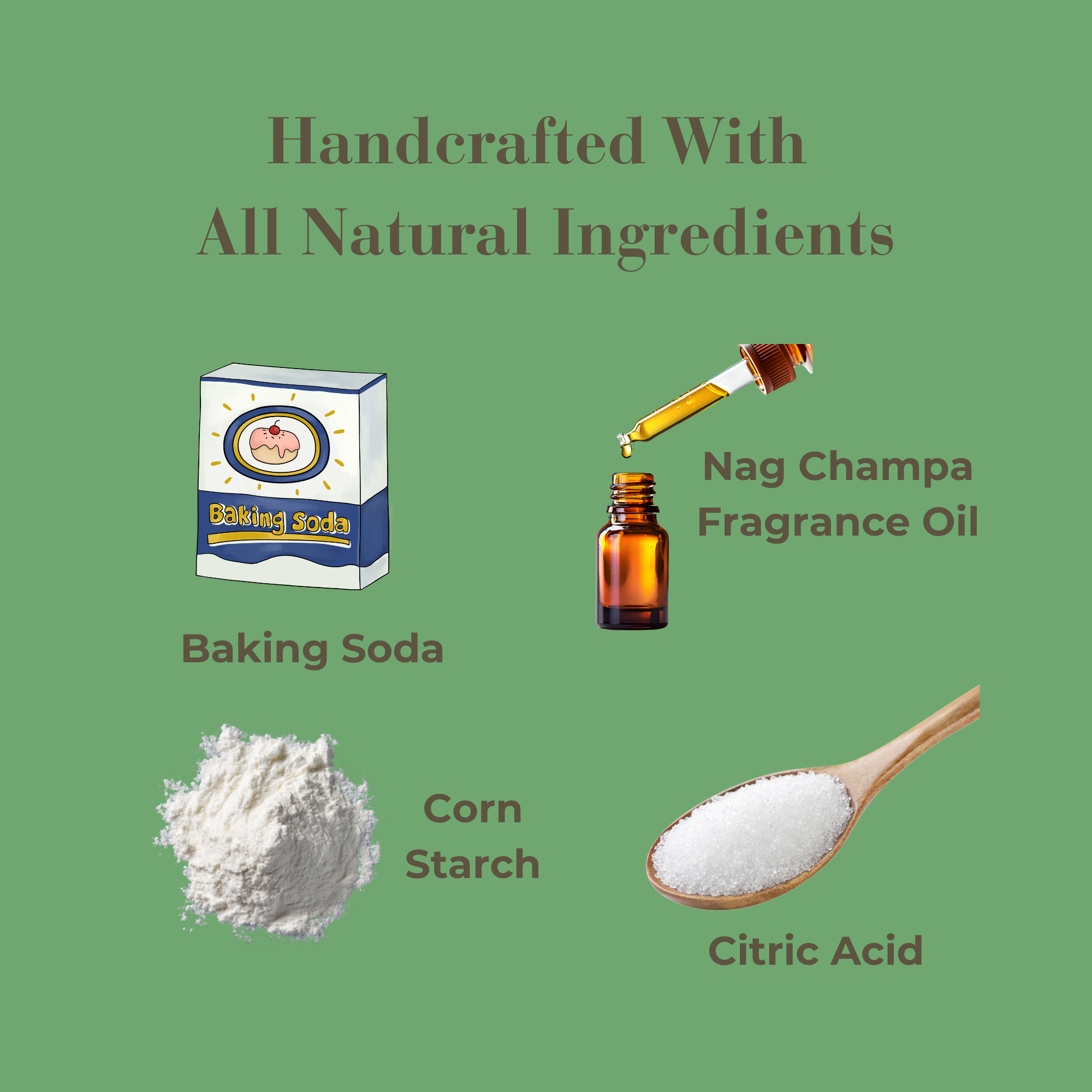 Ingredients: Baking Soda, Citric Acid, Corn Starch, Cosmetic Grade Mica, Nag Champa Fragrance Oil