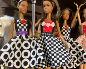 I tried to make my own doll clothes, but the accuracy was just not there yet. I finally started making doll clothes again in 2025 to see what I could create. I quickly discovered that Barbie has a different figure, so I started collecting modern dolls. I quickly realized my mom's old patterns were not going to fit. So I started with two new patterns, and now I design my own patterns. I had to really focus on the seams and details, because they are so tiny. What makes it fun is planning and designing each outfit, and choosing fabrics and embellishments.