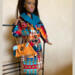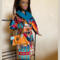 Colorful Native American print coat for Barbie and most 11½" fashion dolls. This handmade set includes the coat, flared jeans with orange top-stitching, and a fun handbag. The coat is lined in teal with an over-sized collar, and has belt-loops with a removable belt, and a snapped shoulder tab to secure the handbag. The cool designer handbag has a genuine leather strap. A unique gift for your Barbie lover!