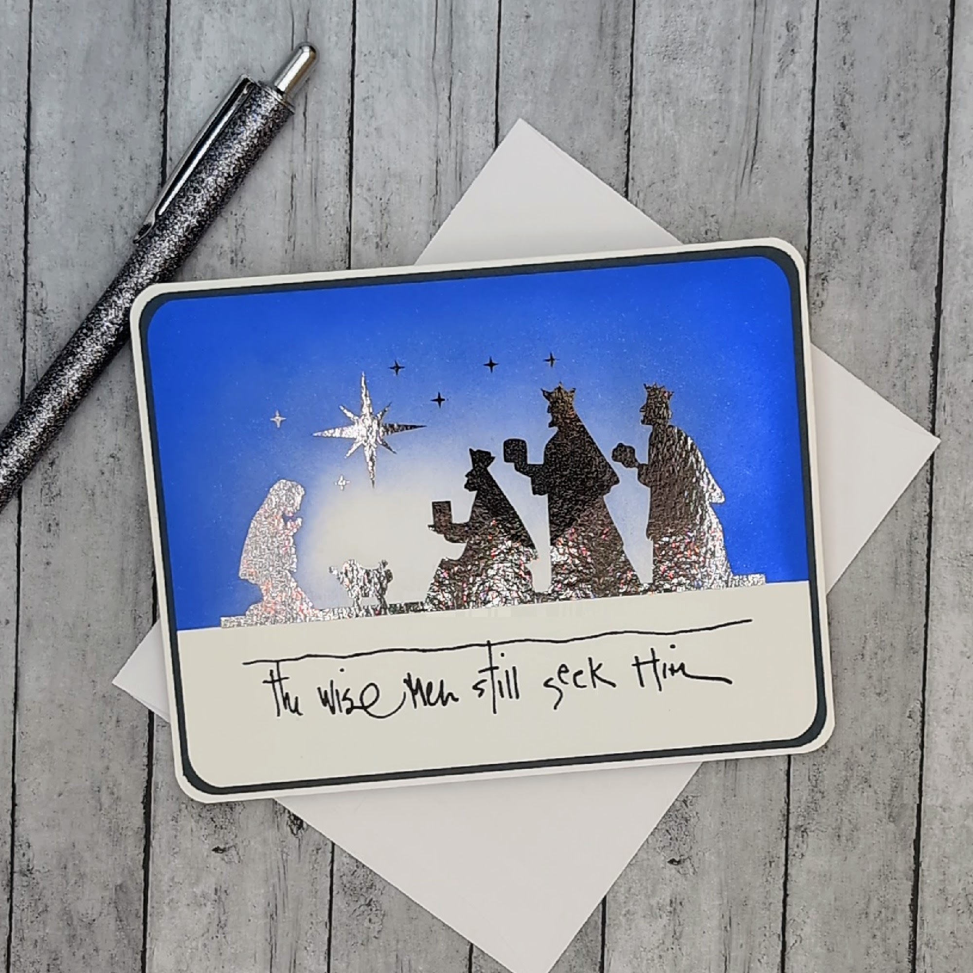 Celebrate the true meaning of Christmas with this handcrafted card featuring a peaceful nativity silhouette against a gradient blue background. The scene includes Mary, baby Jesus in the manger, and the three wise men bearing gifts beneath the Star of Bethlehem. The front reads “The wise men still seek Him” in elegant script. Blank inside for your personal message, this card offers a reverent, faith-forward way to share Christmas joy and spiritual reflection with loved ones