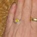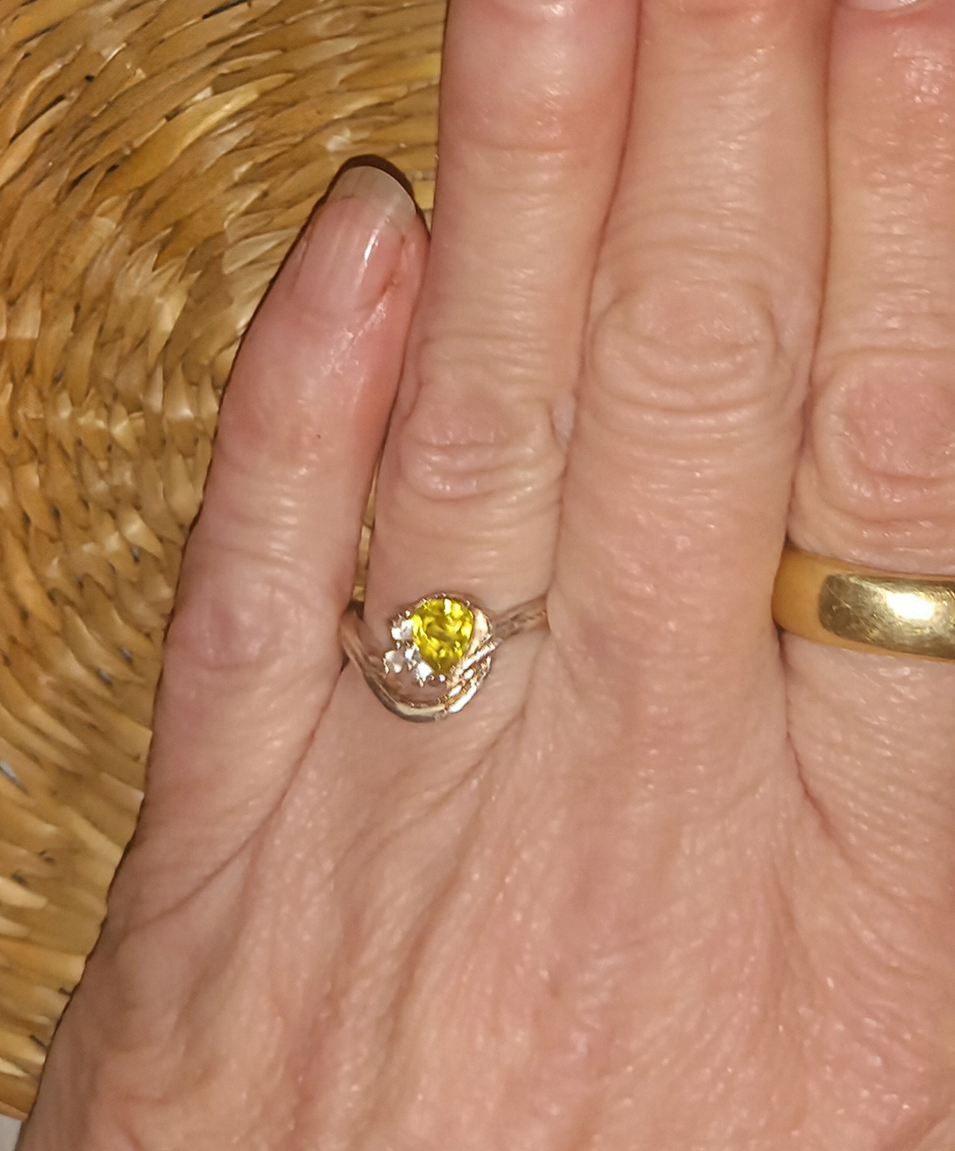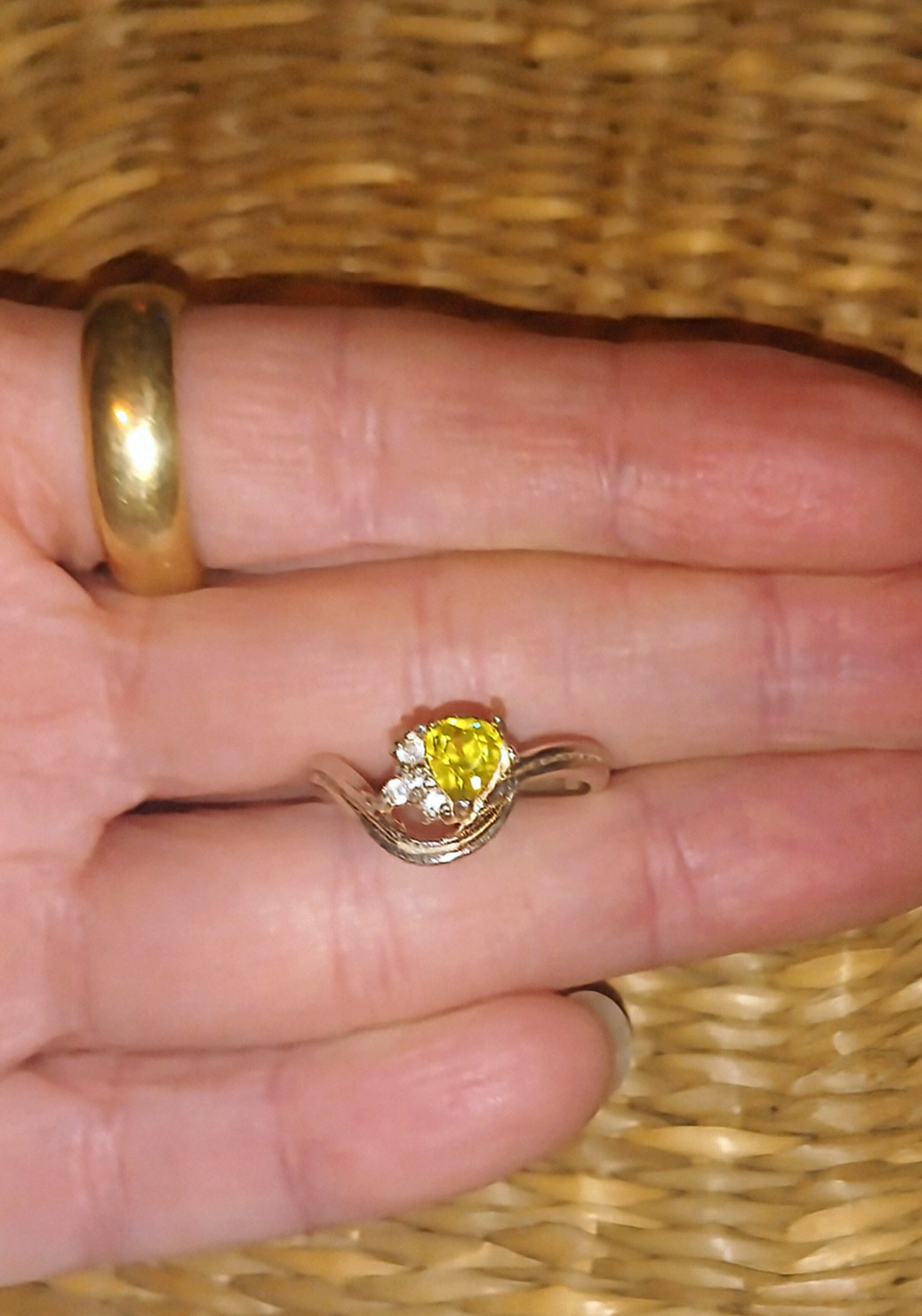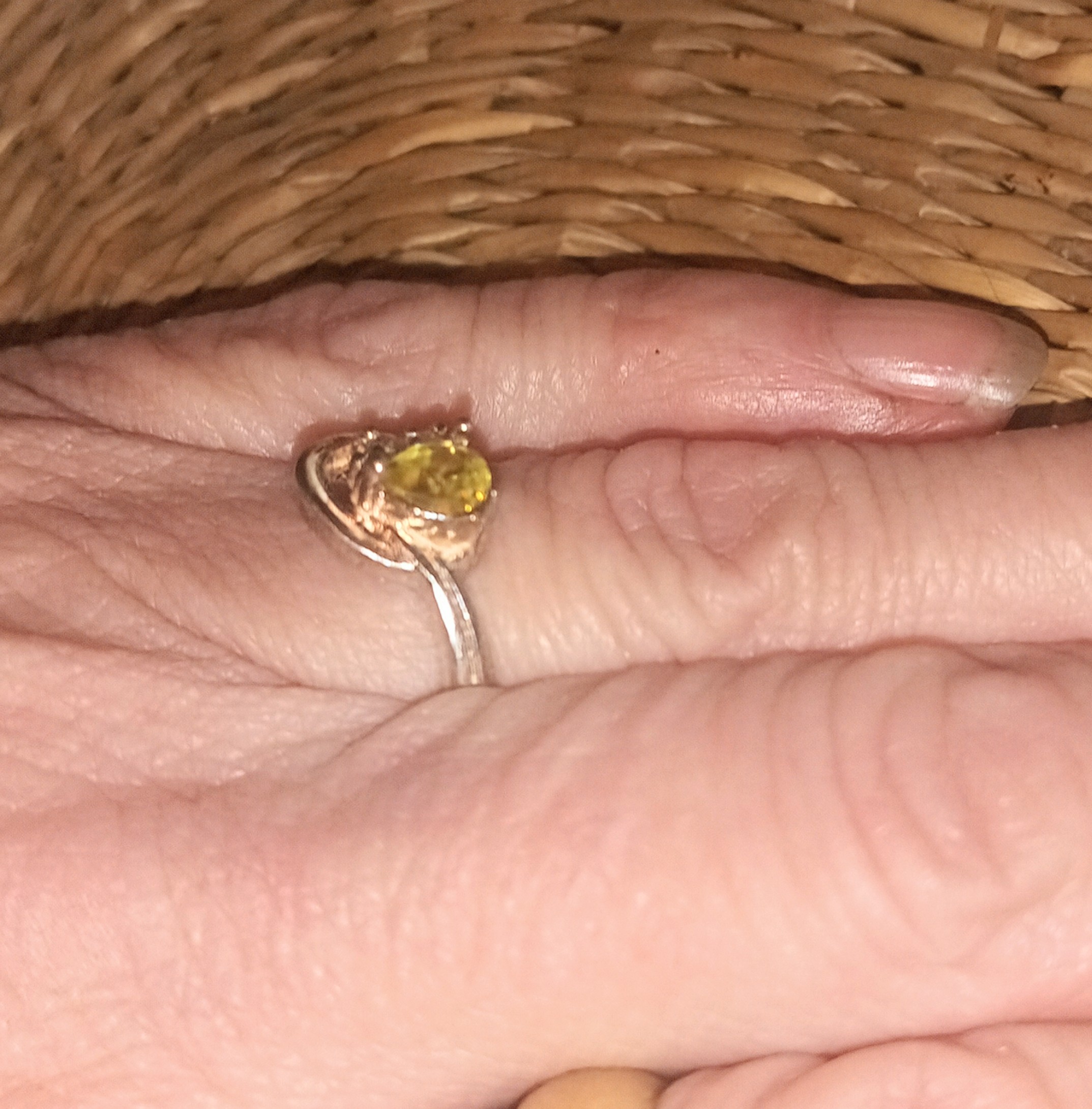 Gorgeous very rare natural chartreuse Spene/Titanite(.70ct, VS, USA) pear cut, hand set and accented with white Diamonds (.05ct, SI, Canada ) in a classic 925 sterling silver engagement ring. Sphene has a higher refractive index then Diamonds, the means more fire. So if you want the most sparkle for your buck, and a gem that's actually rare (Diamonds are actually very common, and controlled by a cartel.) buy sphene.Sphene is a very rare brilliant yellowish-green, green, orange or brown gemstone with a high lustre, also known as "titanite" due to its titanium content. The name "sphene" comes from the Greek word, "sphen", meaning "wedge", which alludes to the formation of its crystals. Due to its strong dispersion, when brilliant-cut, sphene can exhibit a fire similar to or surpassing that of a diamond. Sphene has been known since 1787 and was named according to its titanium content in 1795 by Martin Klaproth. In 1801, it was given the name "sphene" by French mineralogist, Rene Just Hauy. In 1982, the International Mineralogical Association Commission on New Minerals and Mineral Names (CNMMN) decided to use the name "titanite" rather than "sphene". However, both "sphene" and "titanite" continue to be recognized in mineralogy circles, and sphene is the most frequently used gemmology term. Sphene is currently not being commercially mined and the supply is becoming increasingly hard to find. This item can be made with other natural Gemstones, convo for availability, and pricing. This item can be precious metal wrapped, charges apply. Please ask questions. Size 6.5 can be resized COMES WITH JEWELERS REPORT